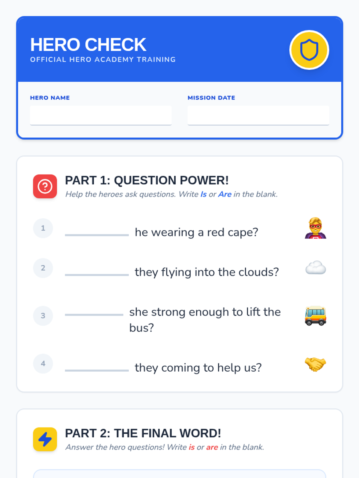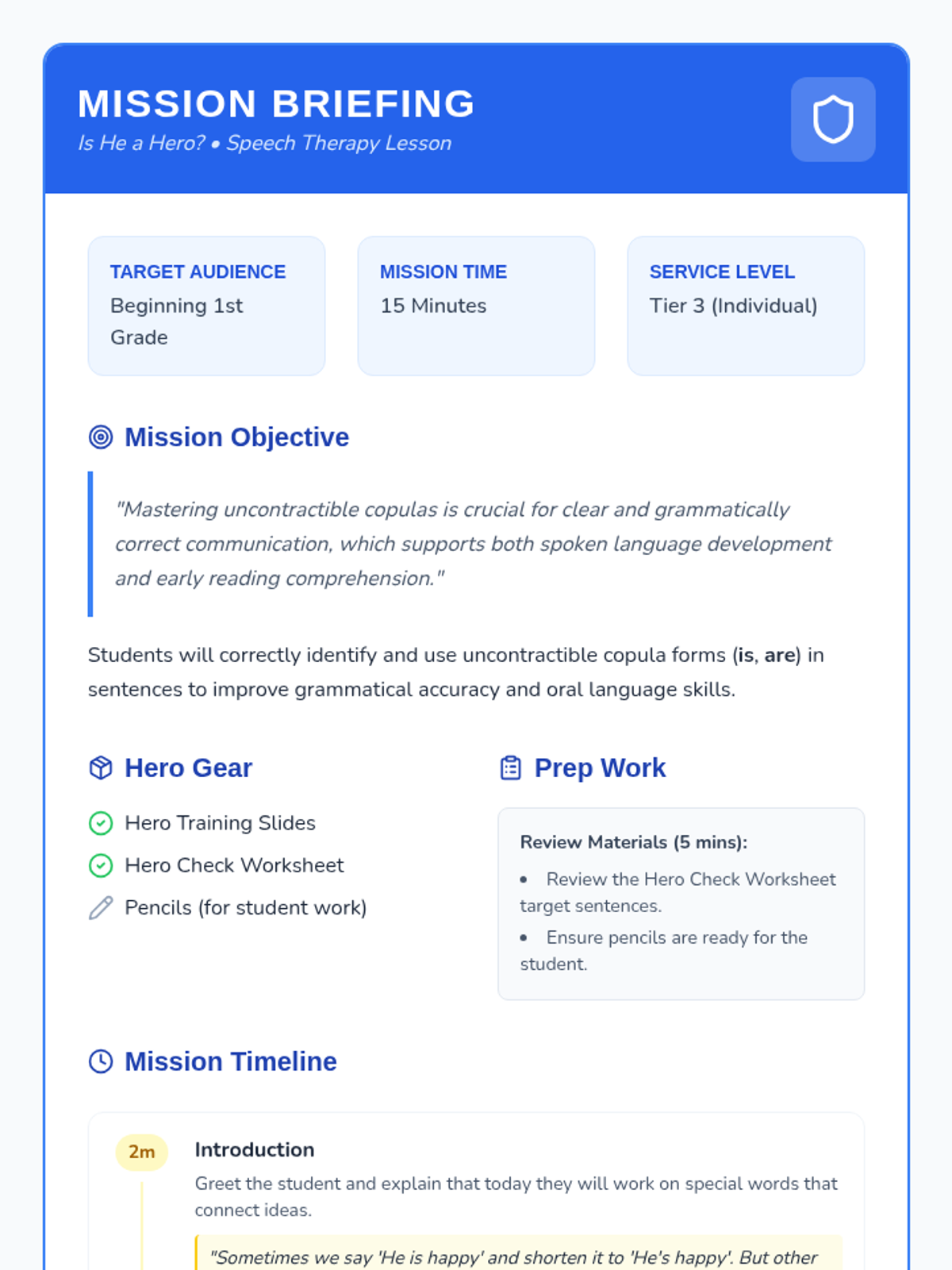 A 15-minute Tier 3 speech therapy lesson for first graders focusing on identifying and using uncontractible copula forms ('is', 'are') through a superhero-themed narrative.
