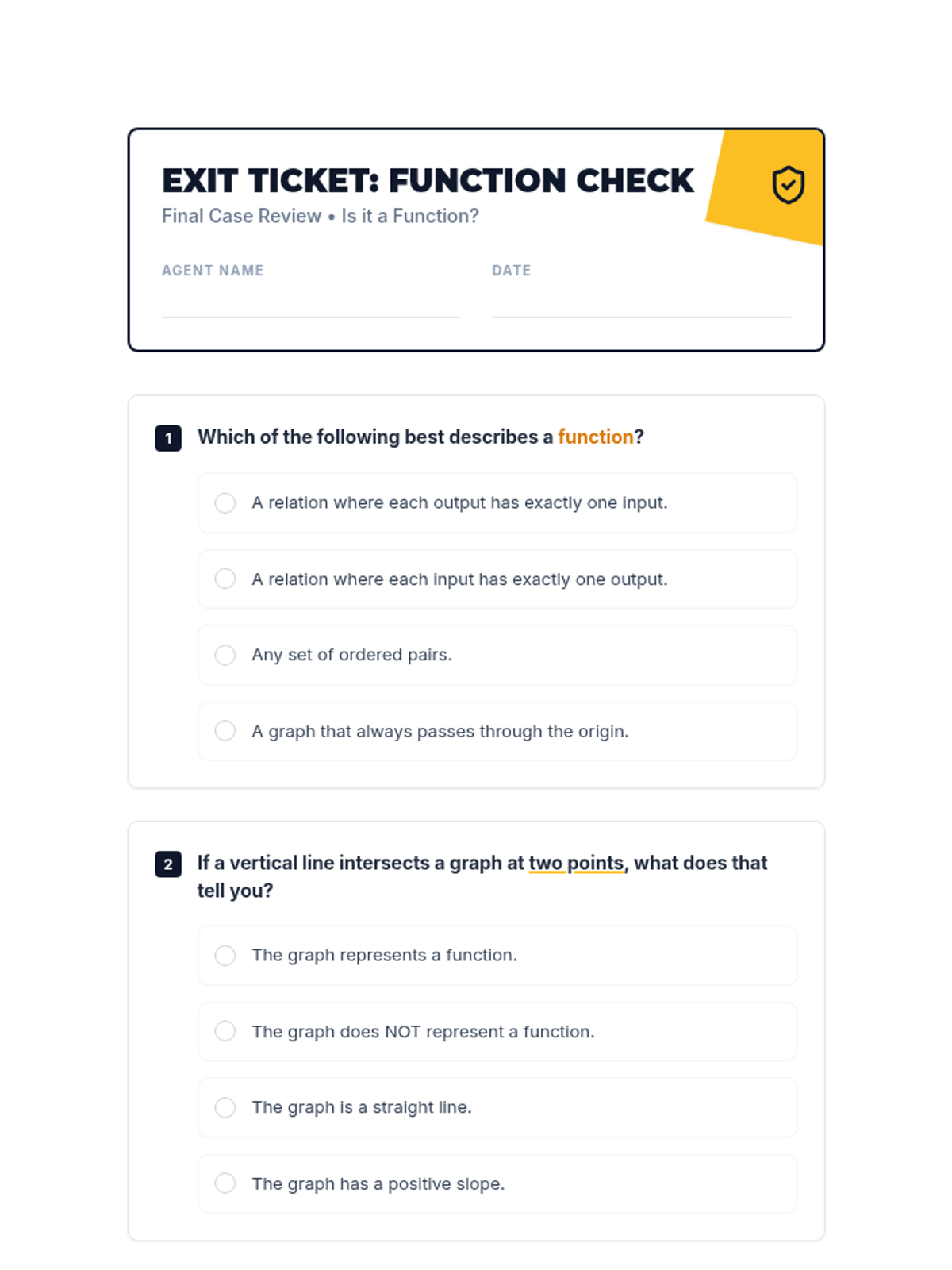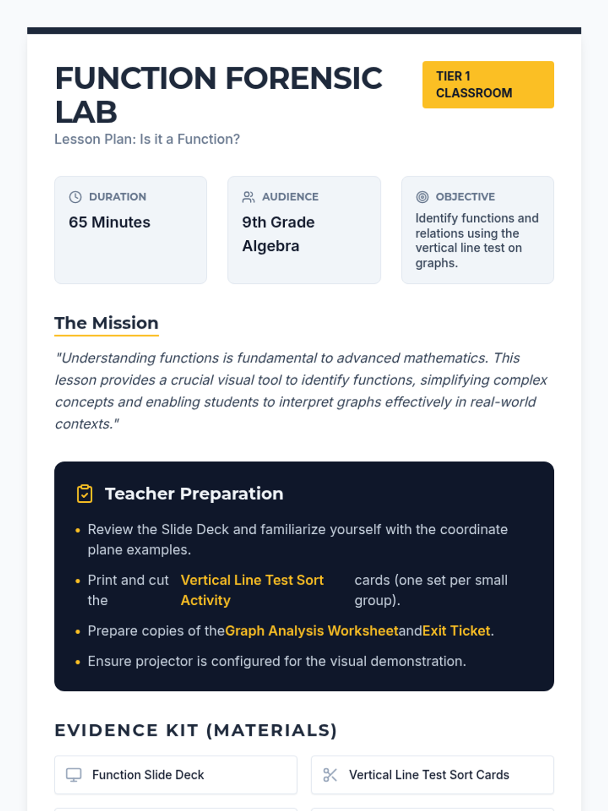 This lesson introduces 9th-grade students to the concept of functions and relations, focusing on how to visually identify a function using the vertical line test. Students will learn a practical skill for analyzing graphical representations in mathematics, preparing them for more complex algebraic concepts.