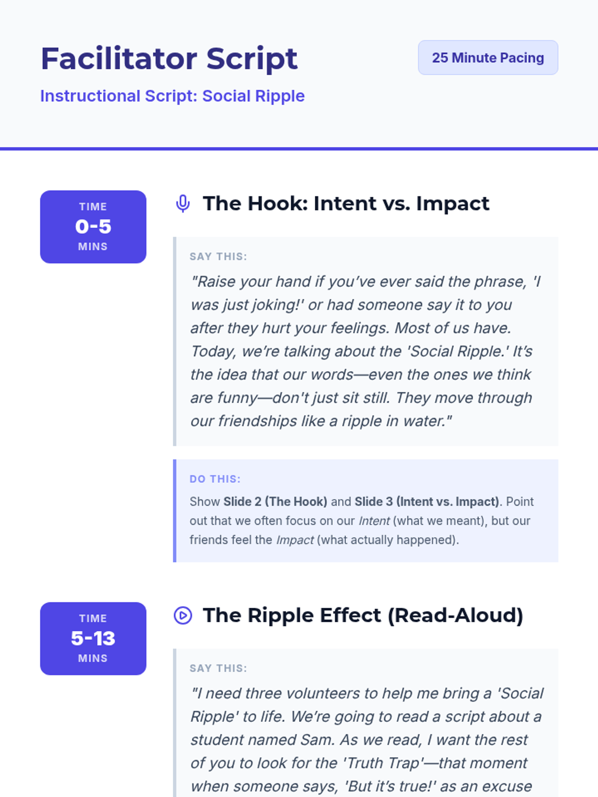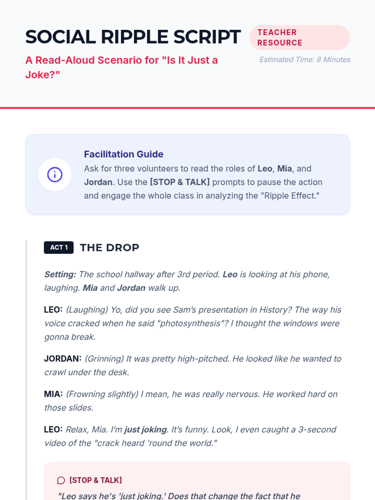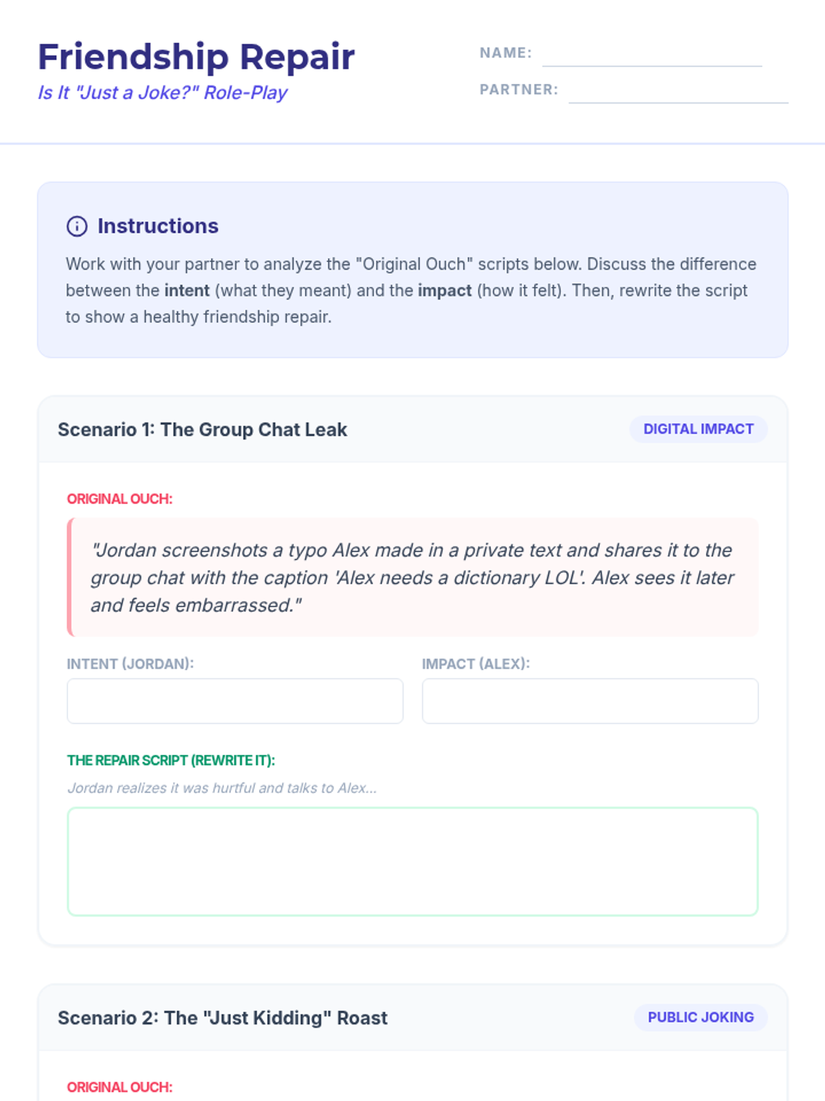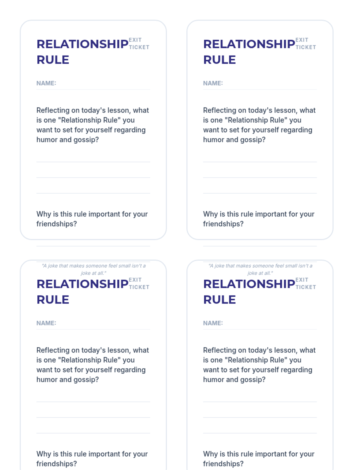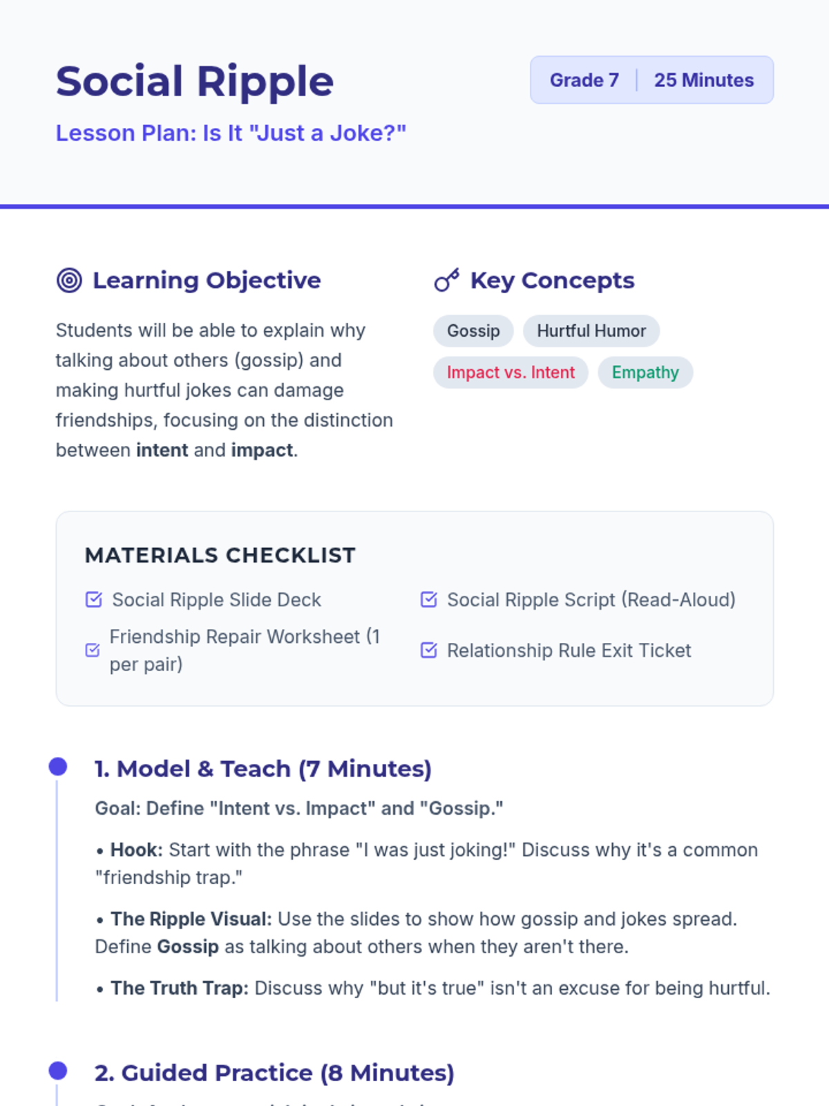 A 25-minute SEL lesson for 7th graders exploring the boundaries of humor, the harm of gossip, and the importance of impact over intent in maintaining healthy friendships.