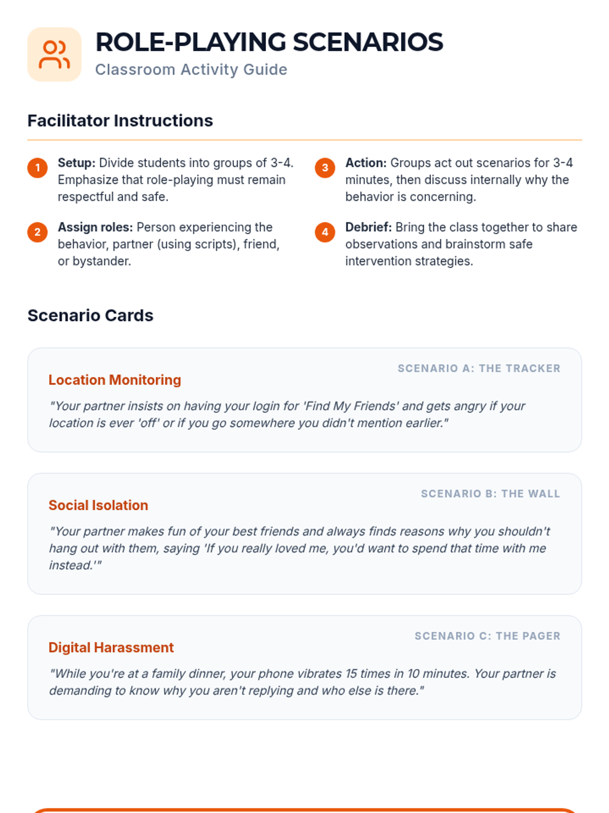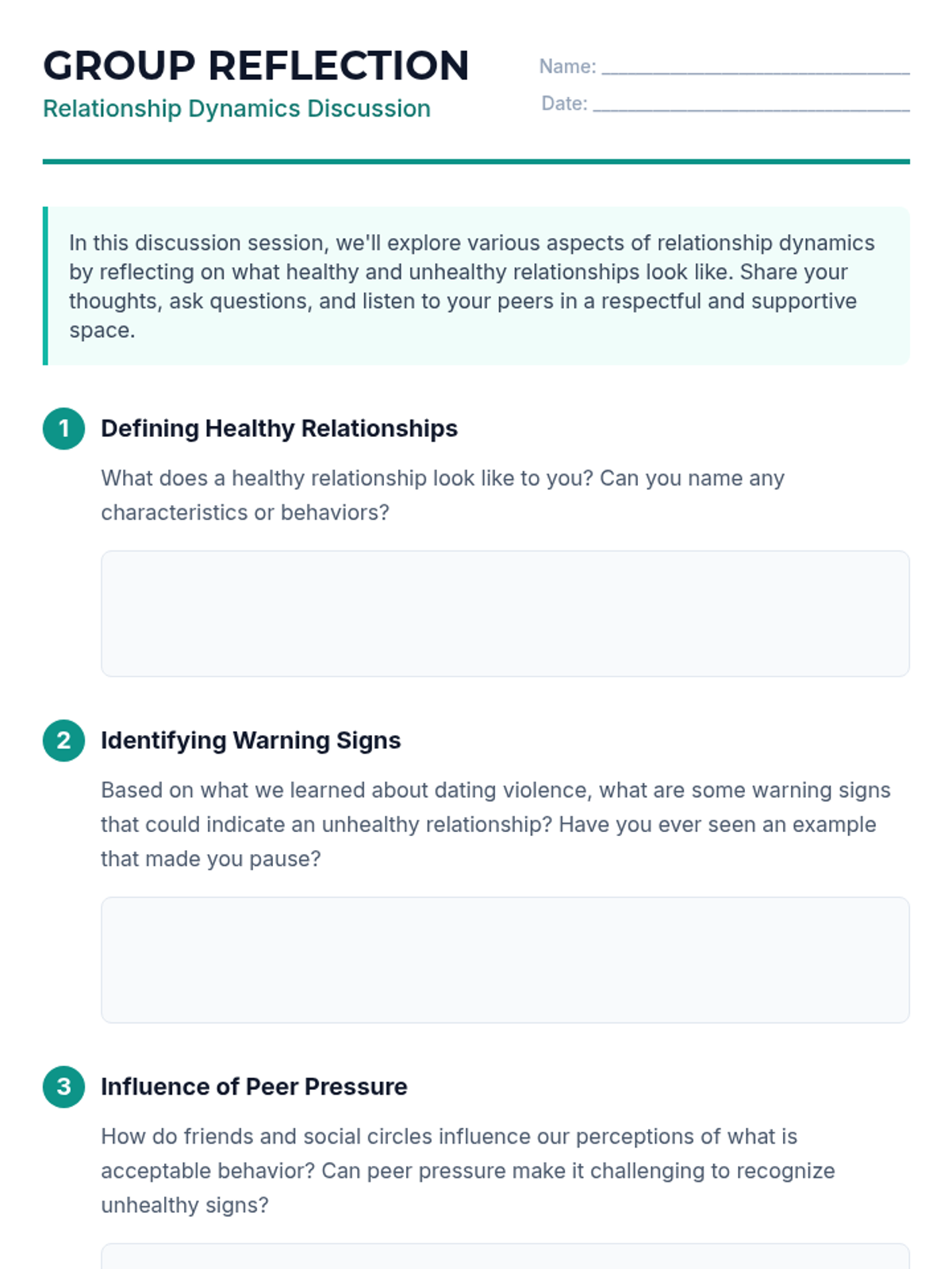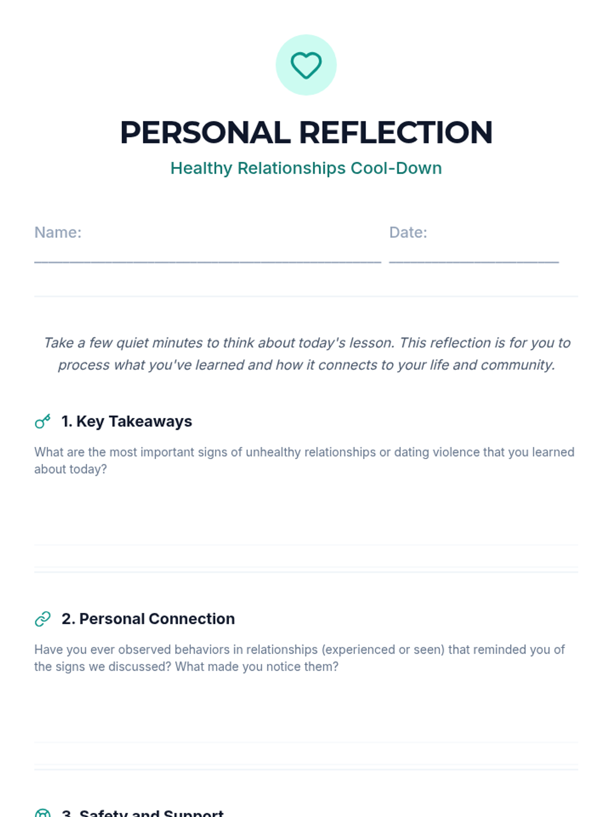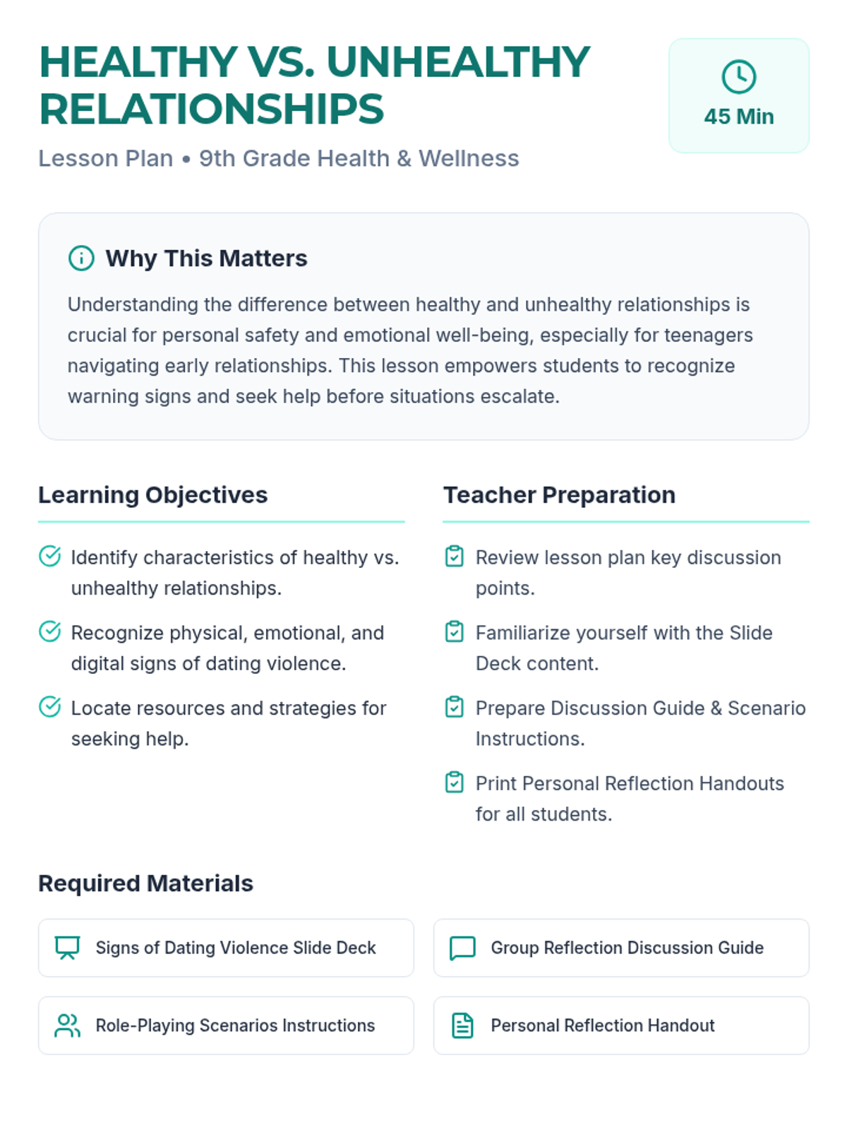 A 45-minute lesson for 9th graders to distinguish between healthy and unhealthy relationship dynamics, recognize signs of dating violence (physical, emotional, and digital), and identify resources for support.