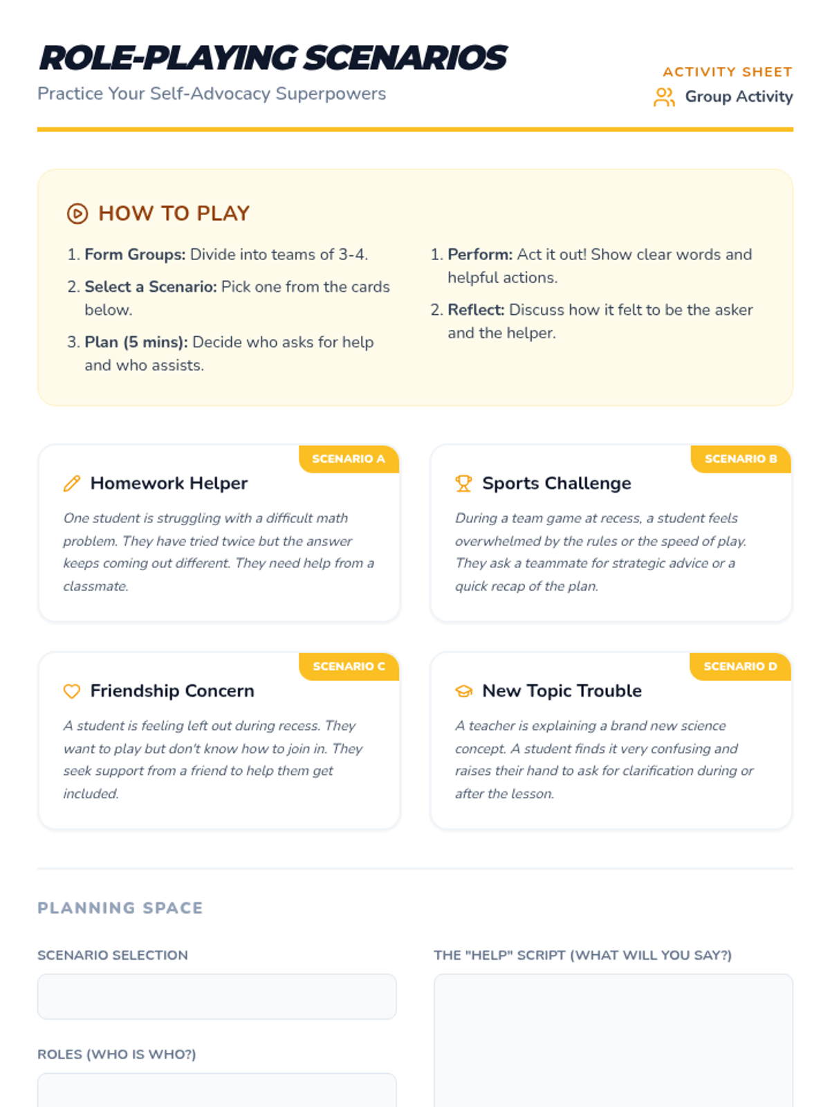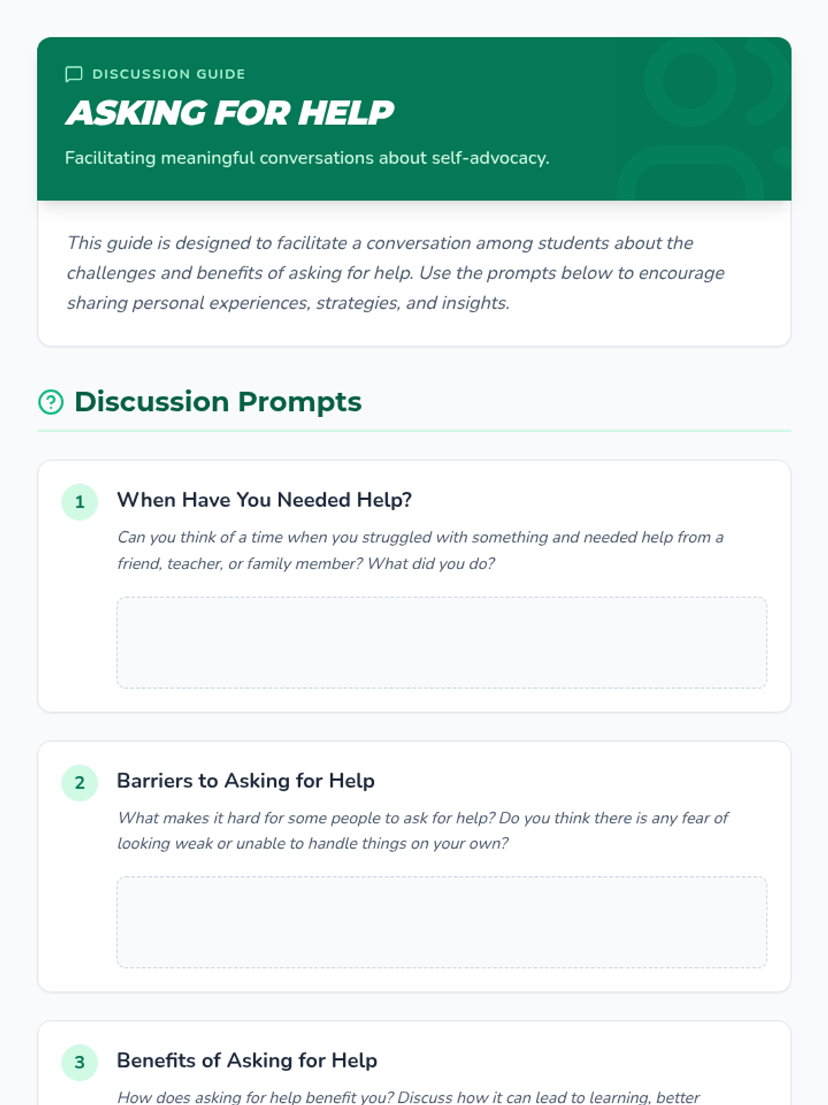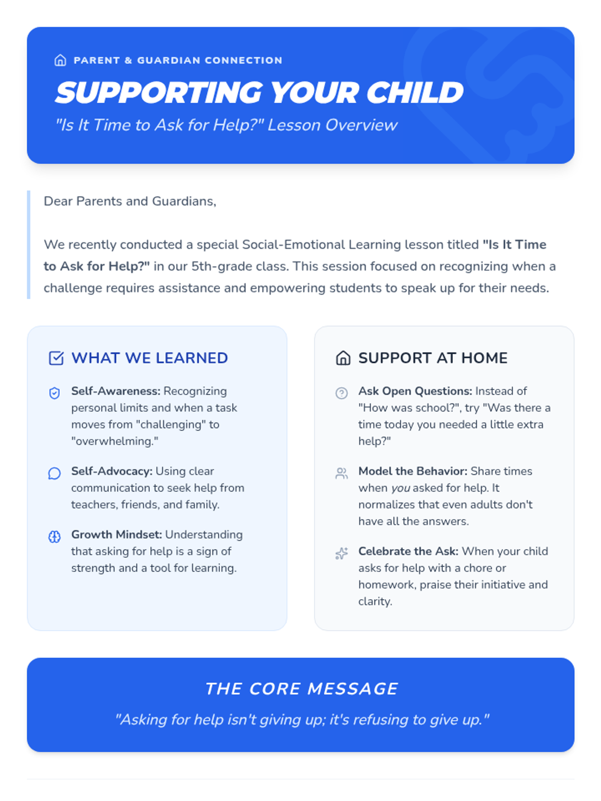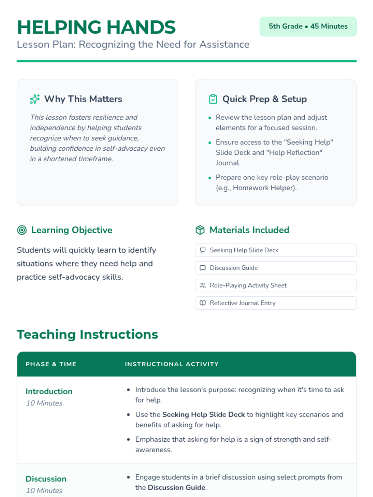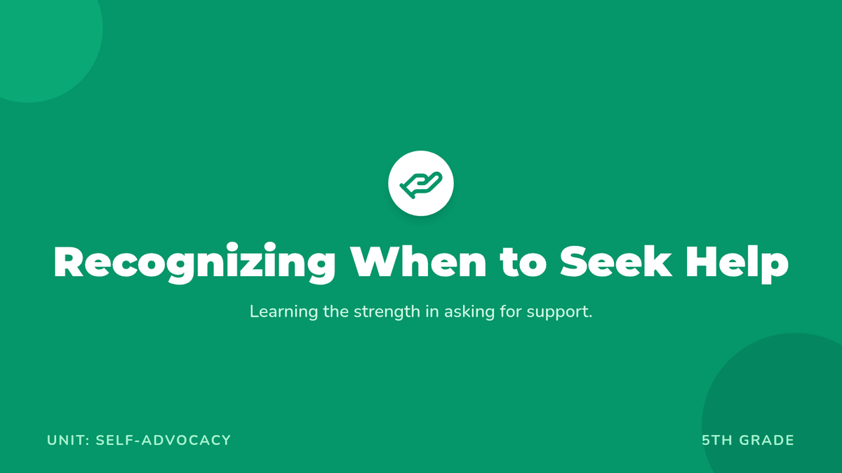 This lesson helps students recognize situations where they might need assistance, emphasizing the importance of understanding personal limits and encouraging self-advocacy. Designed for a 5th-grade class, this lesson spans one session of 45 minutes.