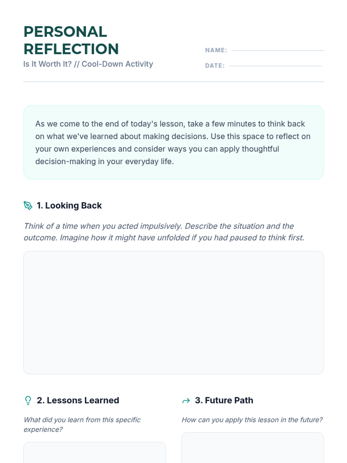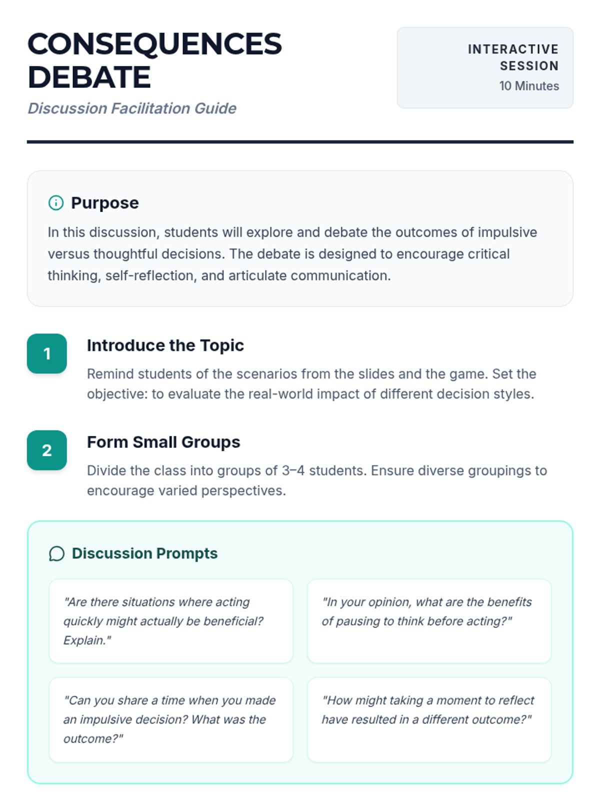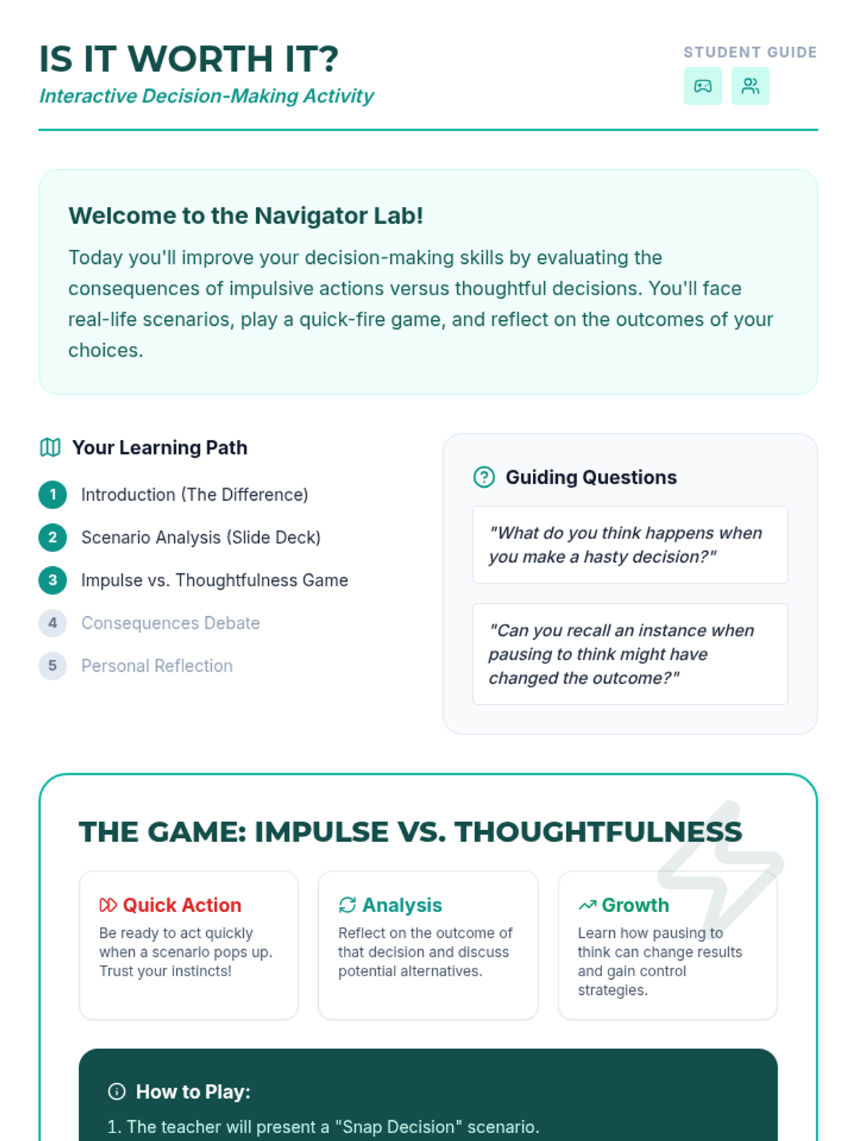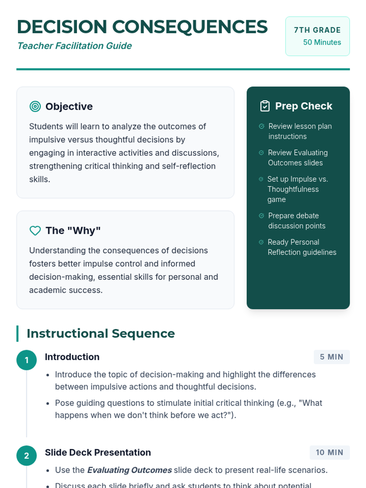 This interactive lesson challenges students to evaluate the consequences of impulsive actions versus thoughtful decisions. It enhances critical thinking and self-reflection skills, essential for personal growth.