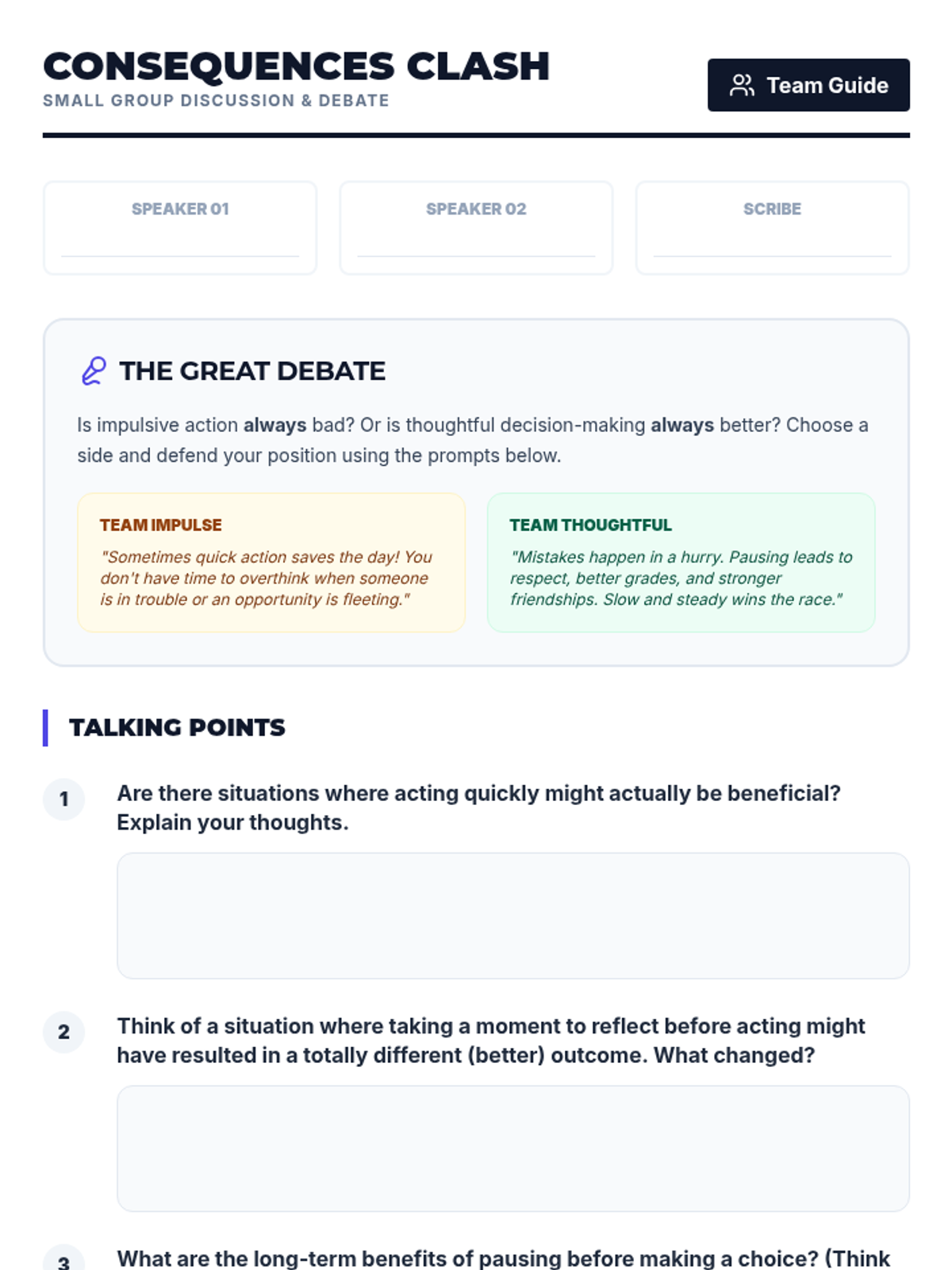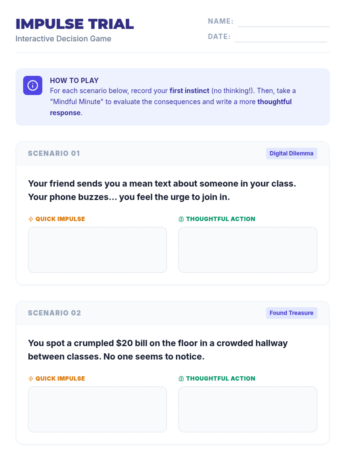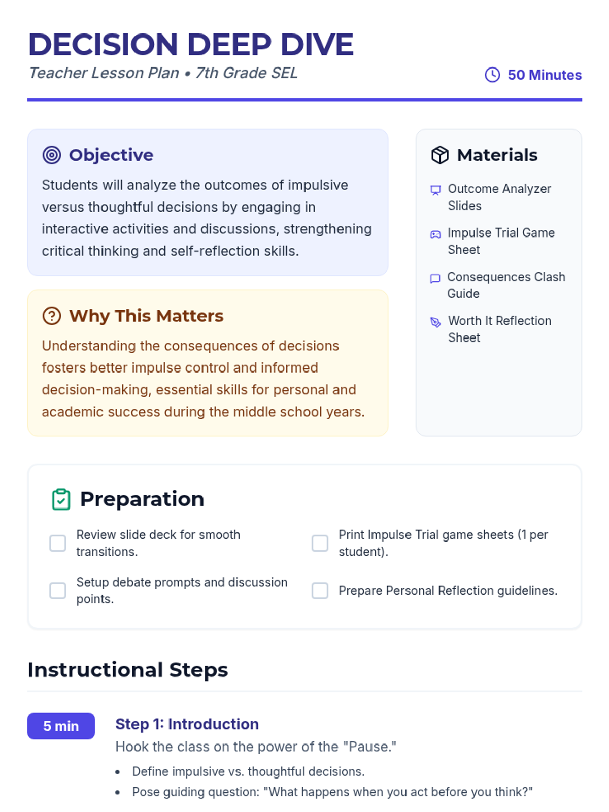 This interactive lesson challenges 7th-grade students to evaluate the consequences of impulsive actions versus thoughtful decisions through games, debates, and reflection.