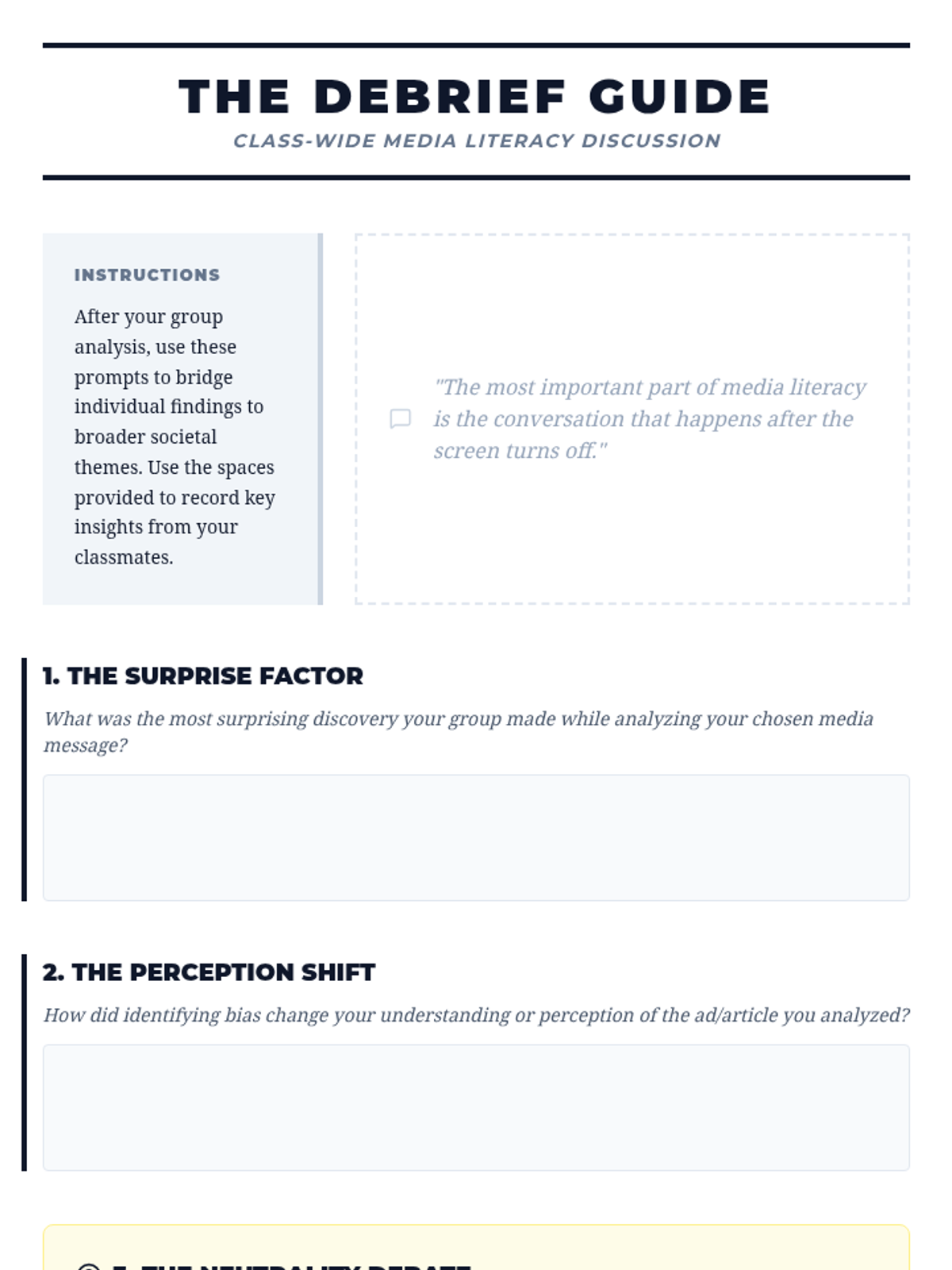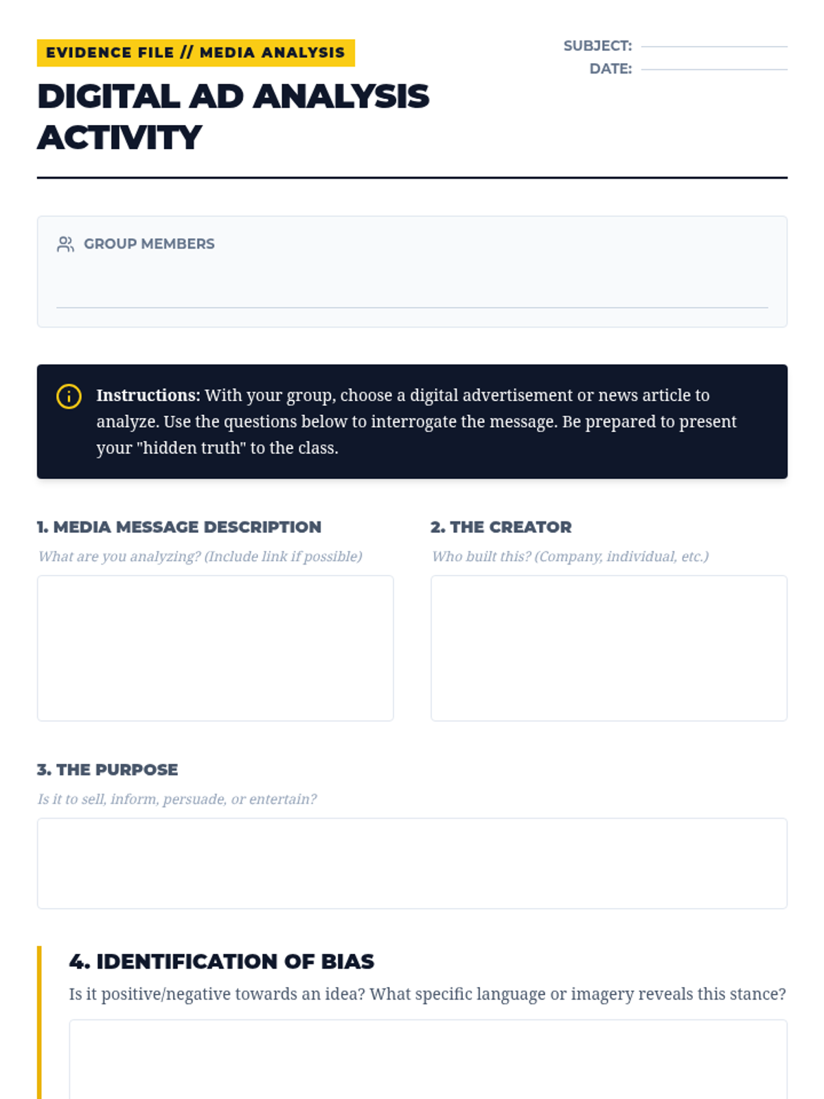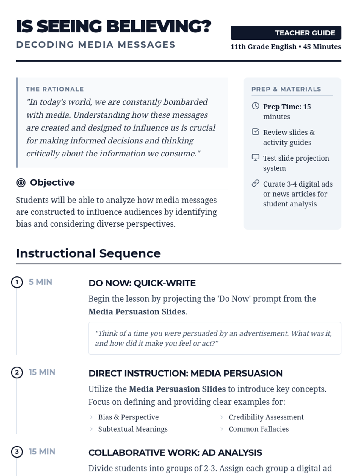 A 45-minute 11th Grade English lesson on media literacy, focusing on identifying bias, perspective, and subtext in digital advertisements and news. Students will develop critical analysis skills to navigate information-rich environments.