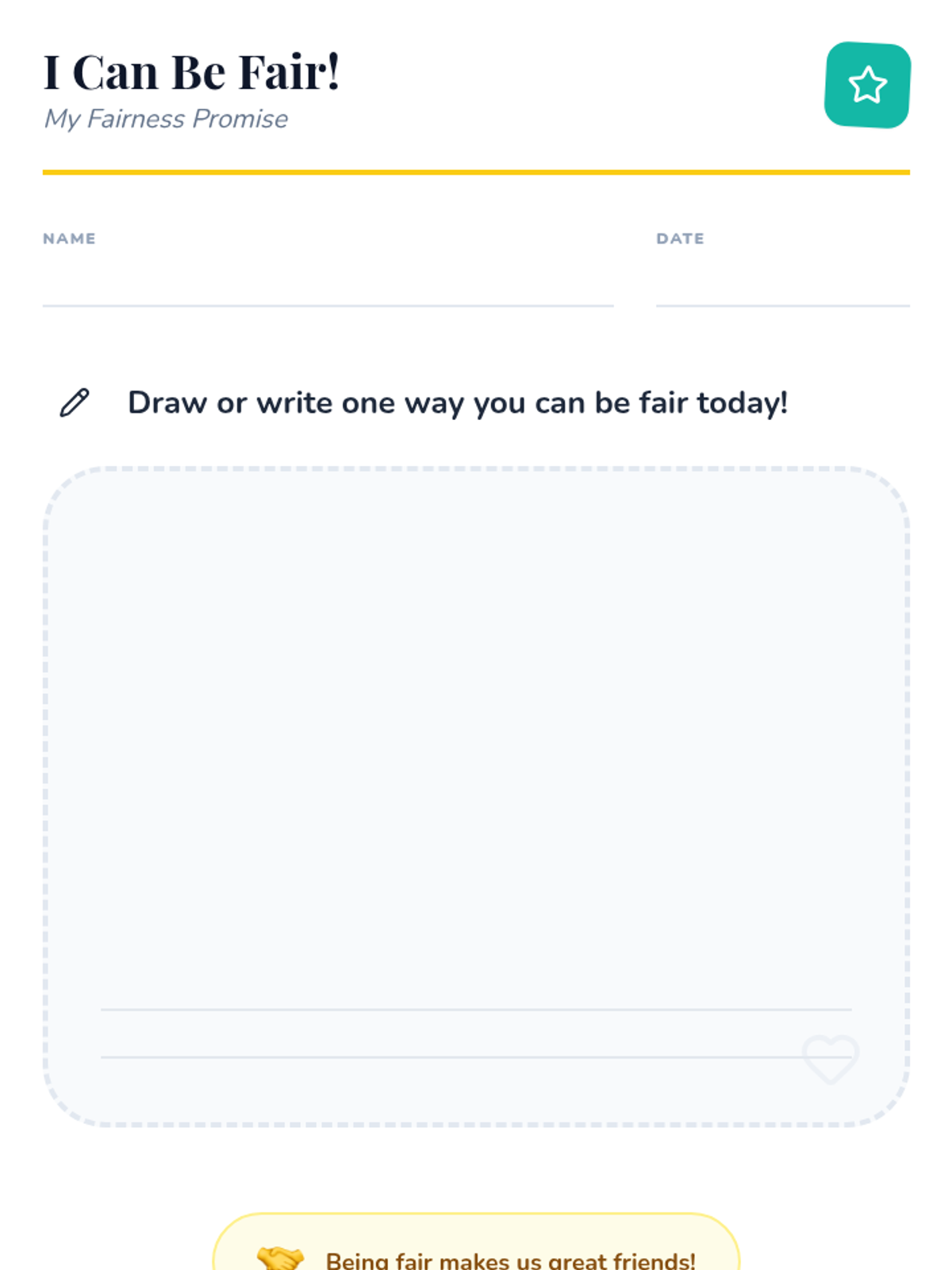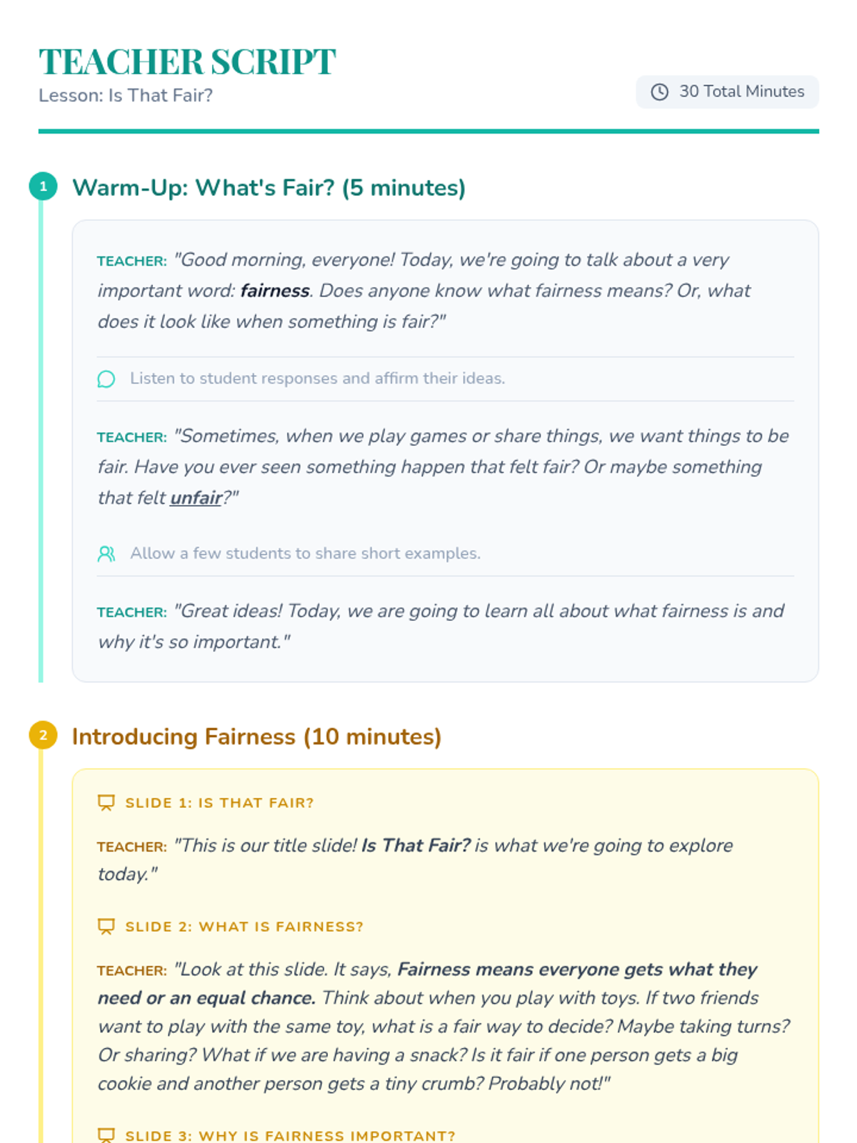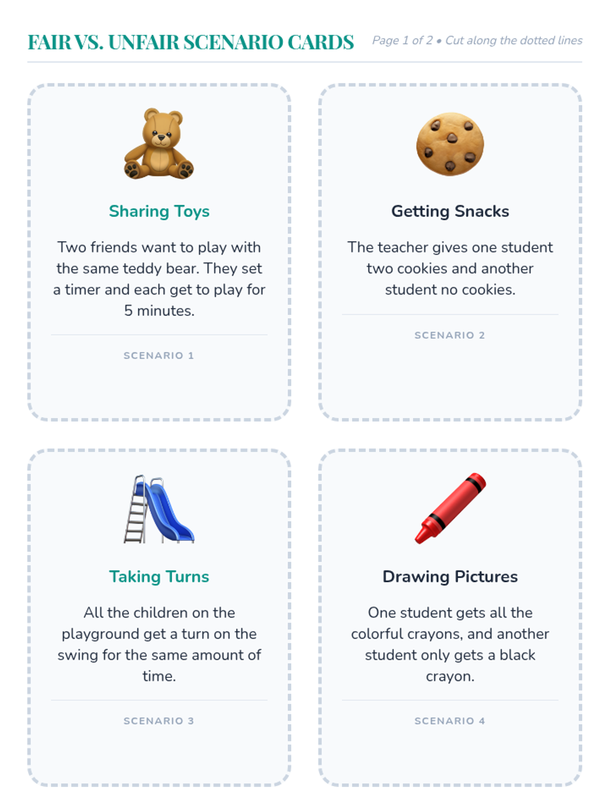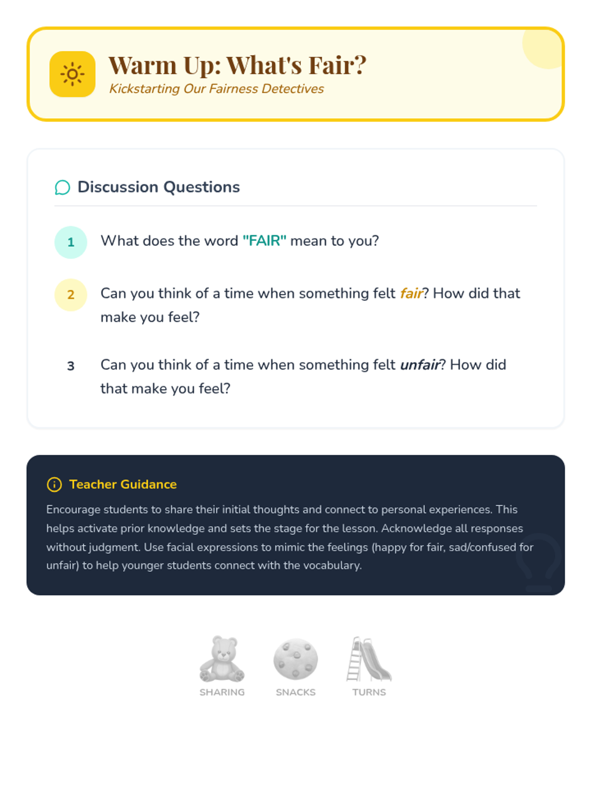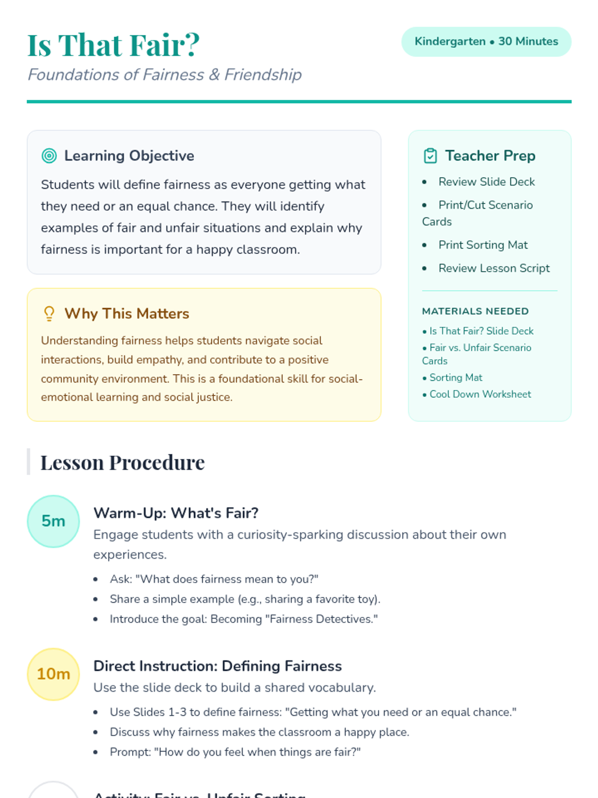 A foundational lesson for Kindergarten students to explore the concept of fairness, identify fair vs. unfair situations, and understand the importance of sharing and taking turns.