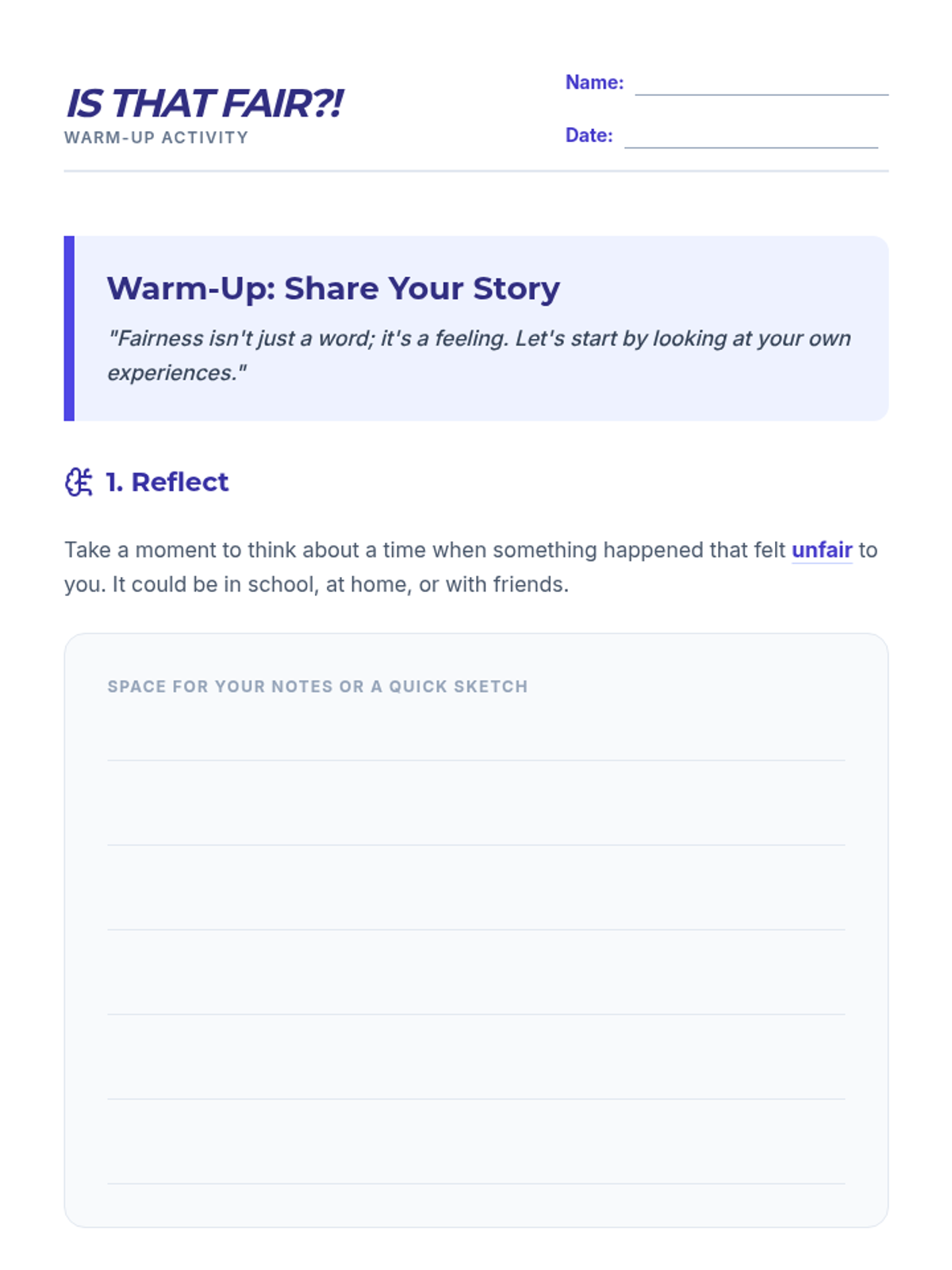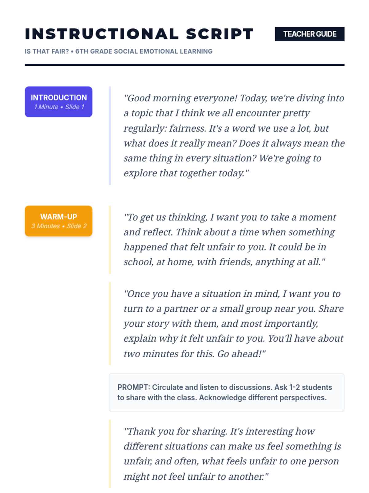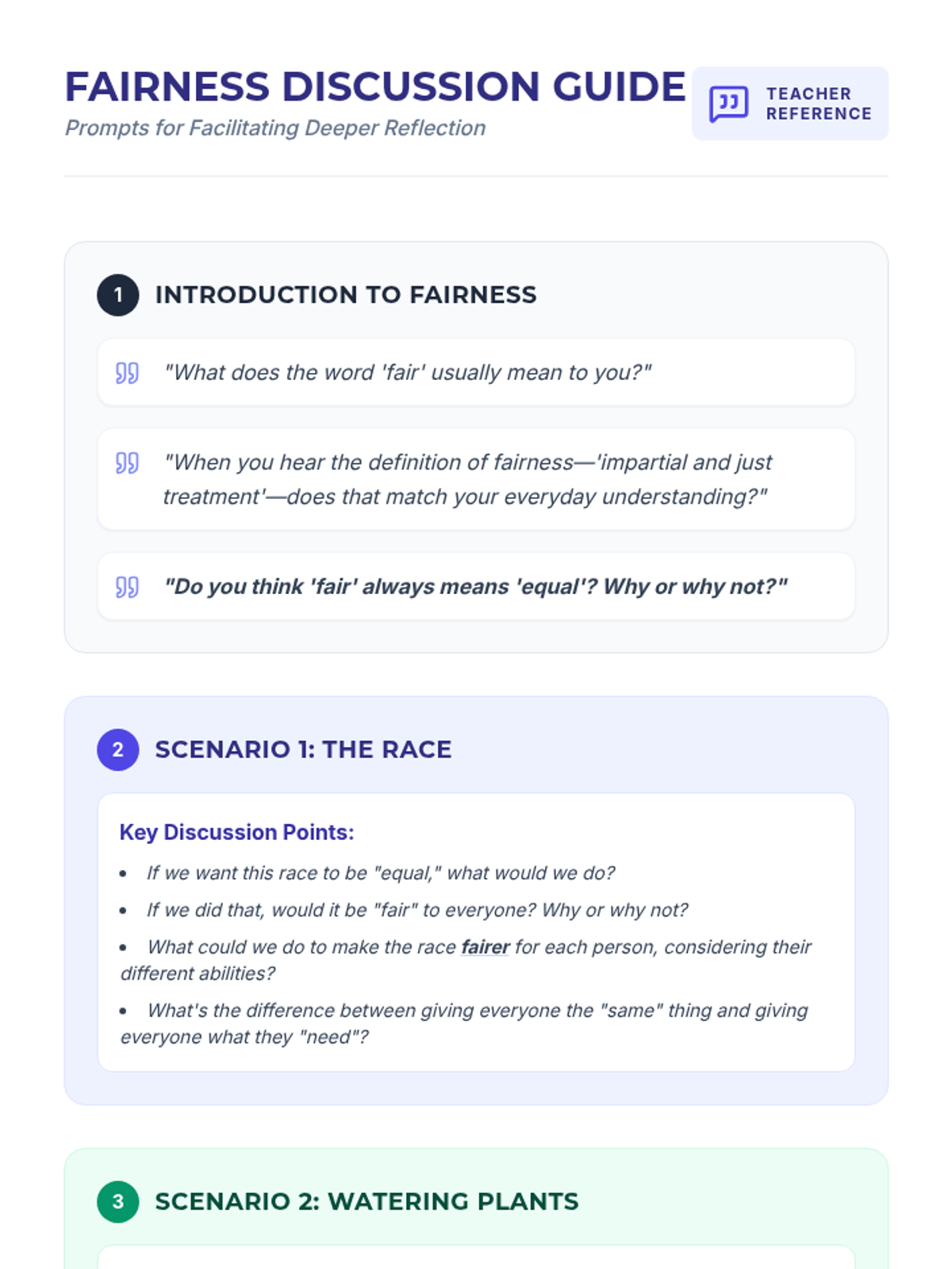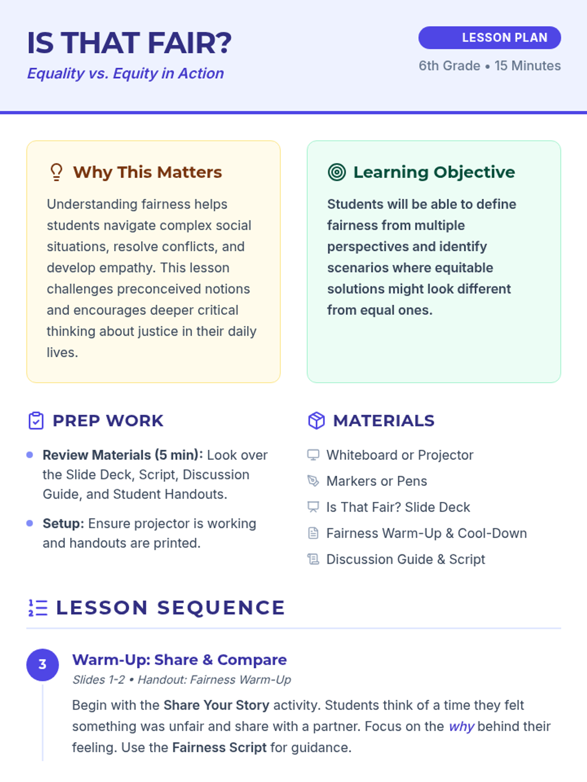 A 15-minute Tier 1 lesson for 6th graders exploring the difference between equality and equity through interactive scenarios. Students learn that true fairness often means giving individuals what they need to succeed rather than treating everyone exactly the same.
