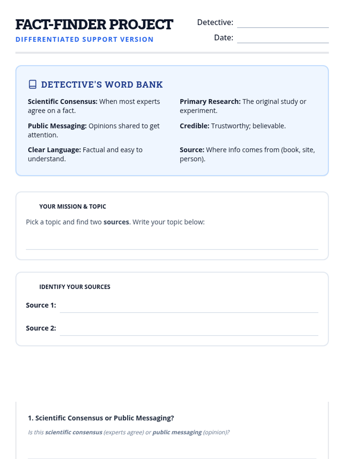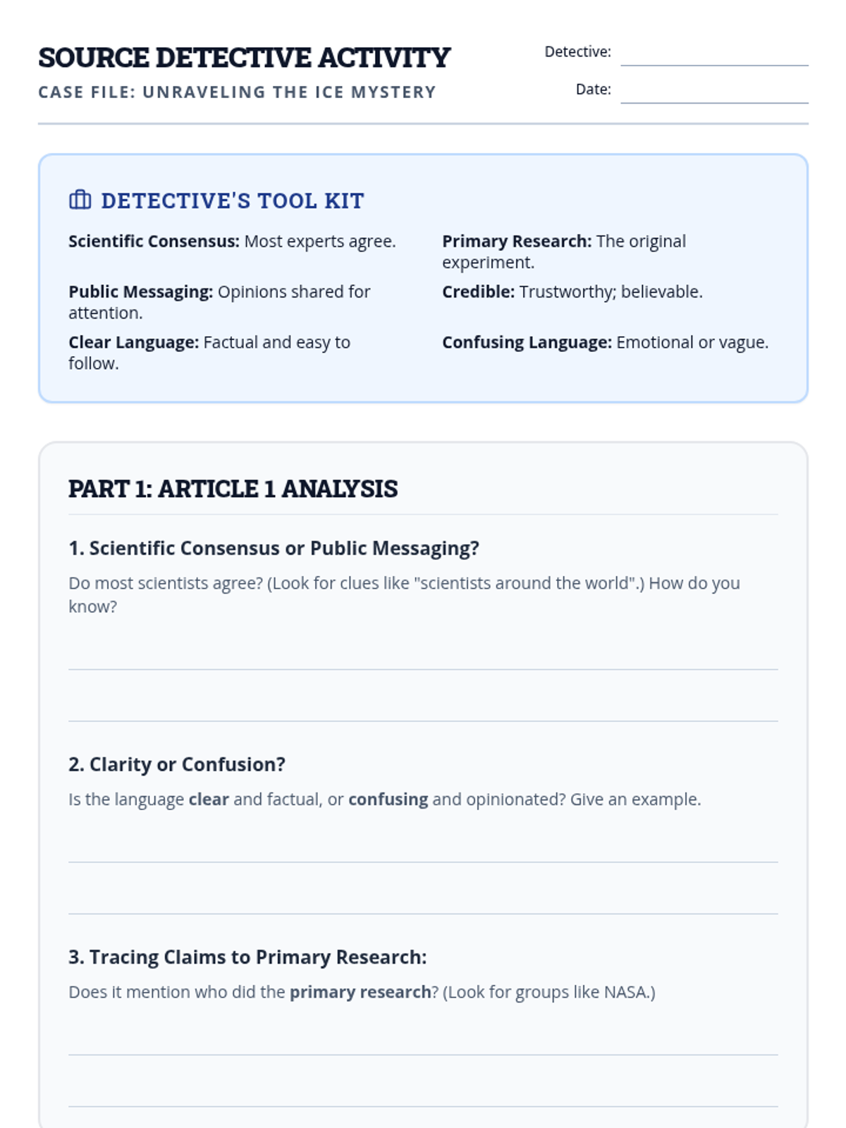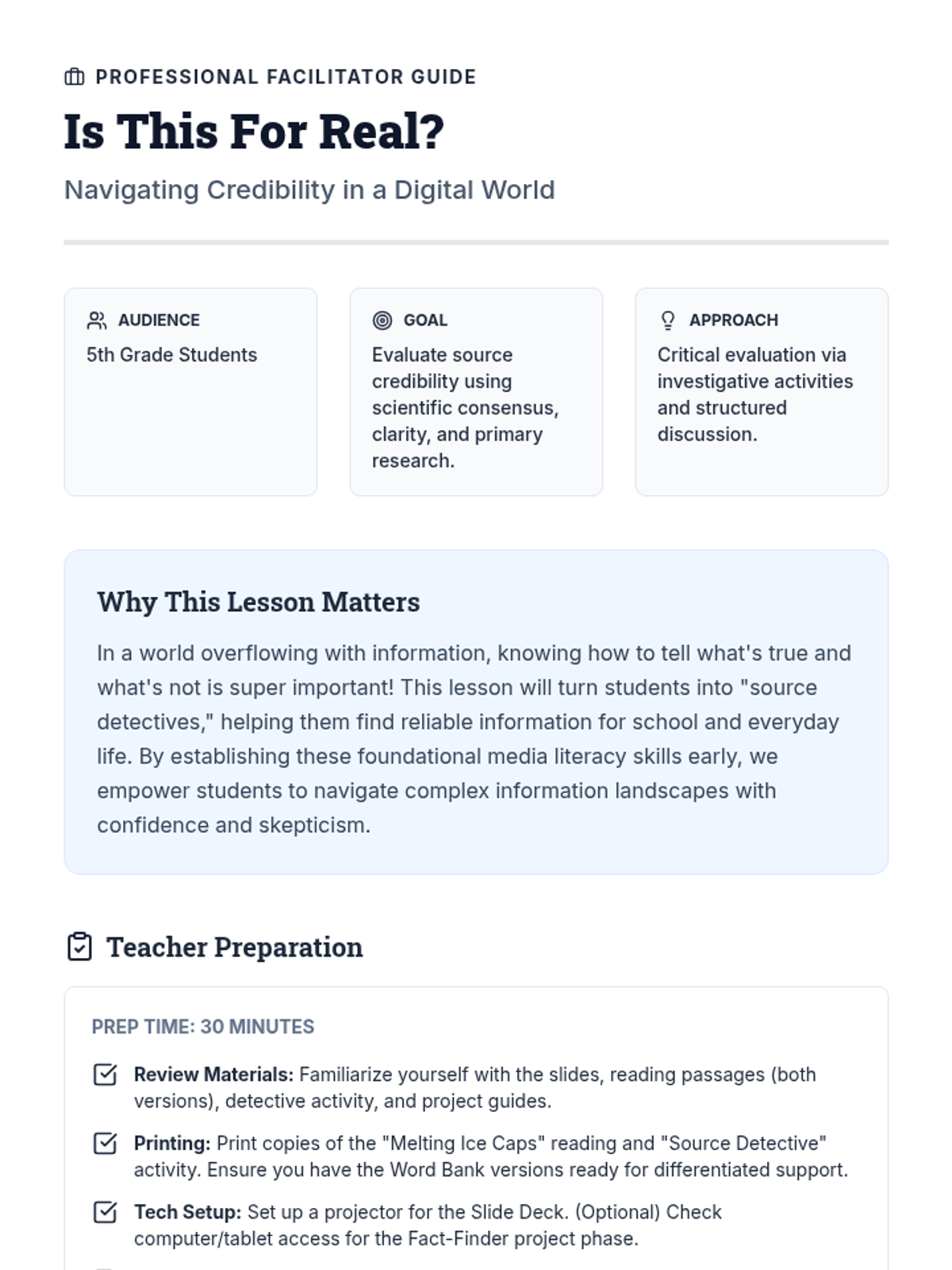 This anchor activity helps 5th-grade students become savvy media consumers by teaching them to evaluate source credibility. Students learn to distinguish scientific consensus from public messaging, recognize clear versus confusing language, and trace claims back to primary research.