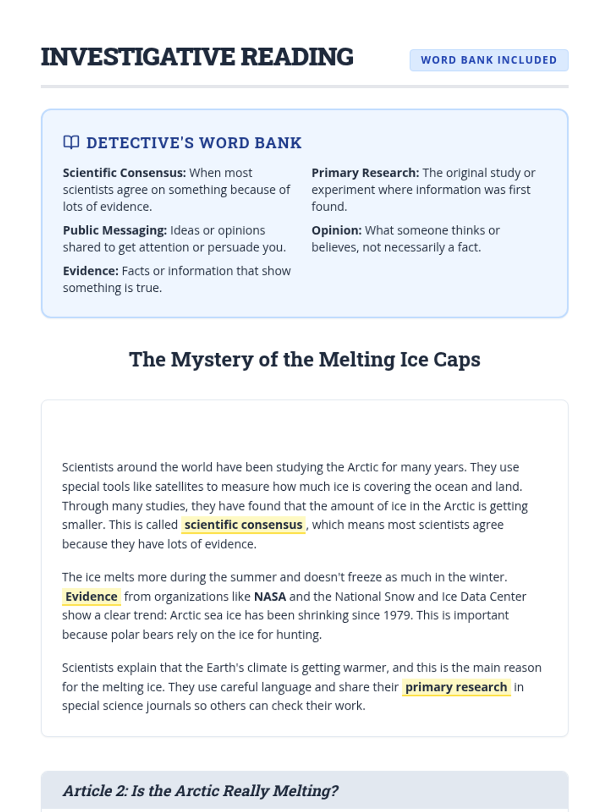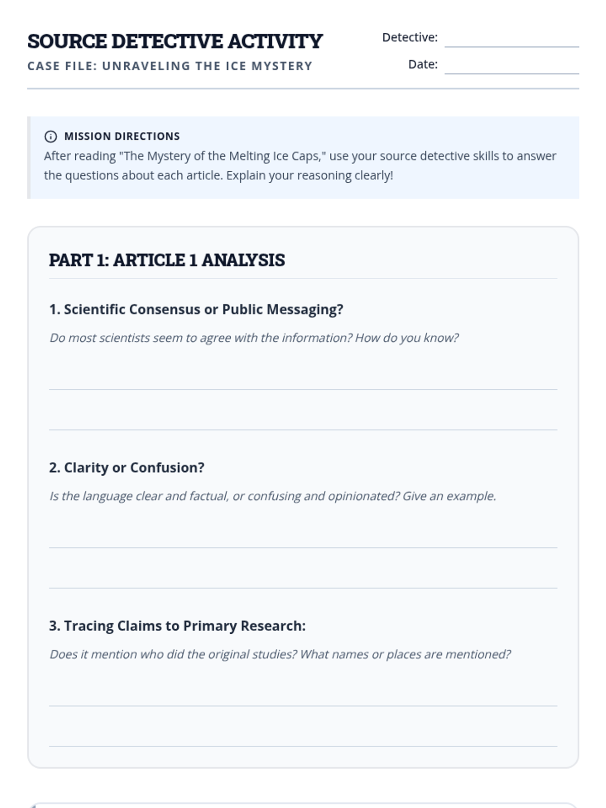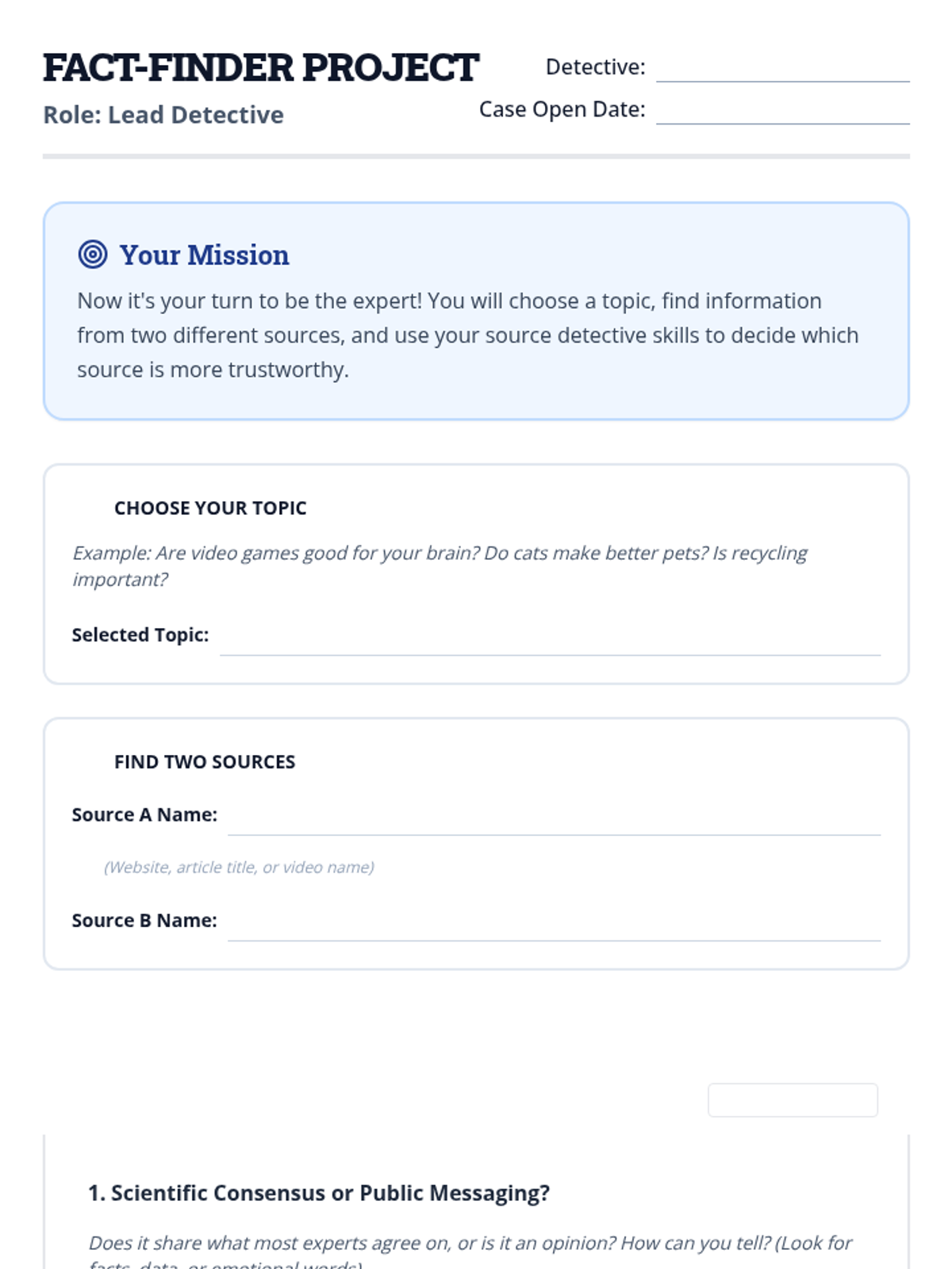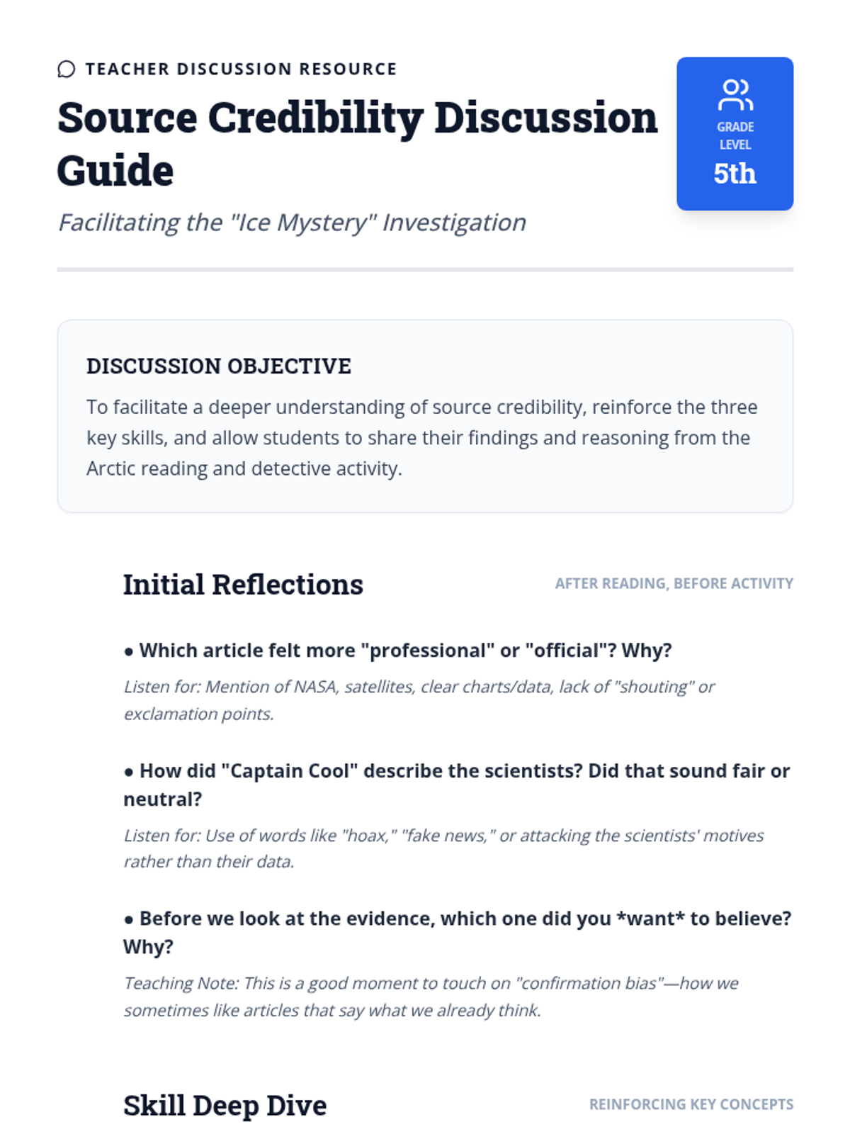 This anchor activity helps 5th-grade students become savvy media consumers by teaching them to evaluate source credibility. Students learn to distinguish scientific consensus from public messaging, recognize clear versus confusing language, and trace claims back to primary research.