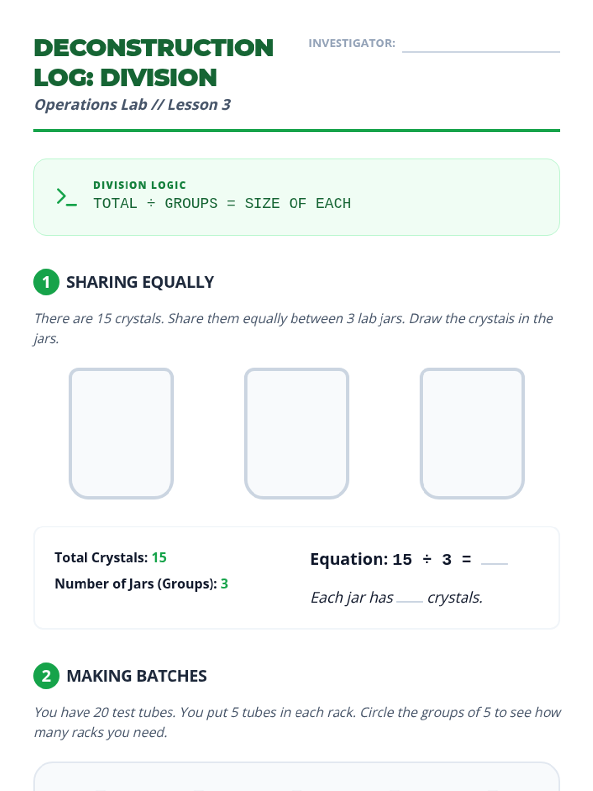 Introducing division as the inverse of multiplication, focusing on 'how many in each group' and 'how many groups'.