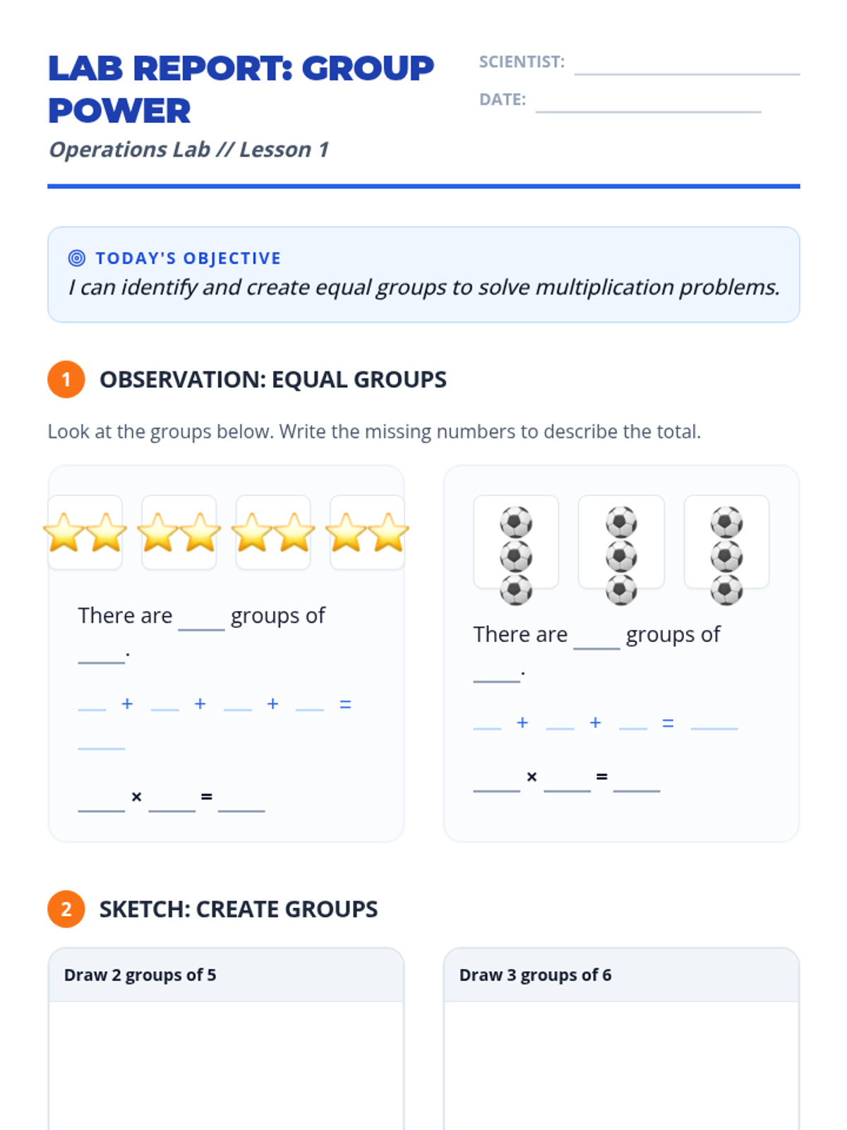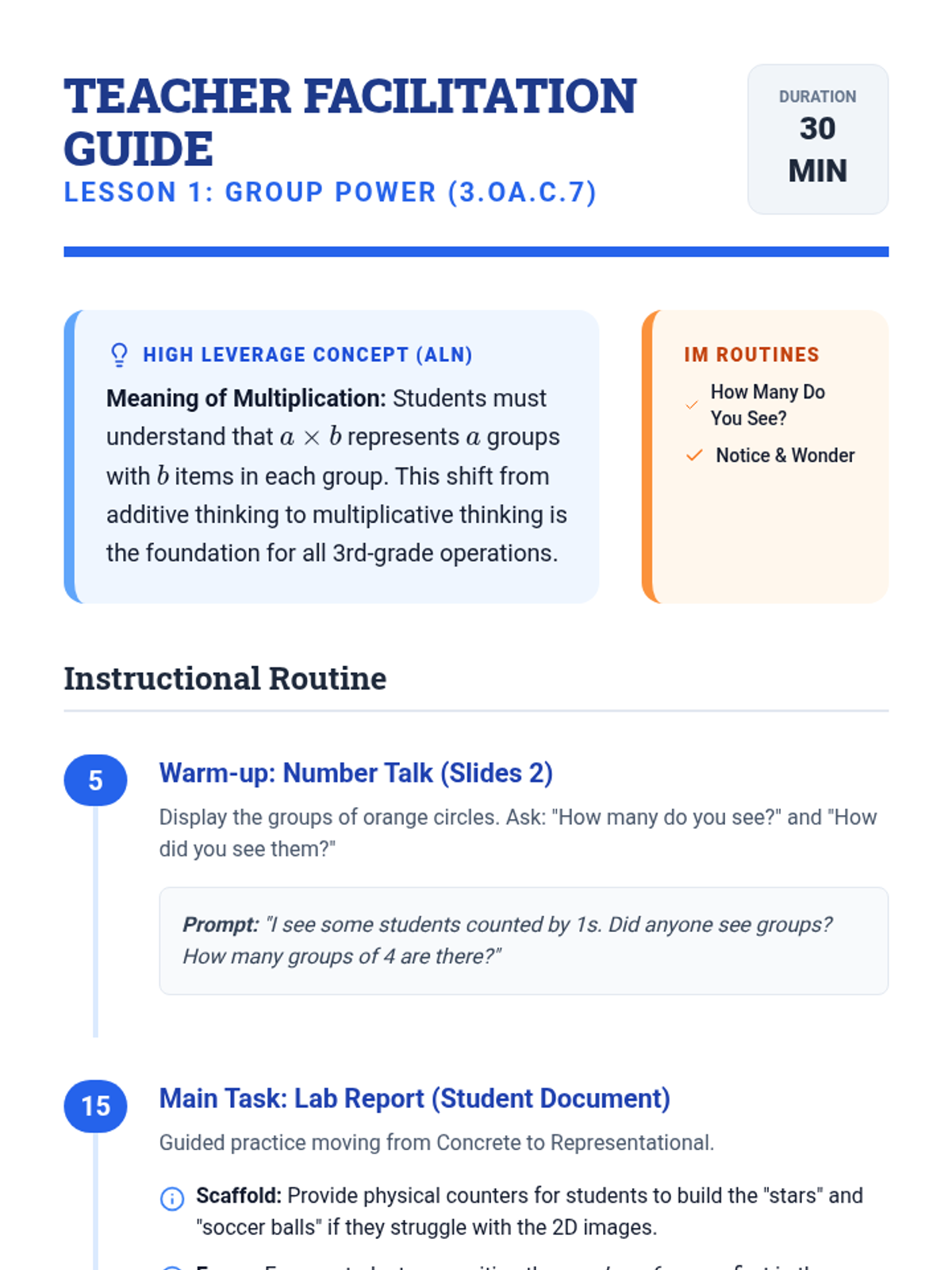 Focus on the meaning of multiplication as equal groups through visual representations and 'How Many Do You See?' routines.