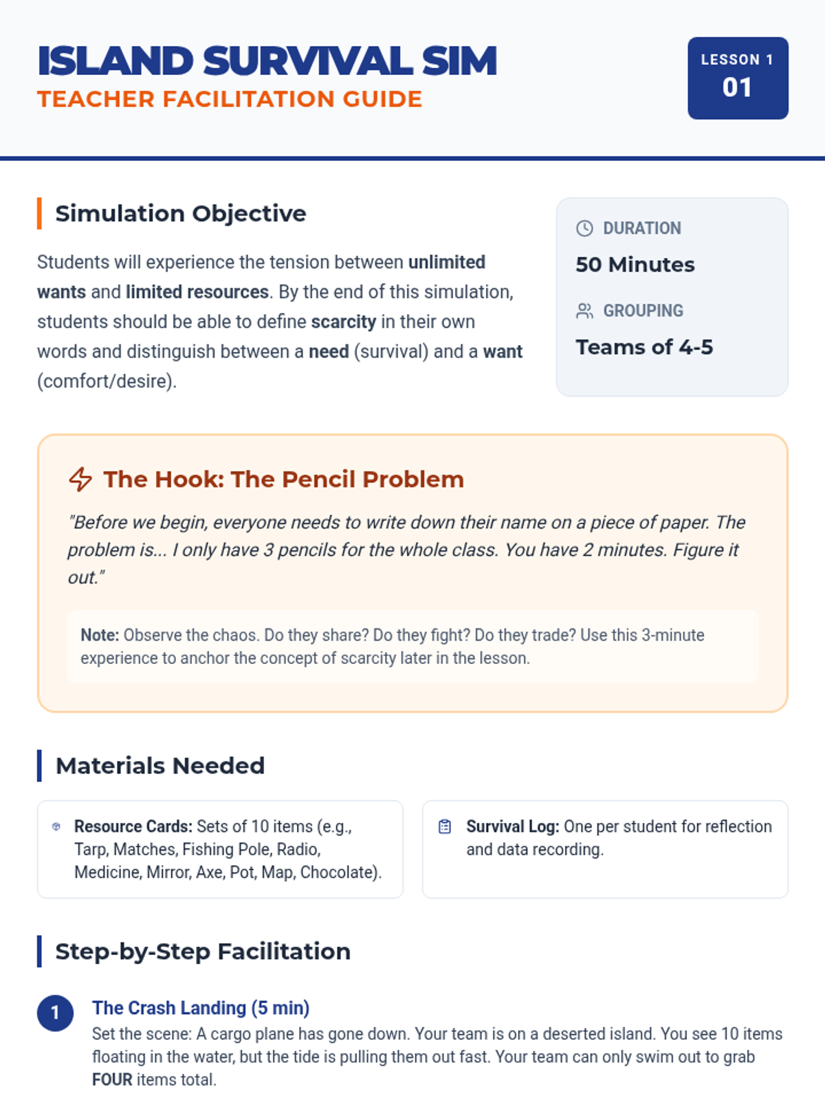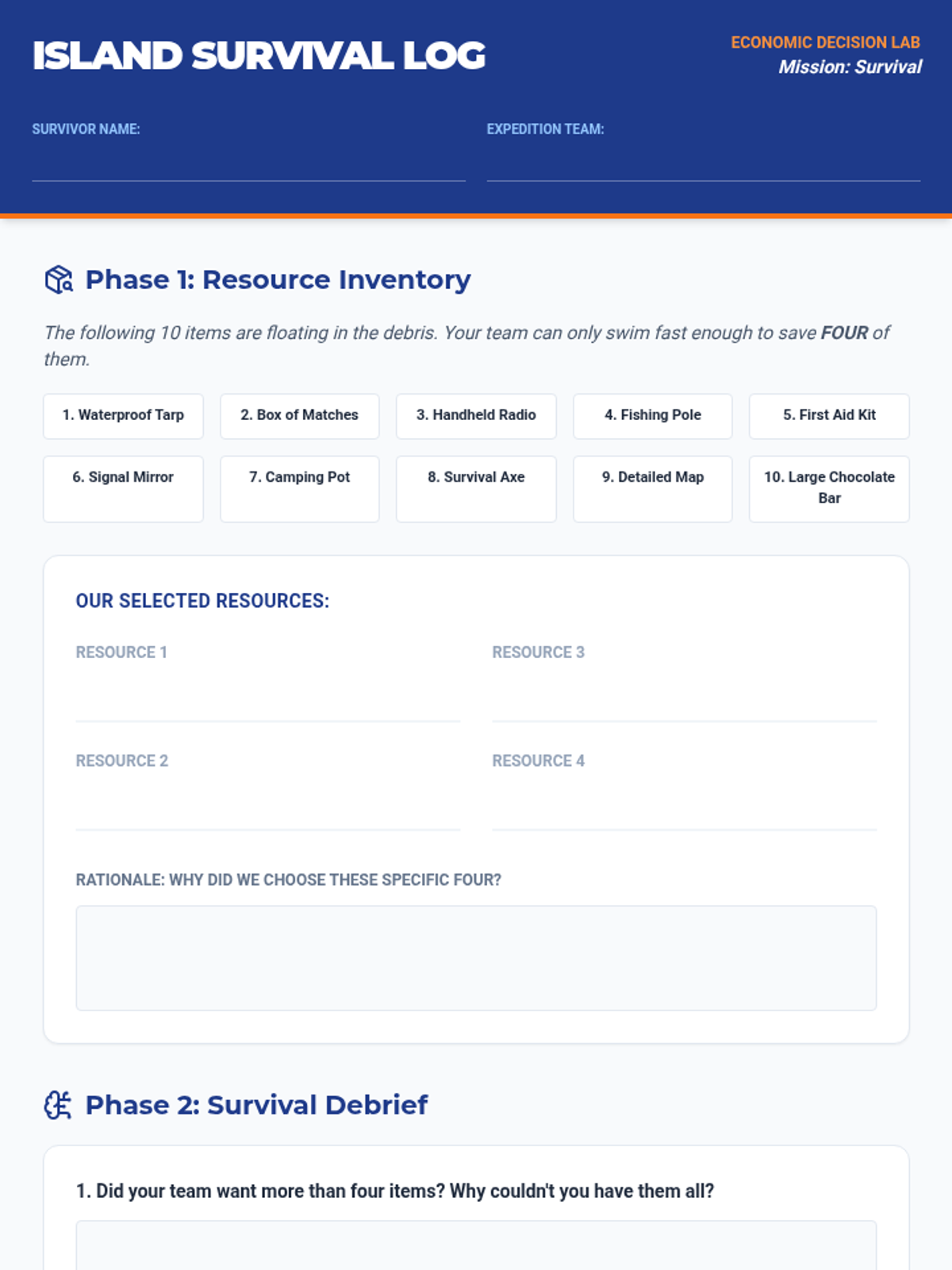 Students participate in a 'Survival Island' simulation where they must satisfy group needs with a severely limited set of physical items. They will categorize their immediate needs versus wants and articulate the concept of scarcity based on their direct experience.