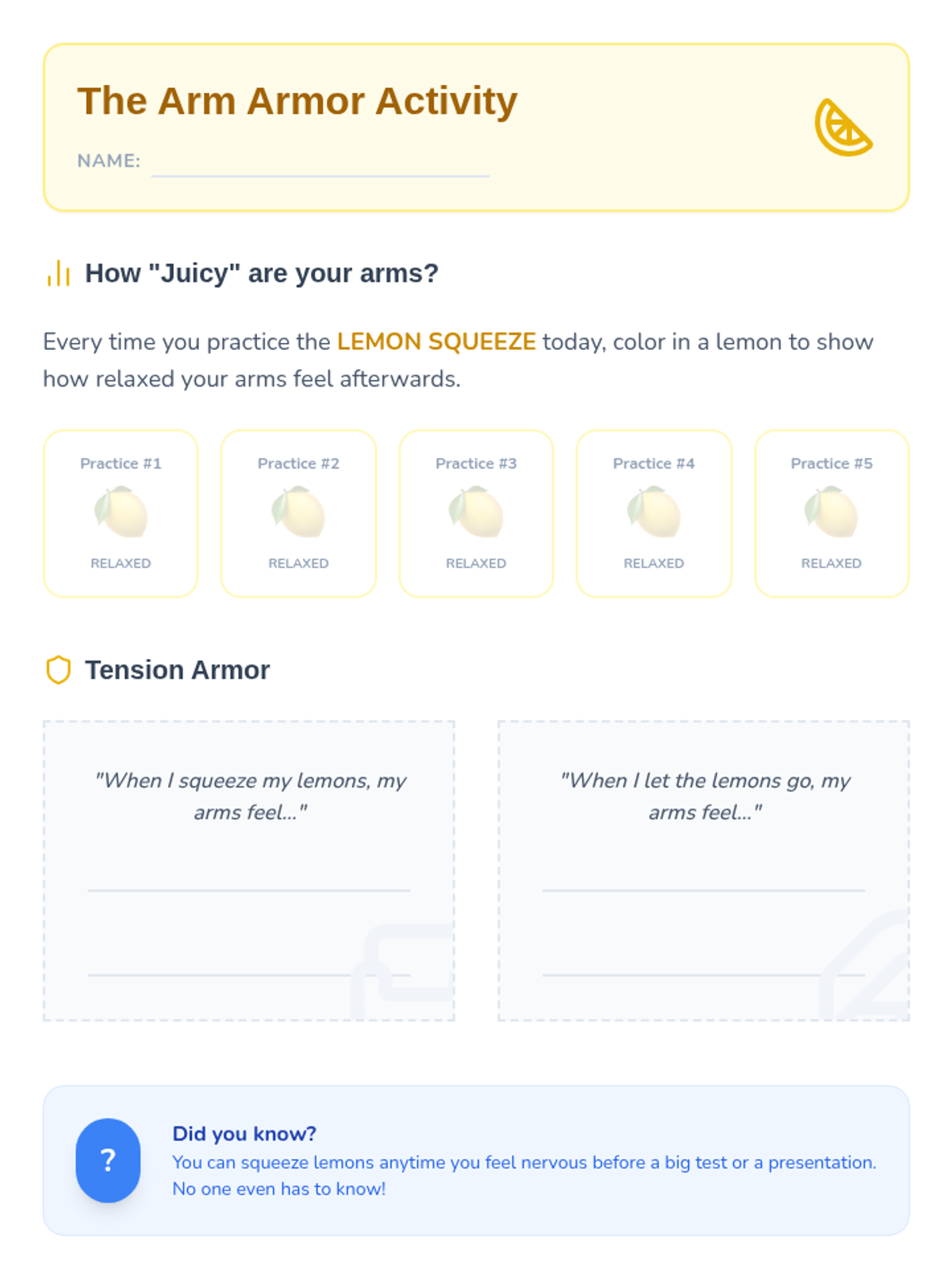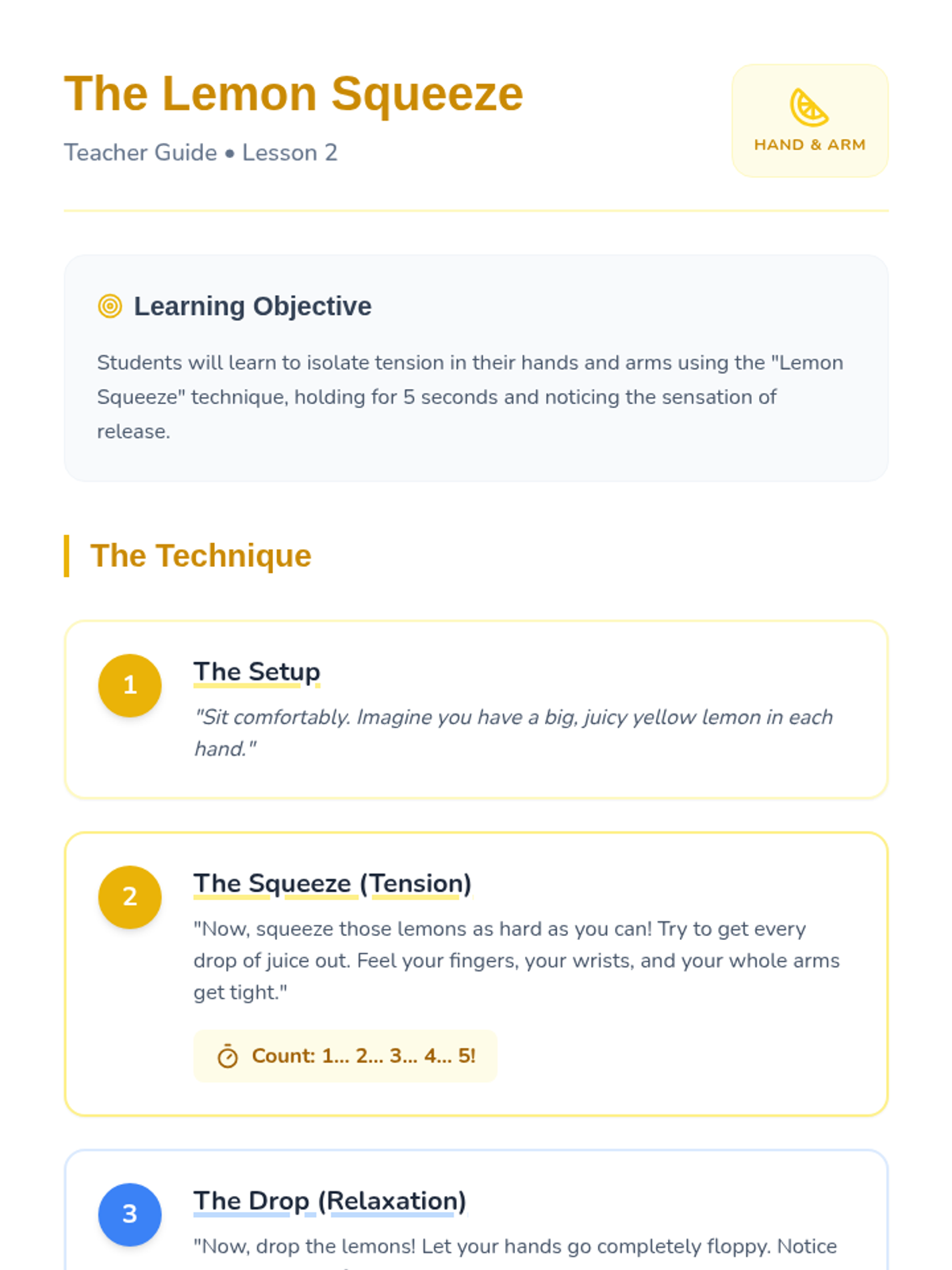 Focusing on the hands and arms, students practice the 'lemon squeeze' technique to isolate and release tension in their upper extremities.