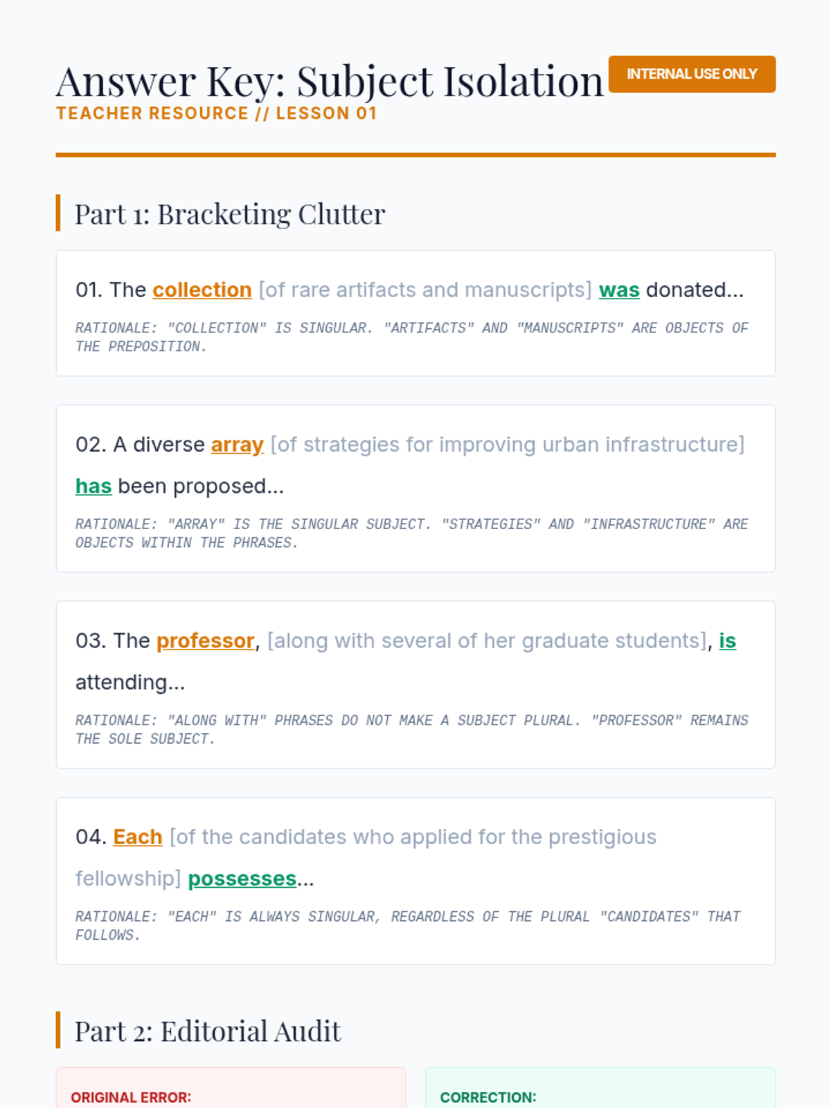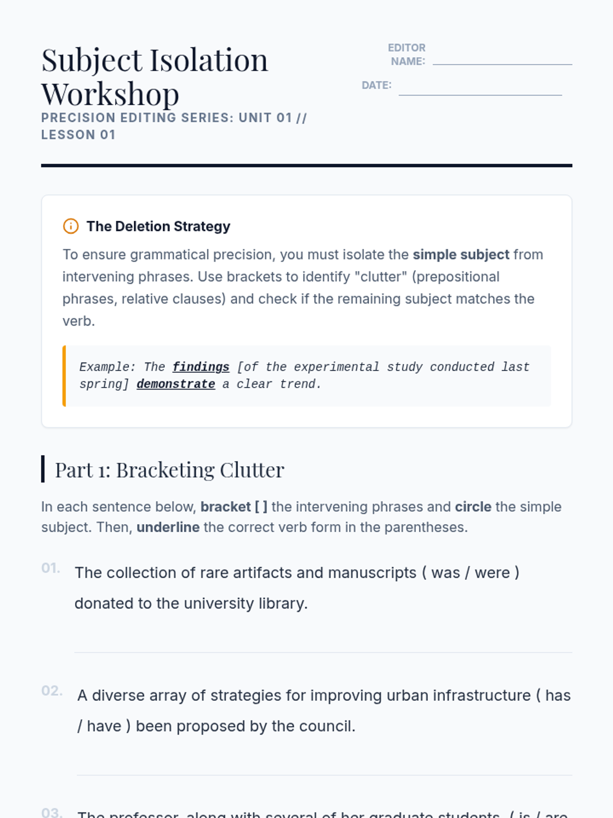 Students learn to isolate the simple subject from intervening prepositional phrases and relative clauses using a 'deletion' strategy. This lesson focuses on ensuring precision in sentences where the noun closest to the verb is not the actual subject.