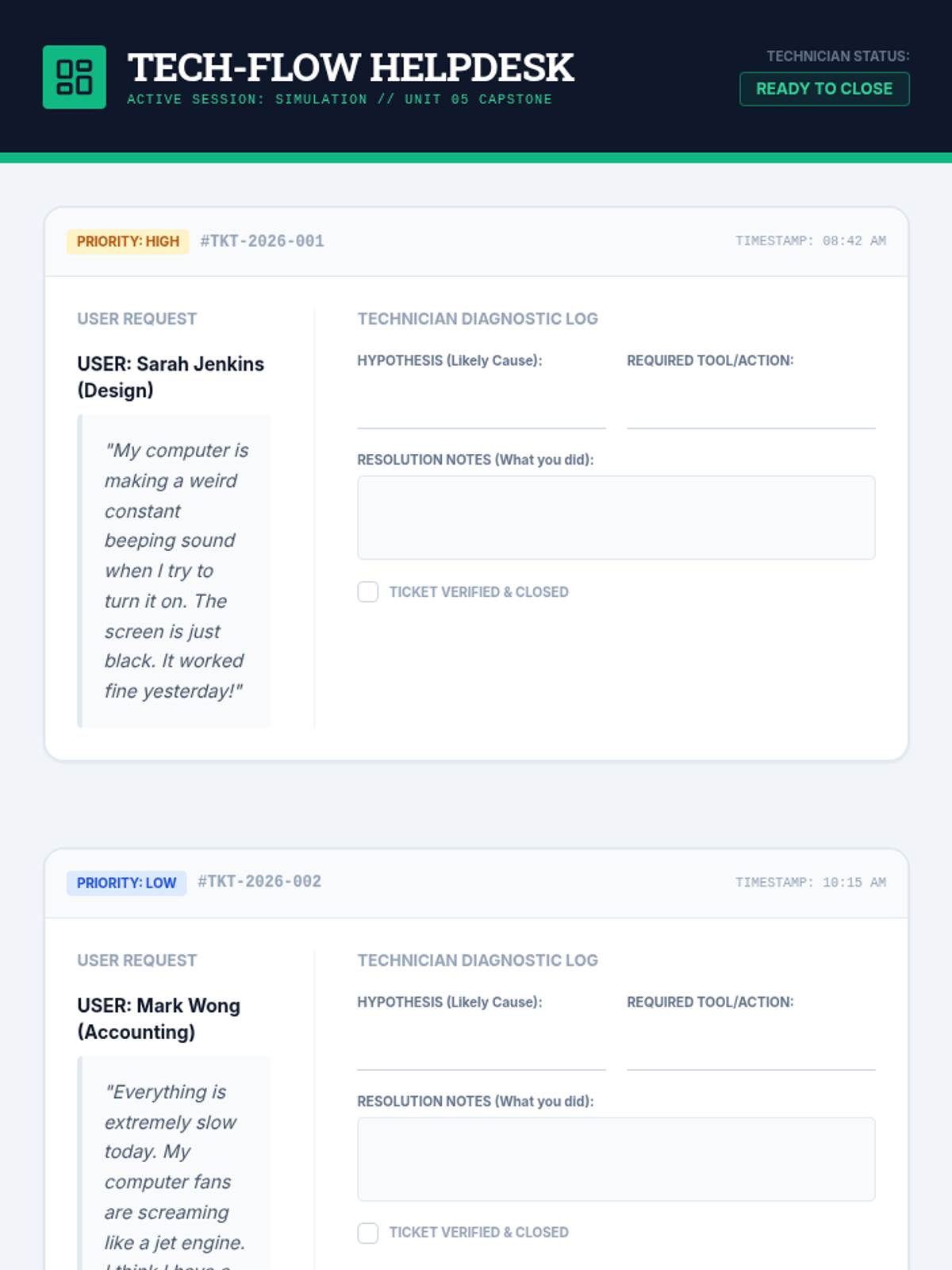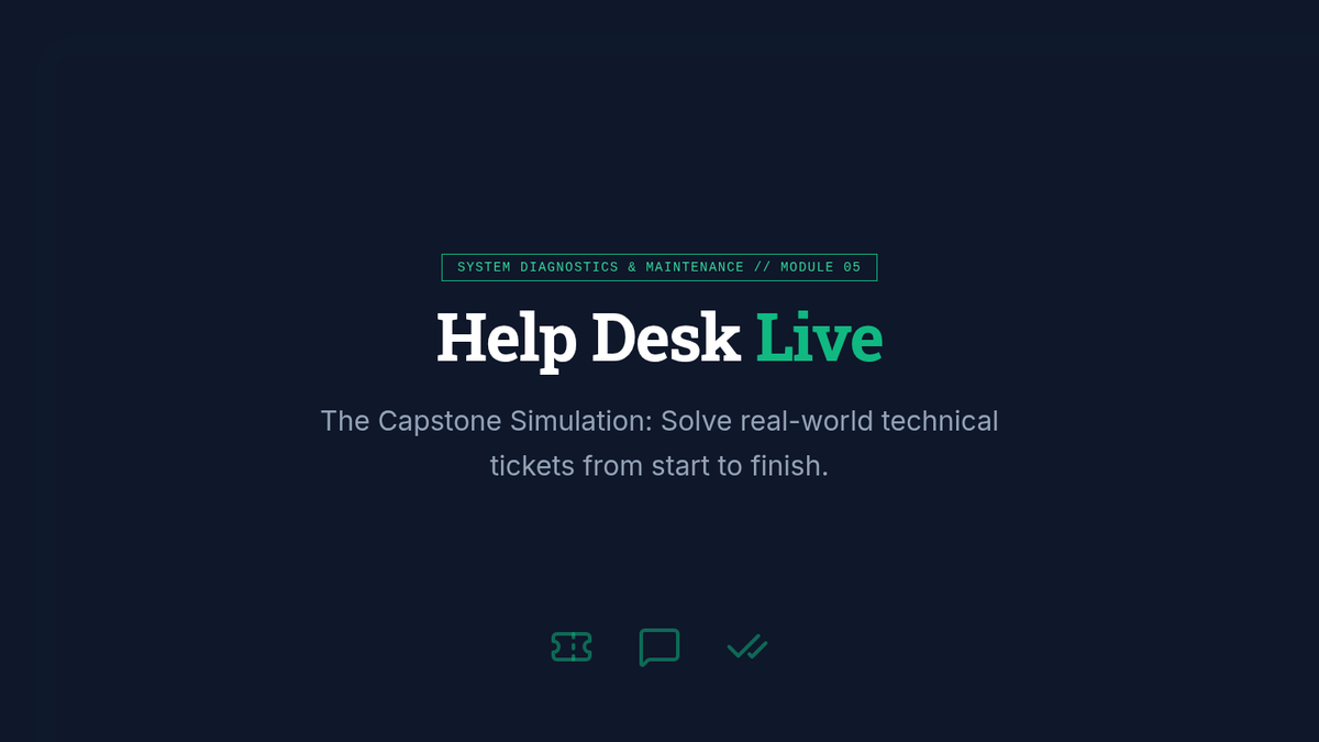 A capstone simulation where students solve complex technical tickets, diagnosing root causes and documenting solutions in a professional help desk format.