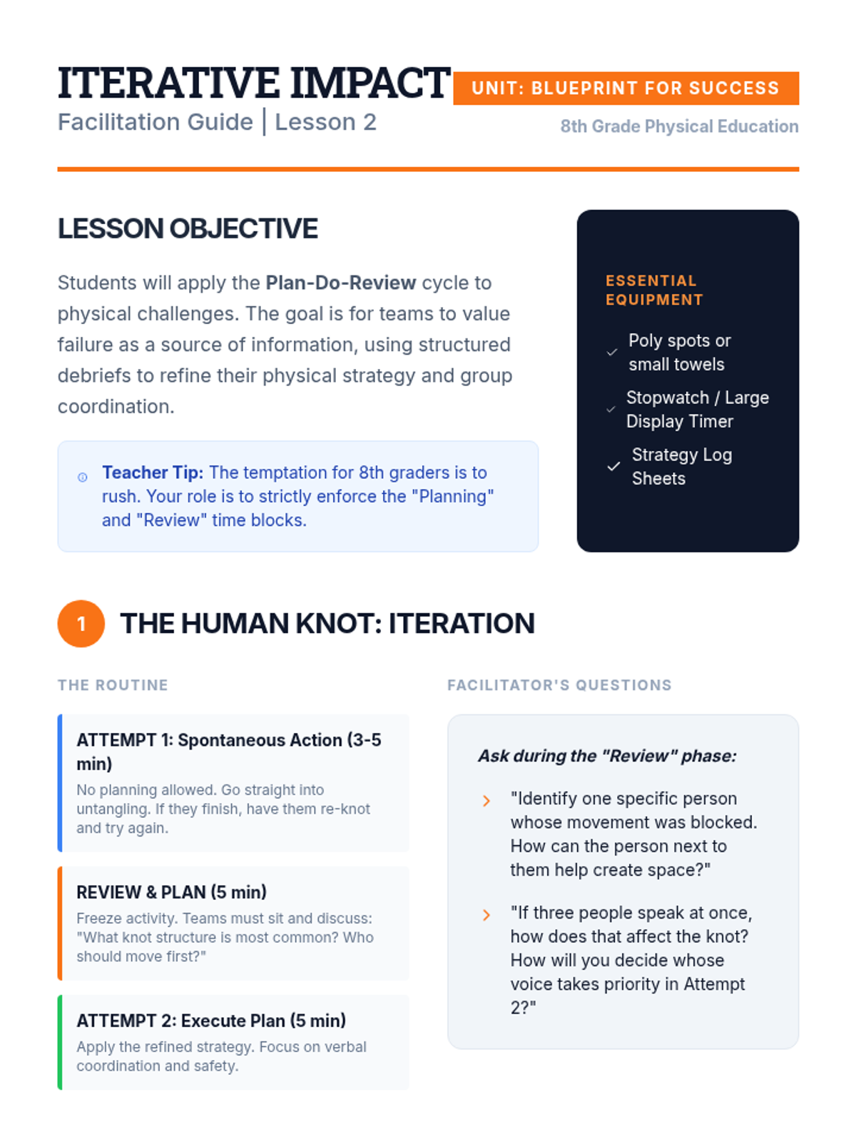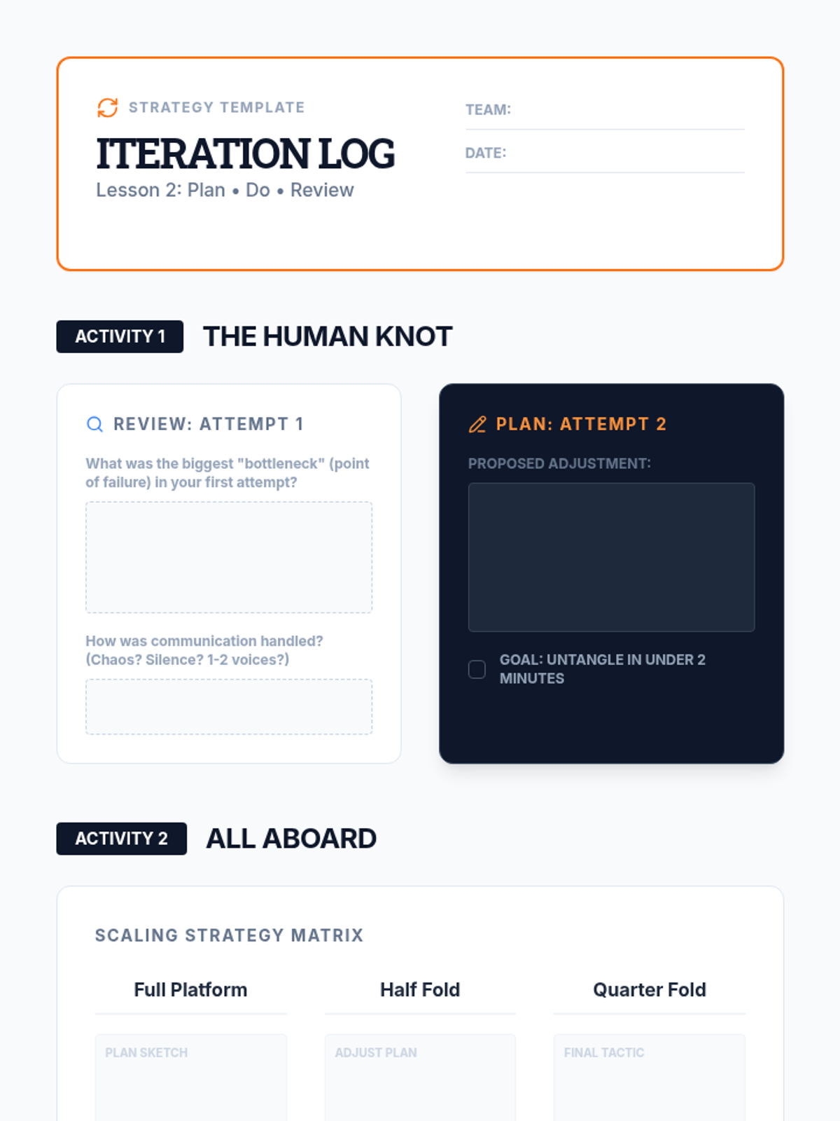 Focusing on the 'Plan-Do-Review' cycle, students tackle the Human Knot and All Aboard activities to learn iterative problem-solving.