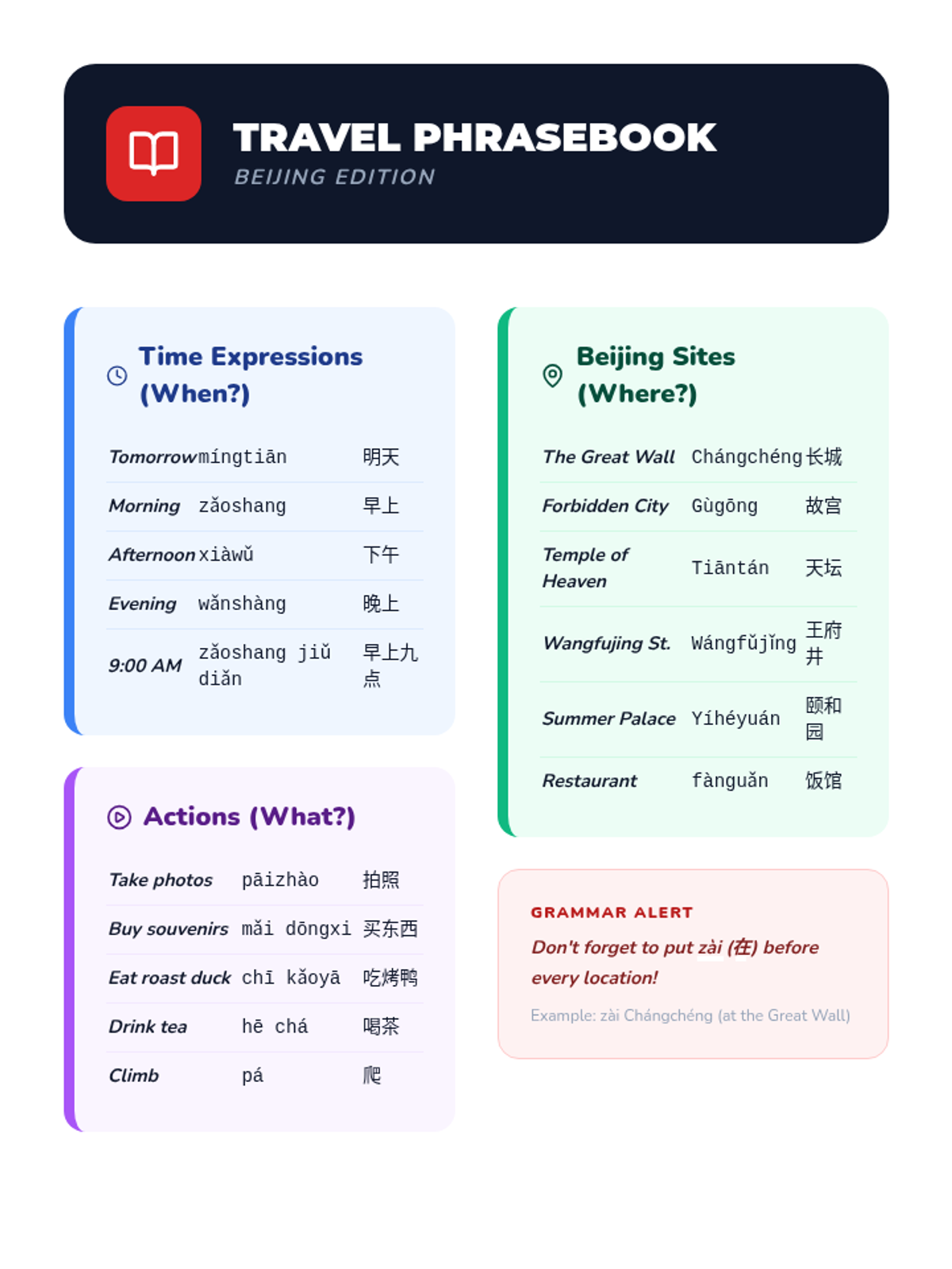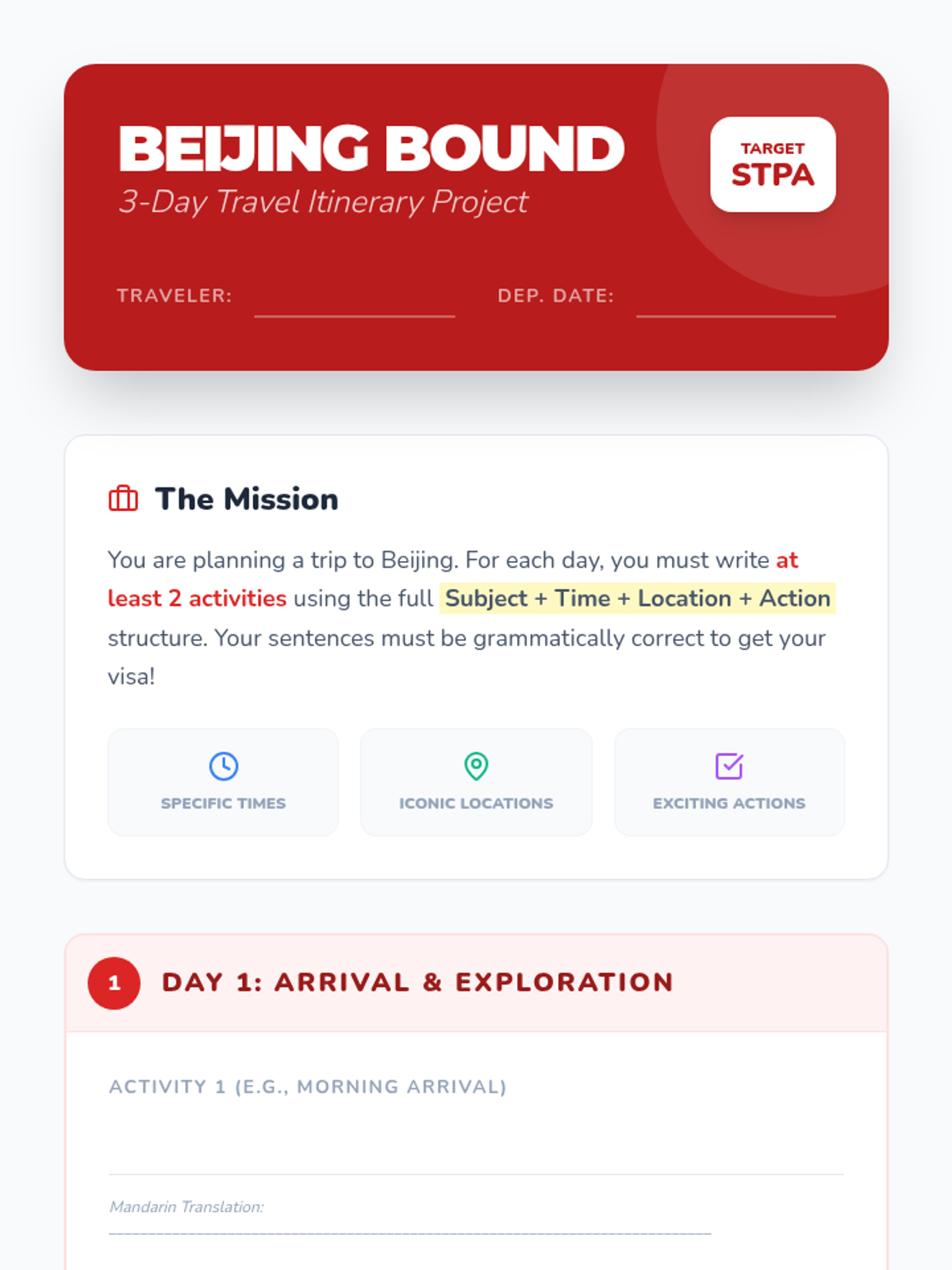 A project-based workshop where students draft a 3-day travel itinerary for a trip to China, applying word order rules to describe their activities.