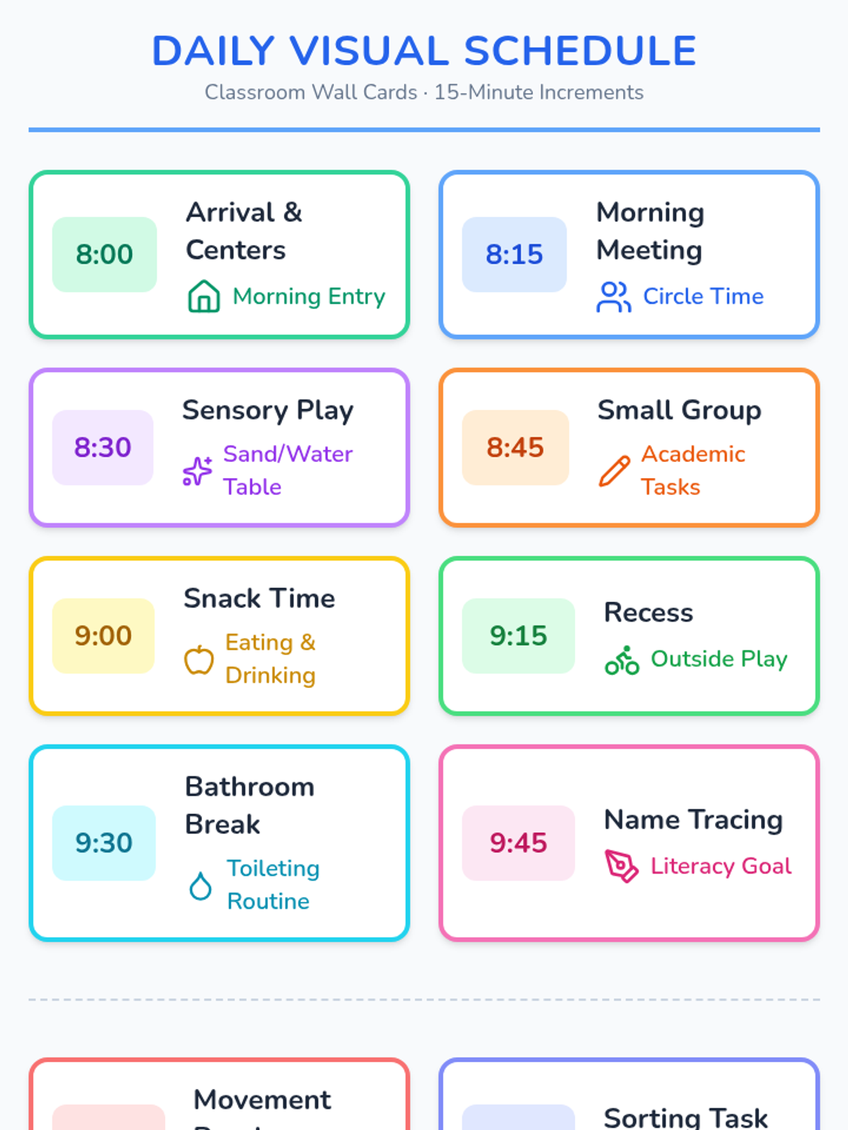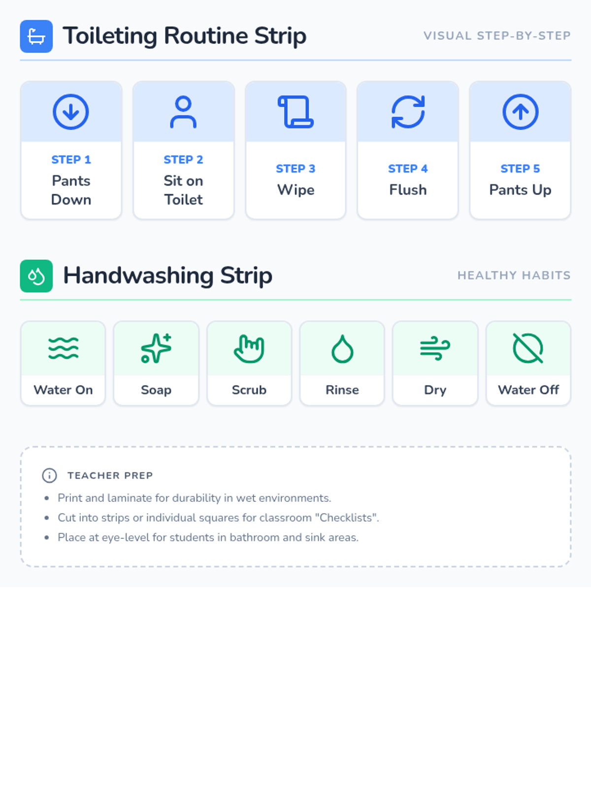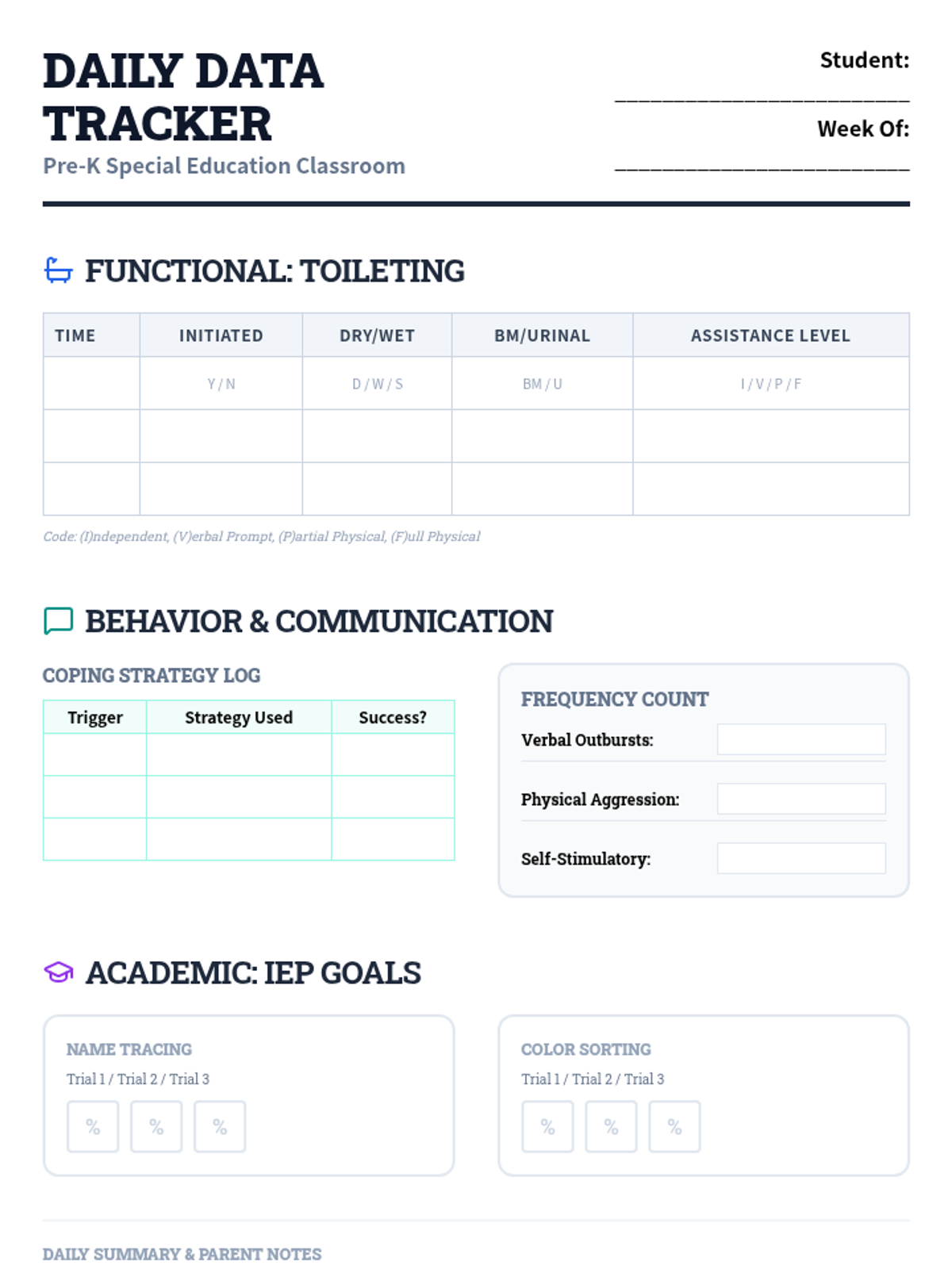 A comprehensive set of visual supports and tracking tools designed for a Pre-K special education classroom. This bundle includes daily schedules, functional routine guides, communication icons, and data collection sheets to support independence and behavioral success.