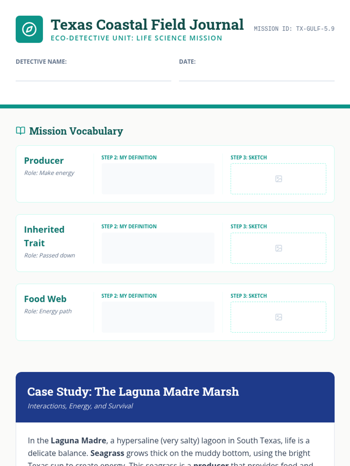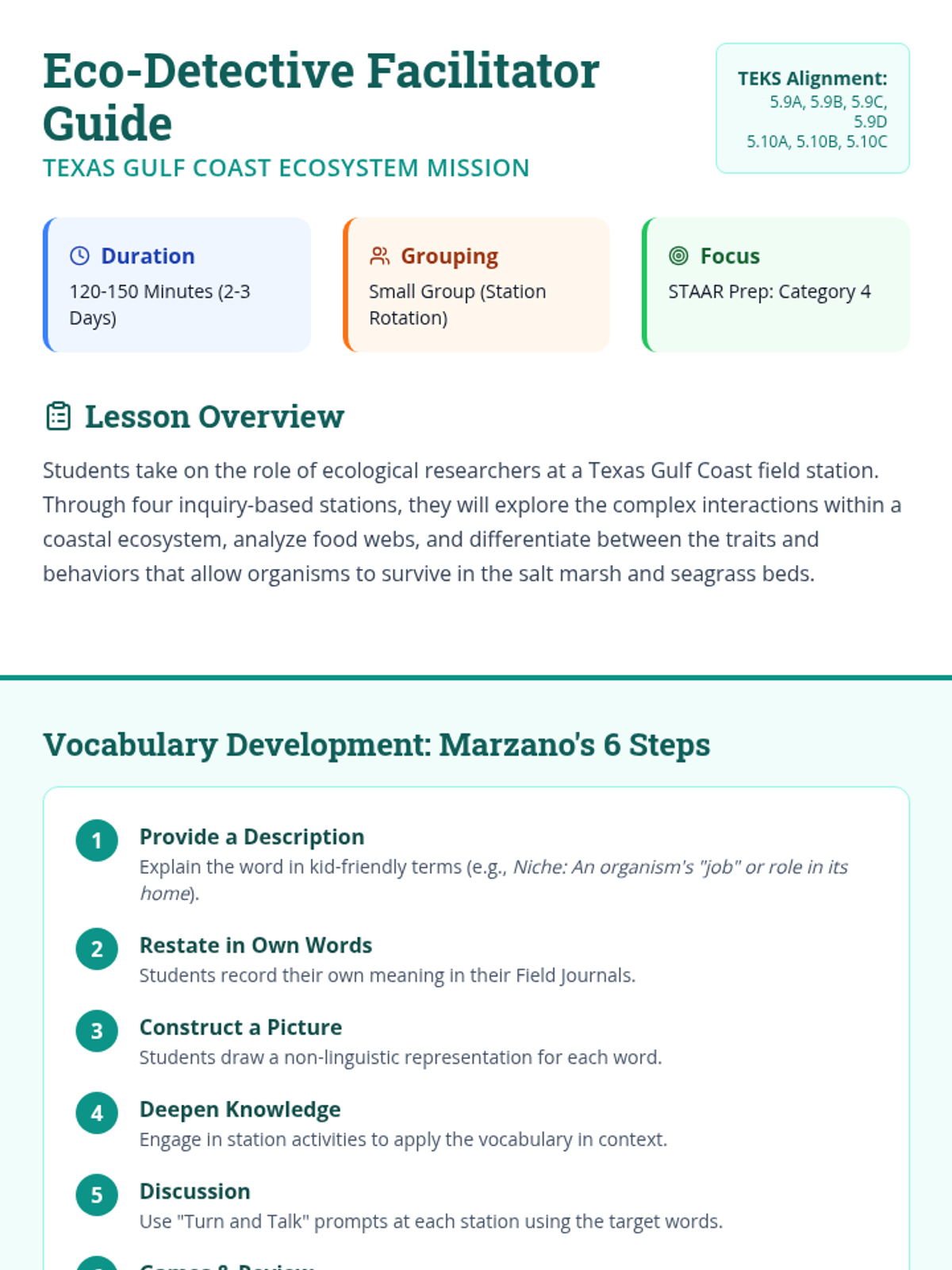 A comprehensive TEKS-aligned Grade 5 life science lesson focusing on Texas Gulf Coast ecosystems, food webs, and adaptations through inquiry-based stations and STAAR-style practice.