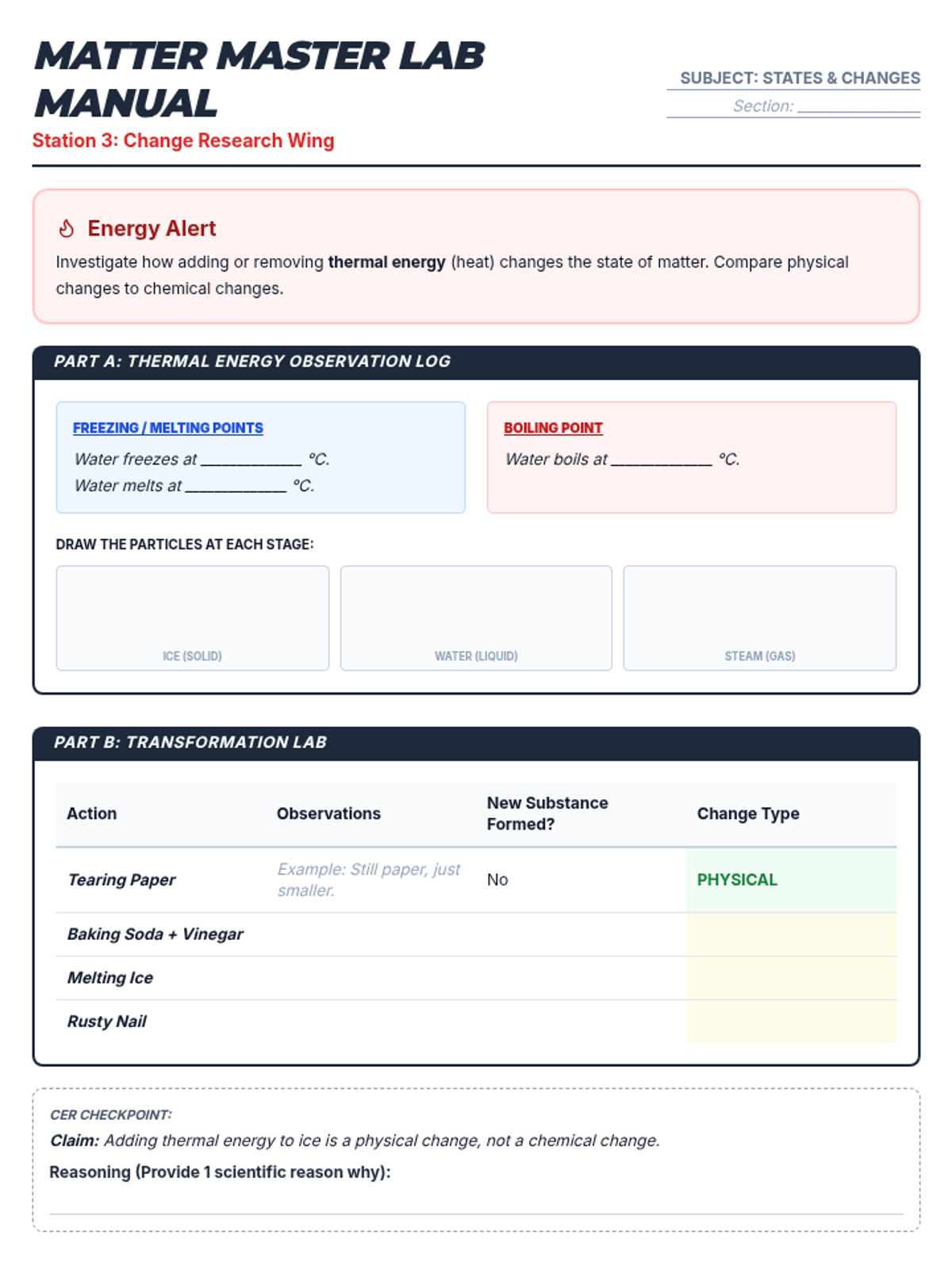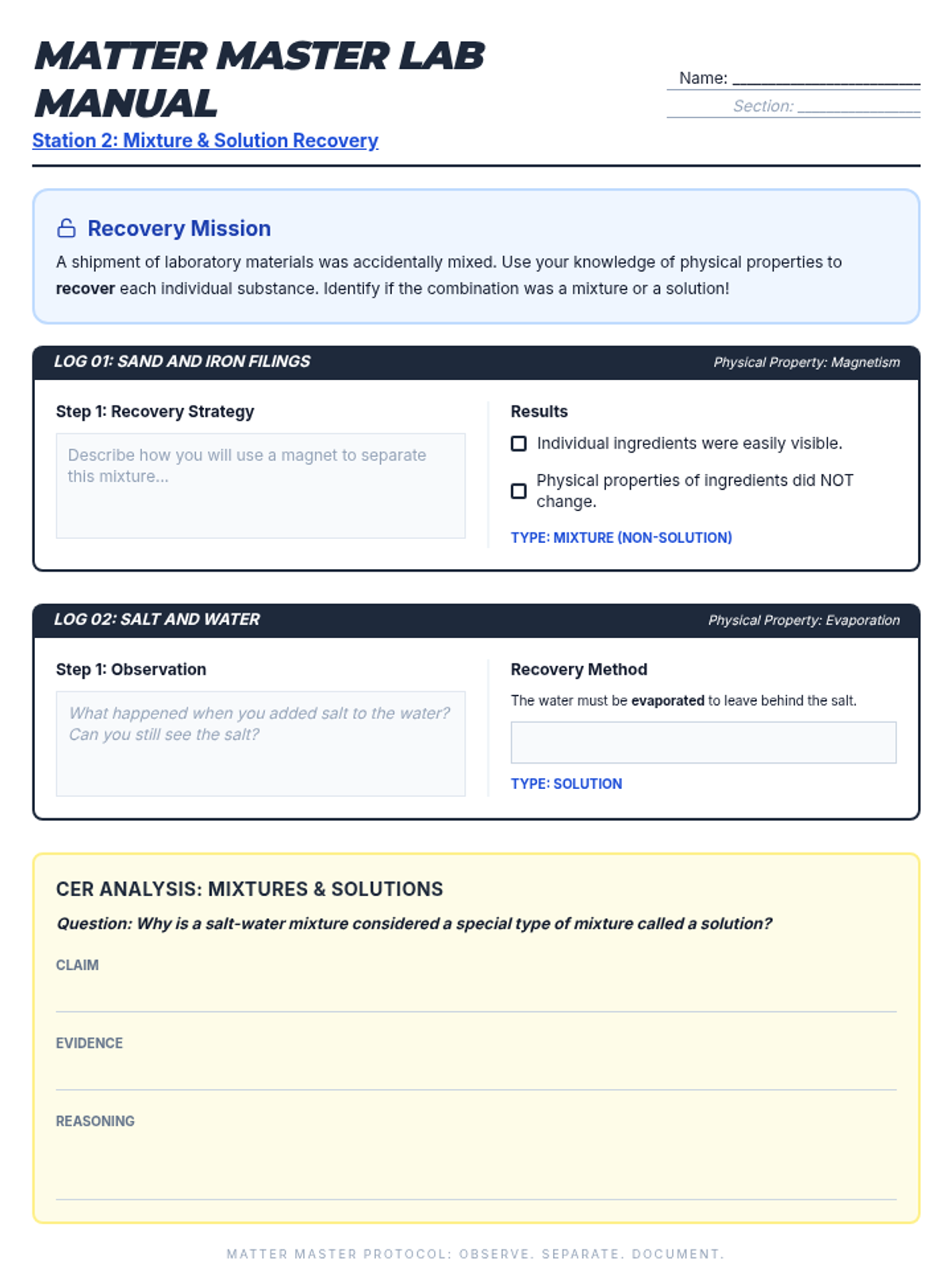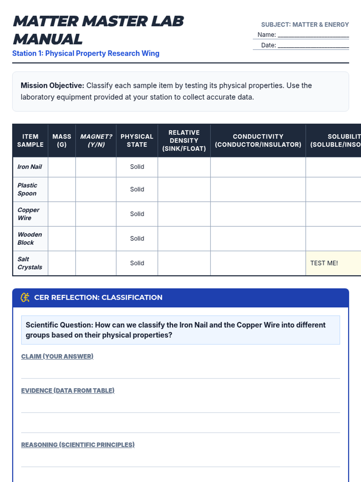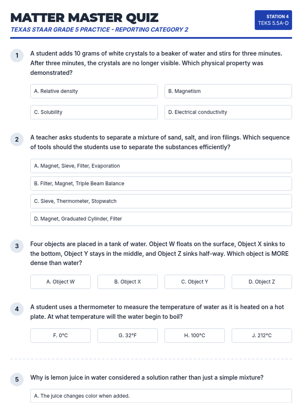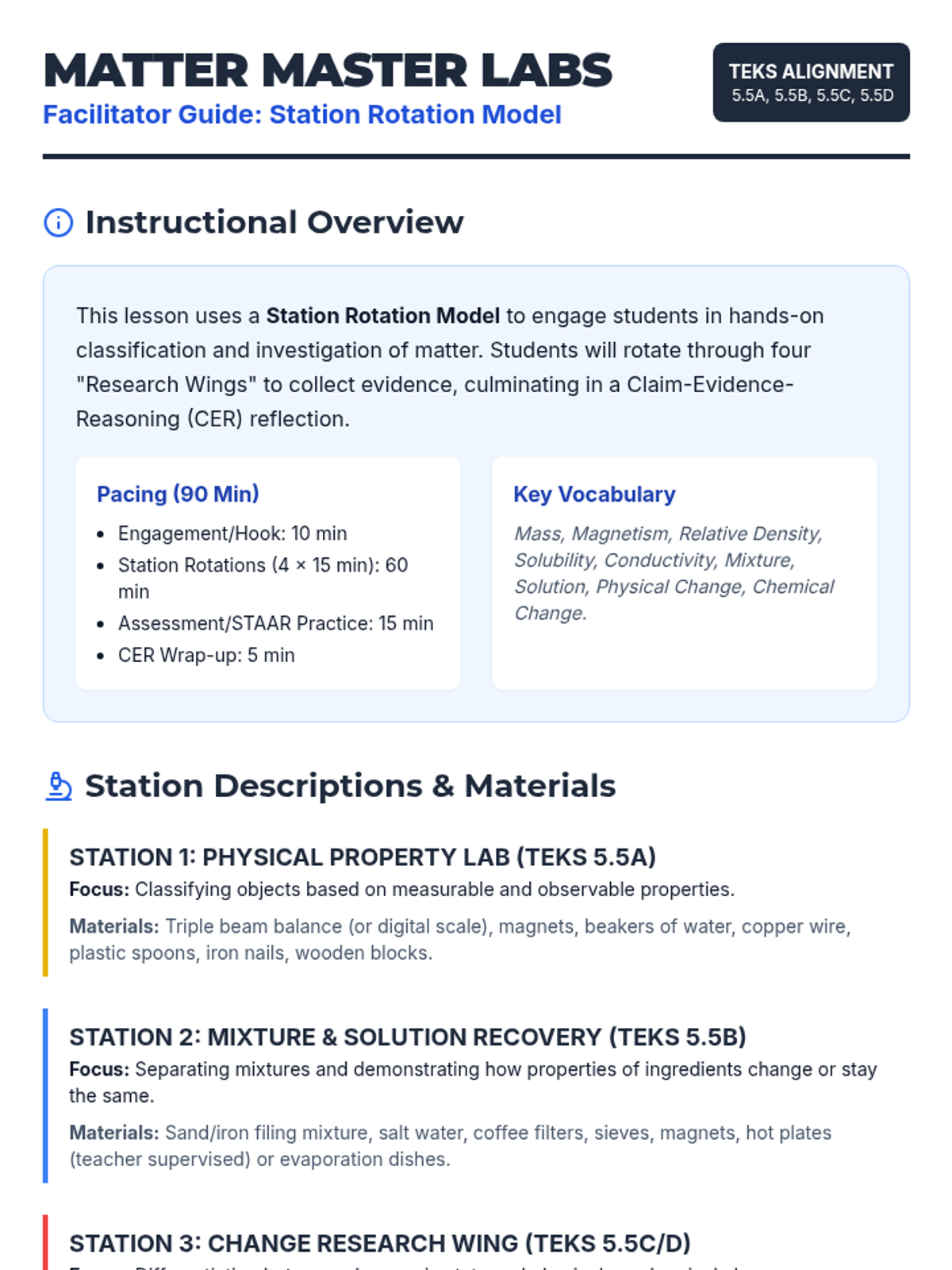 A comprehensive 5th grade science lesson on the properties and changes of matter, featuring hands-on stations, mixtures and solutions investigations, and STAAR-aligned assessment. Students explore physical properties, separation techniques, and state changes using the CER framework.