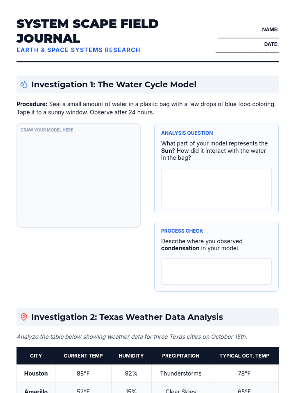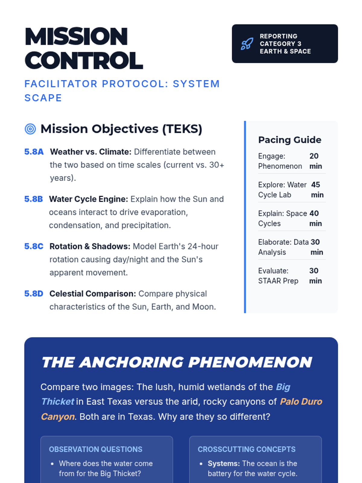 A comprehensive Grade 5 Science lesson covering Earth and space systems, including the water cycle, weather patterns, and the Sun-Earth-Moon system, designed for STAAR preparation. Students will analyze real Texas weather data, build water cycle models, and compare celestial bodies through a phenomenon-based lens.