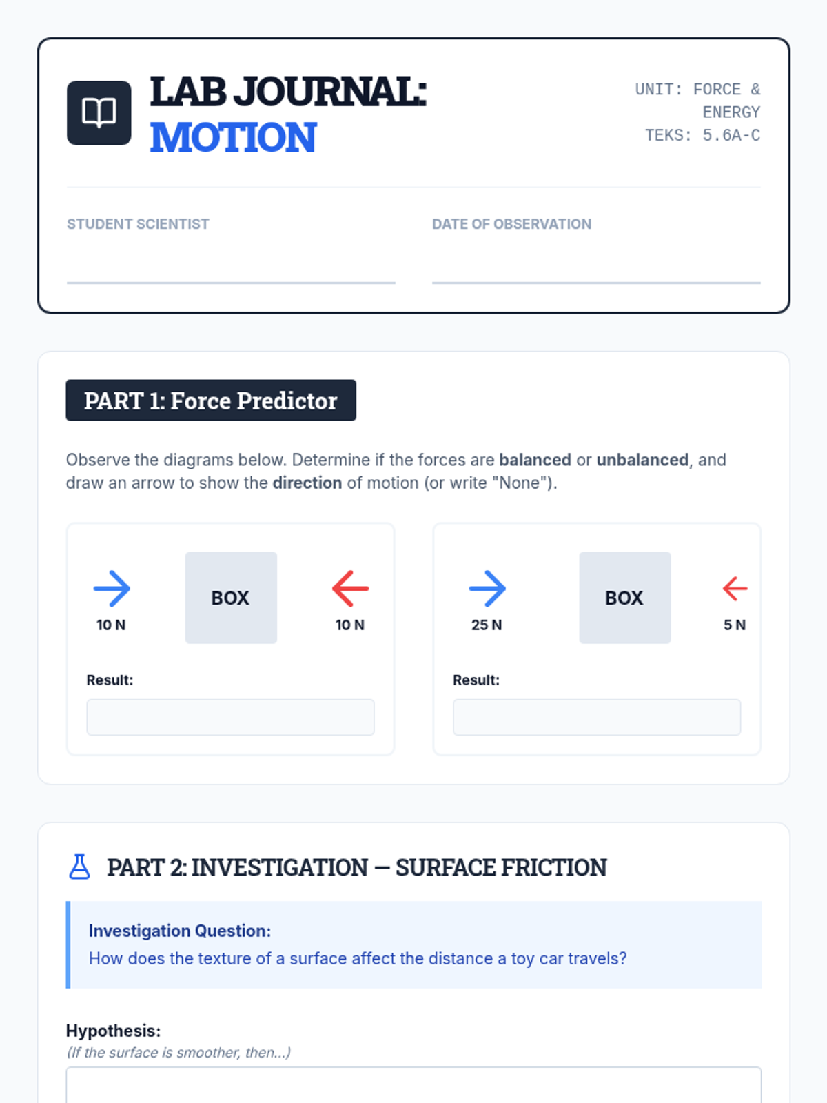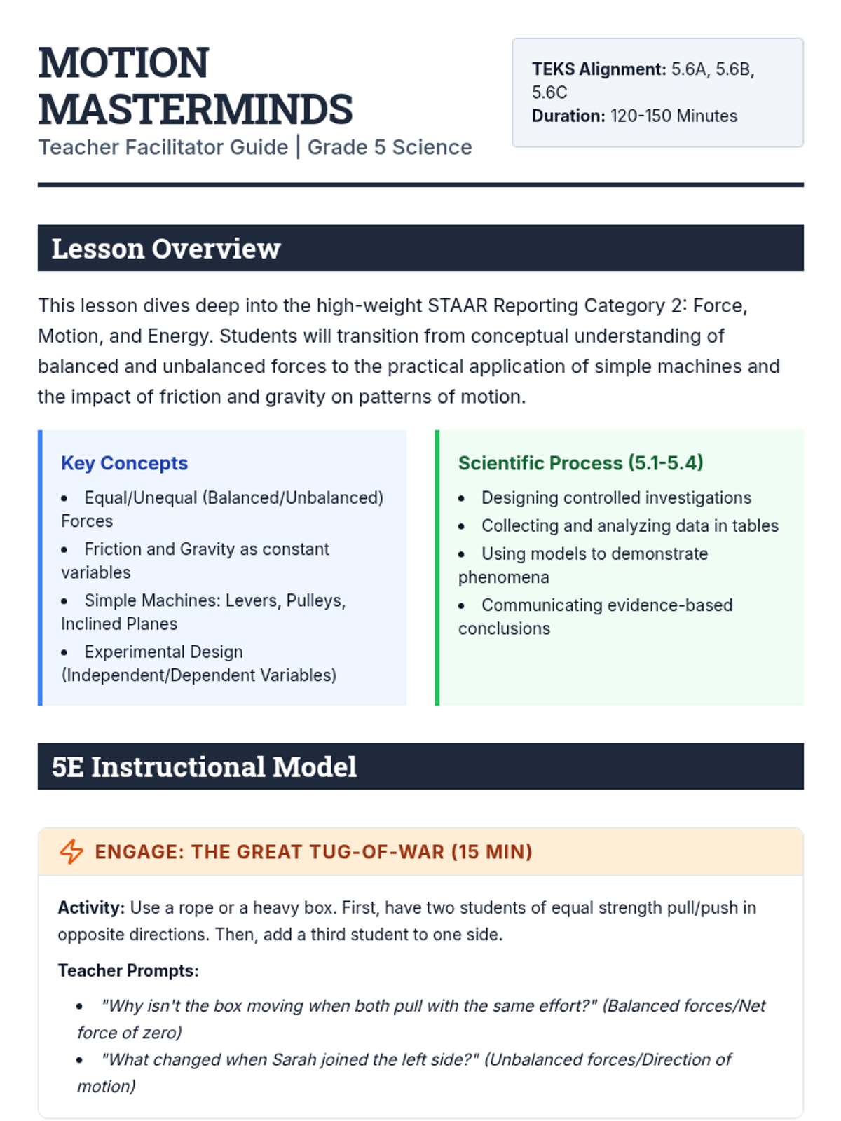 A comprehensive Grade 8 Science lesson focused on Newton's Laws, balanced and unbalanced forces, and energy transformations, specifically designed for STAAR preparation. This lesson uses a 5E instructional model and includes inquiry-based labs and STAAR-aligned assessment questions.