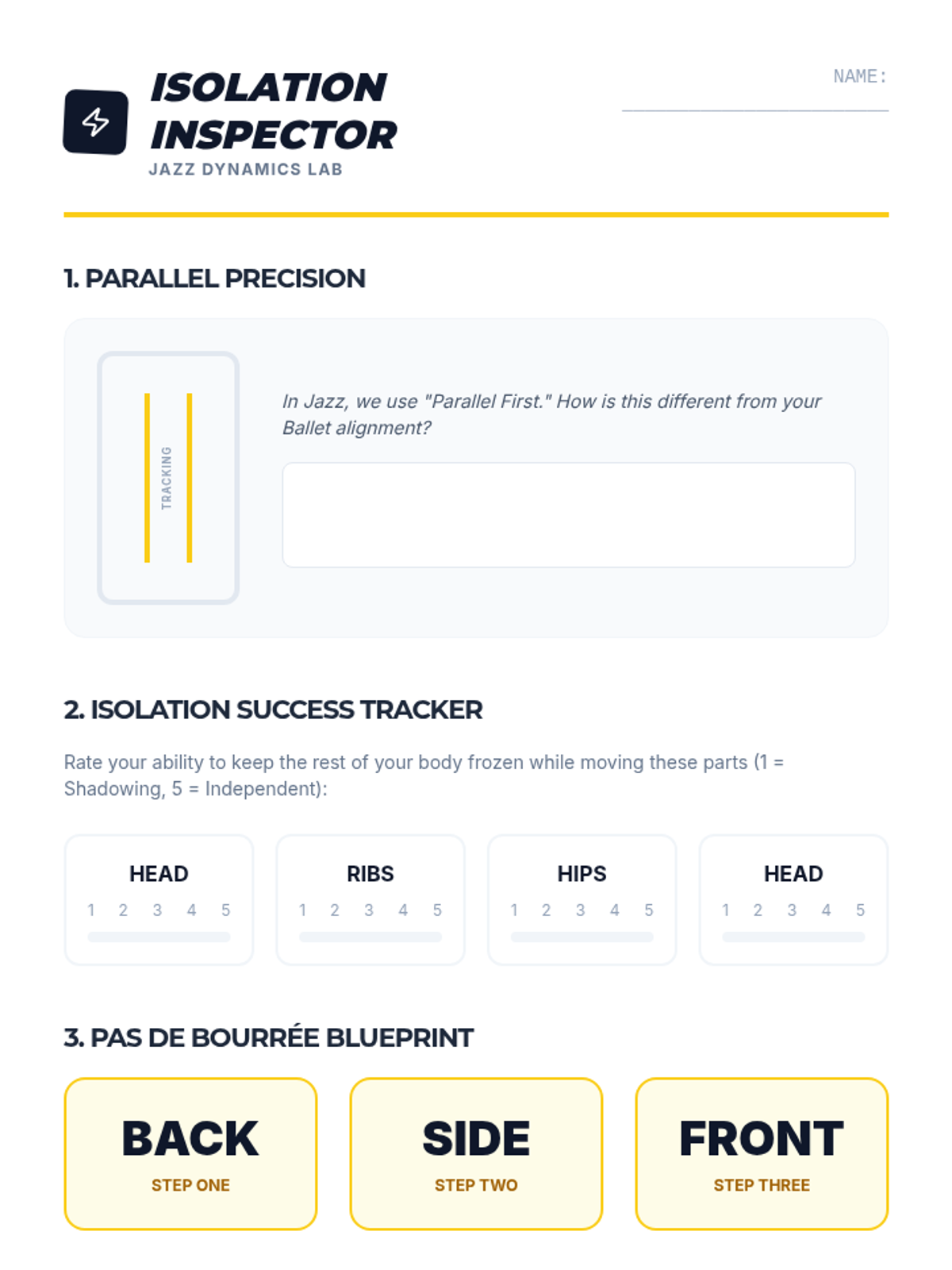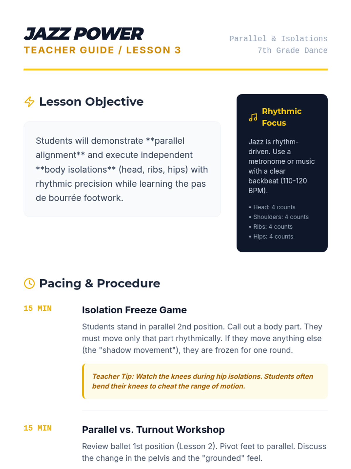 Students transition to parallel alignment, exploring the sharp isolations and grounded energy characteristic of jazz dance.