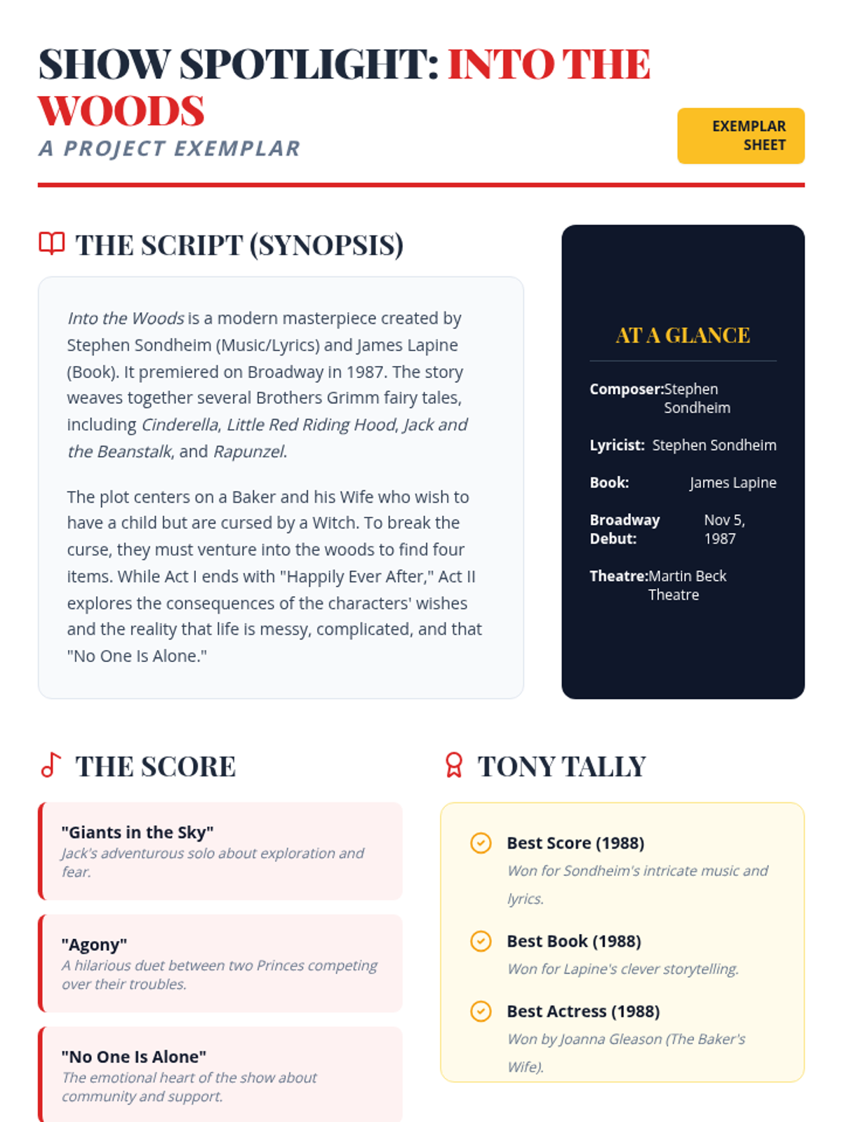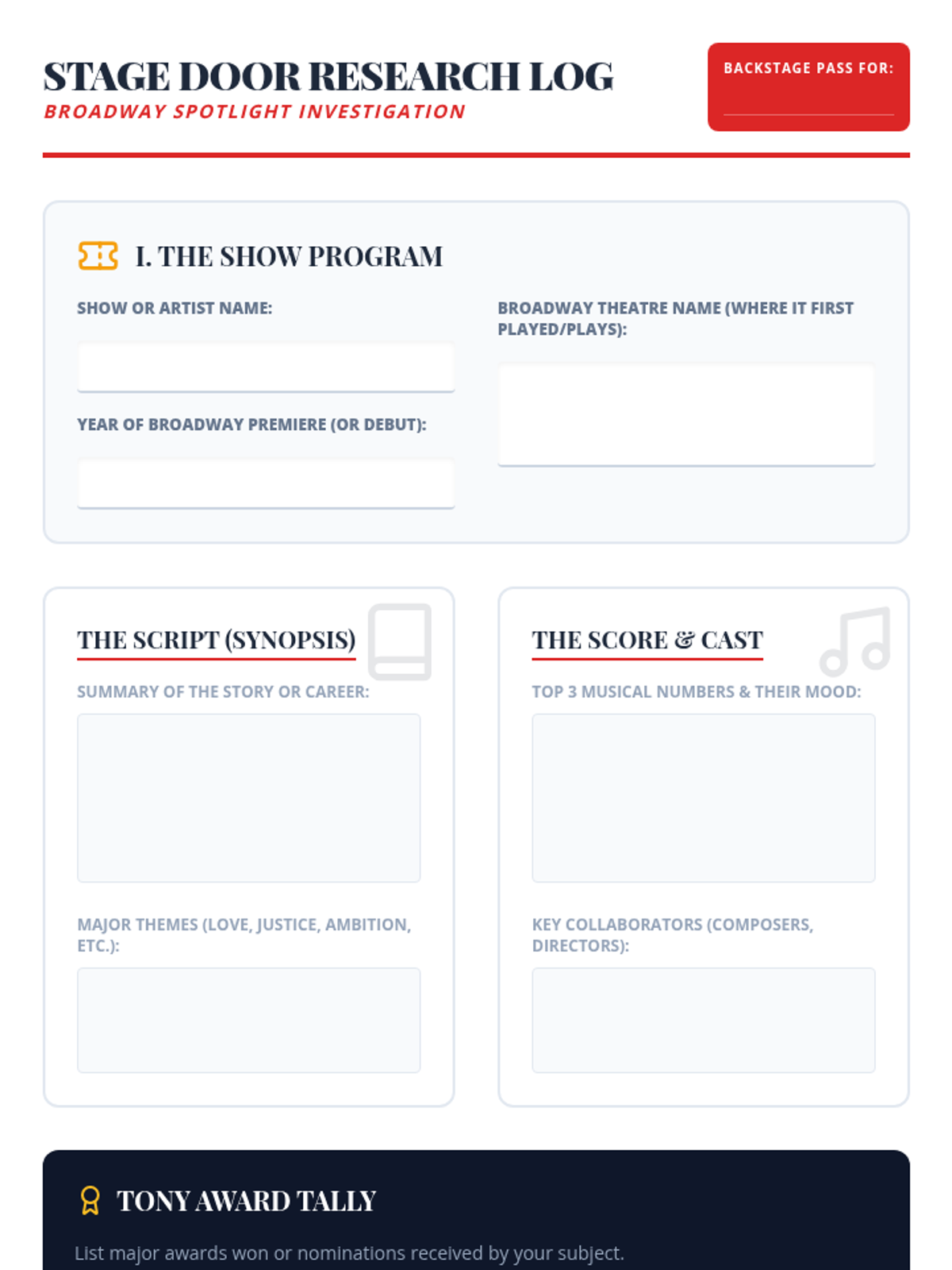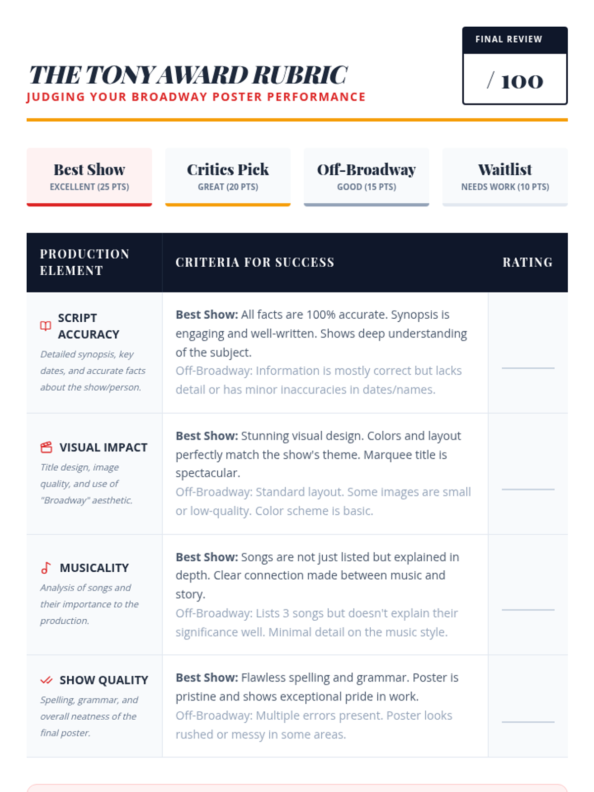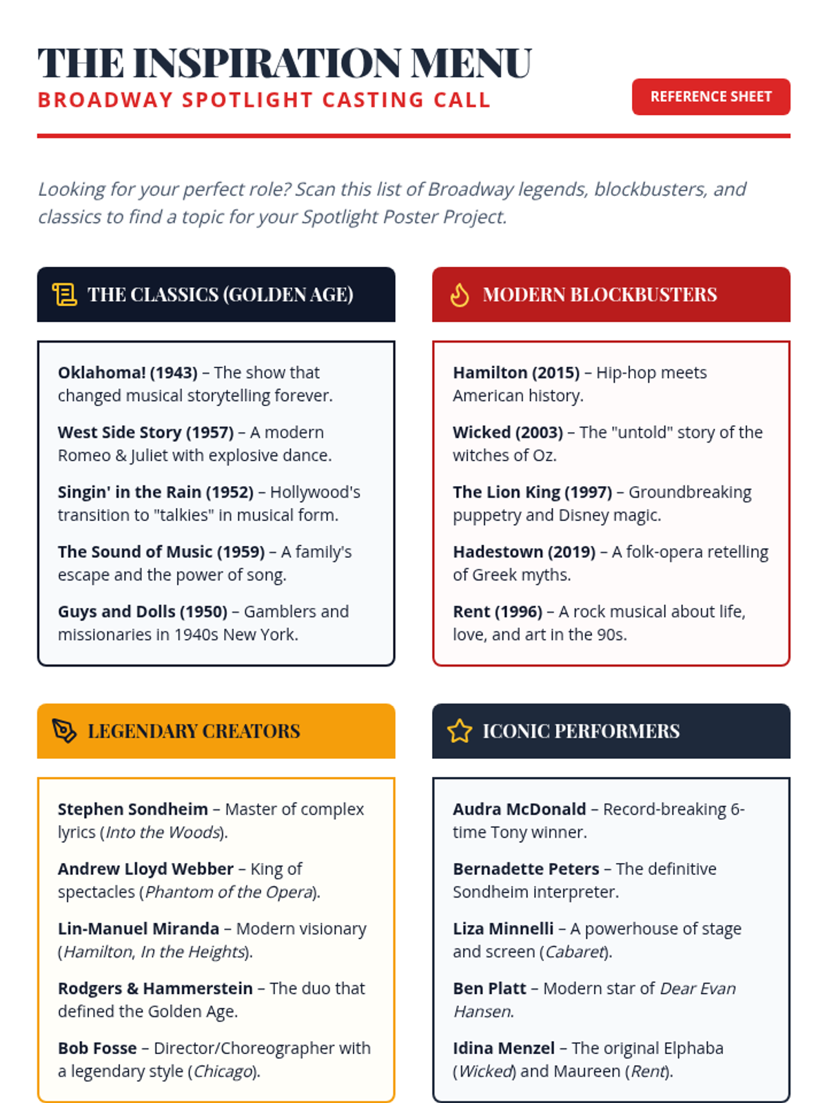 A creative project where students research and present the magic of Broadway. Students can choose a specific musical, a legendary composer, or a famous performer to showcase on an informational poster.