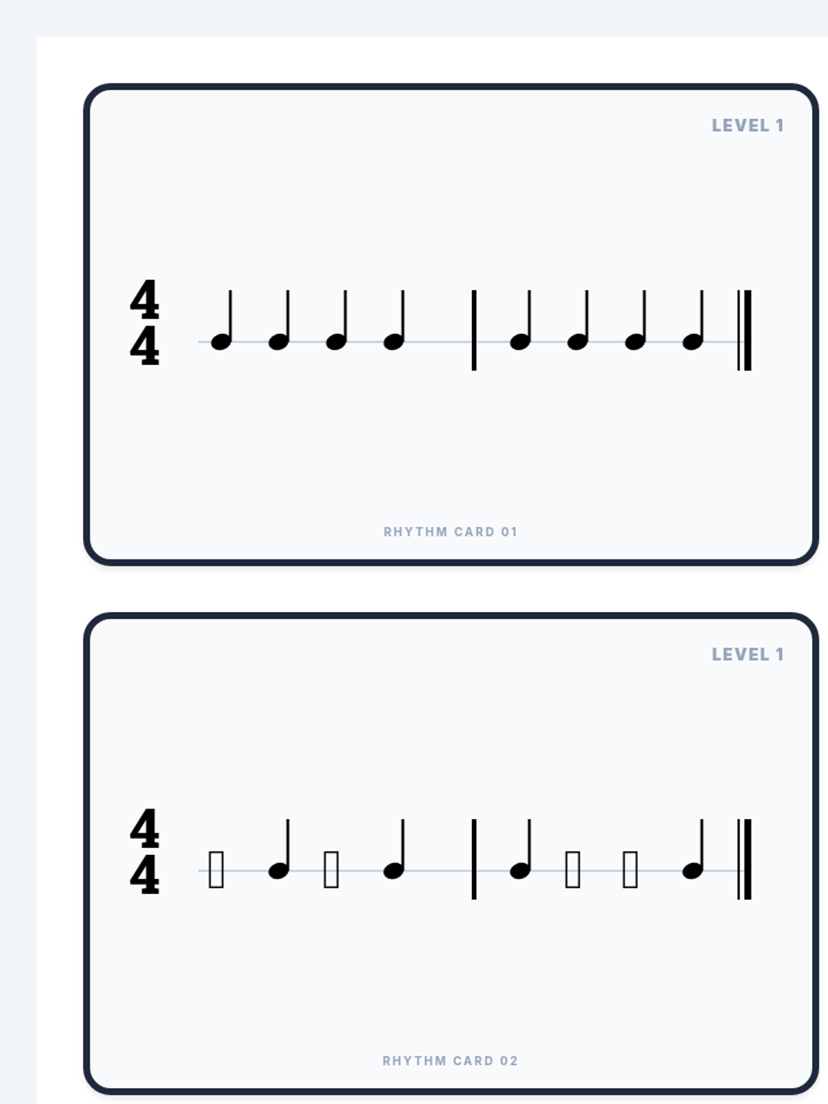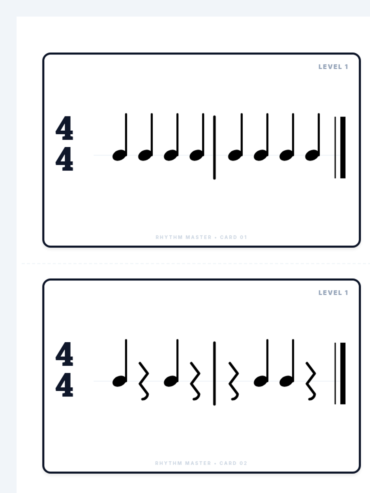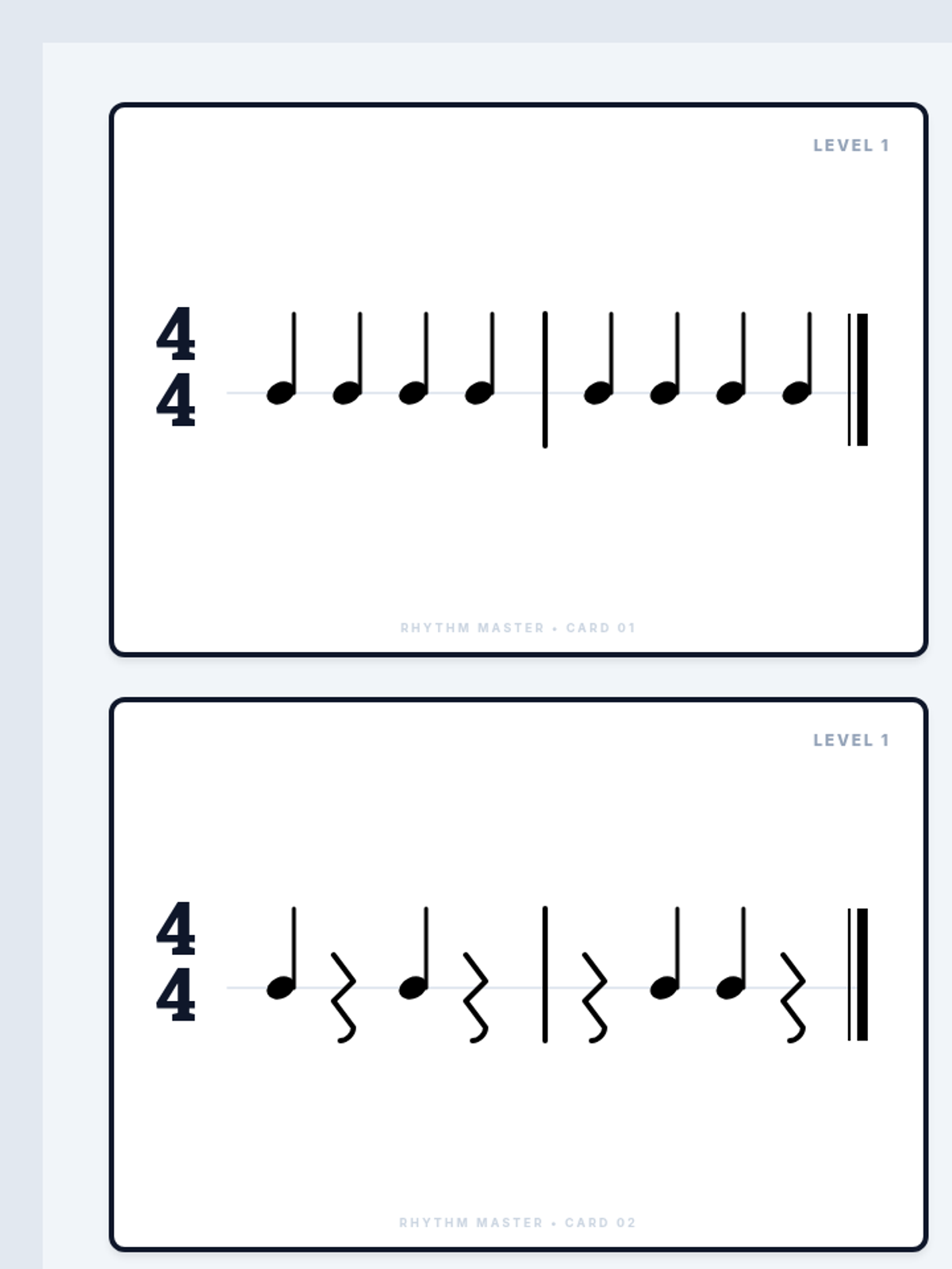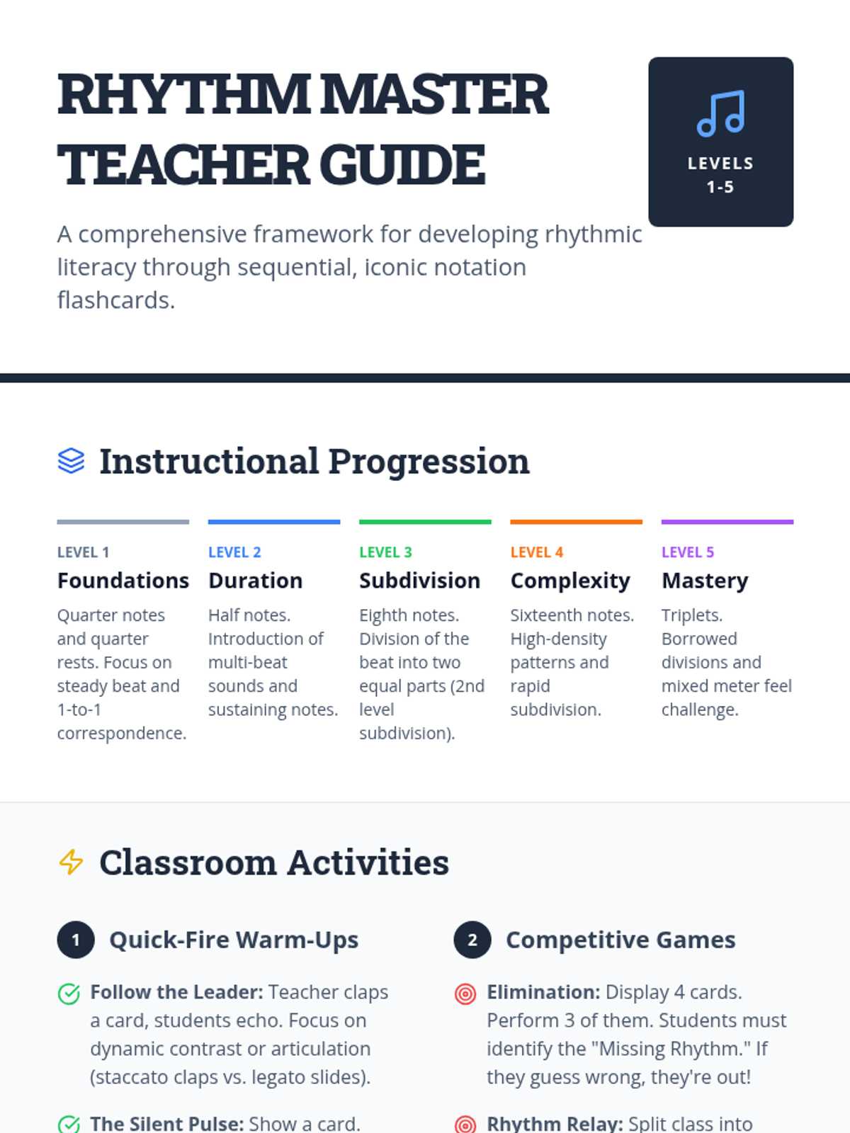 A series of rhythm reading flashcards and a teacher's guide covering basic to advanced rhythmic patterns. Activities progress from quarter notes and rests to complex sixteenth notes and triplets across multiple time signatures.