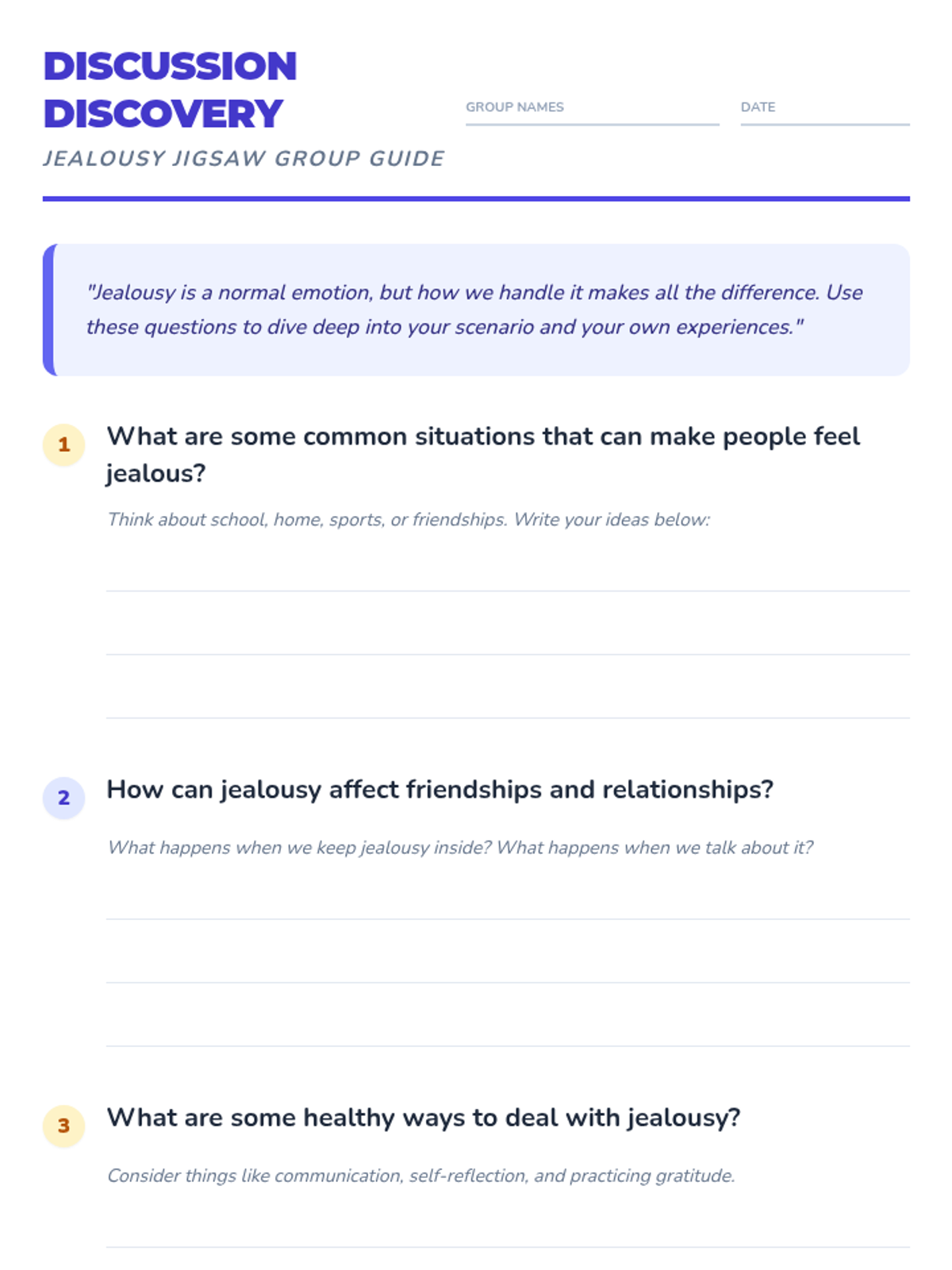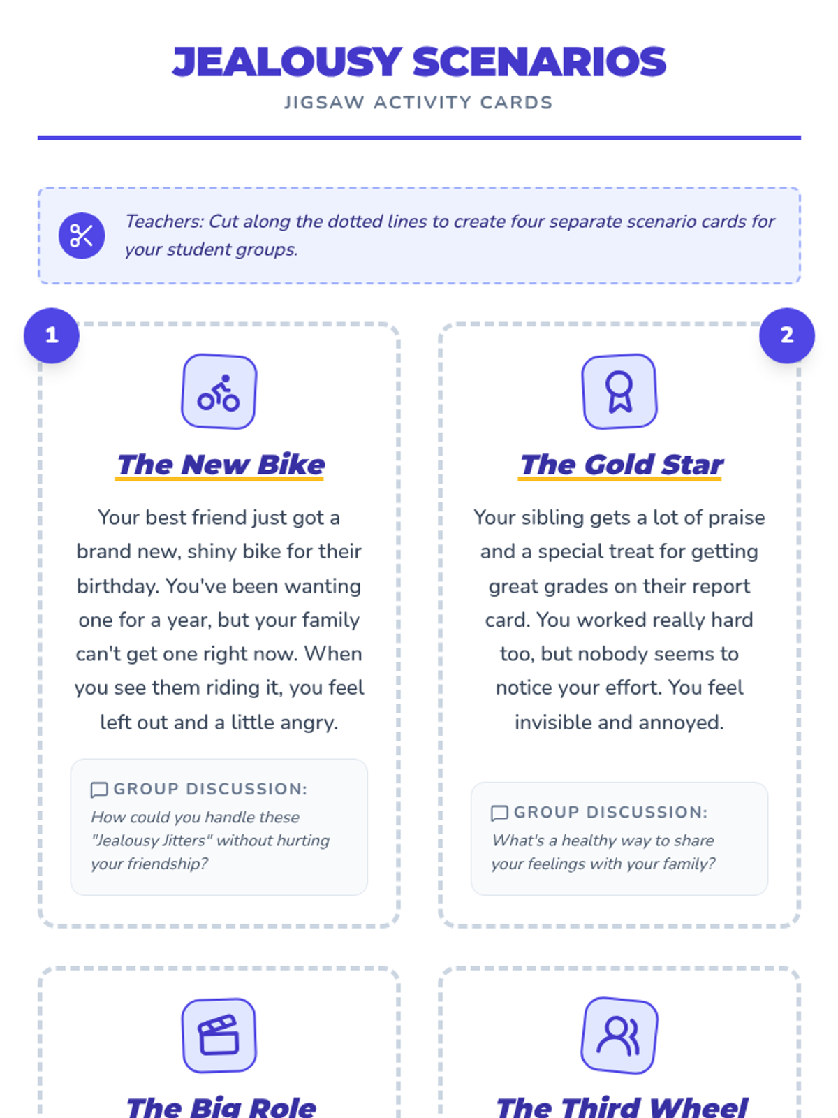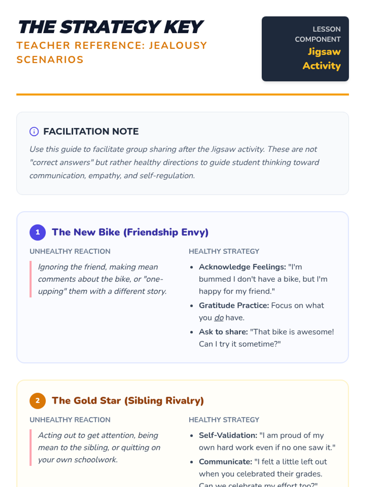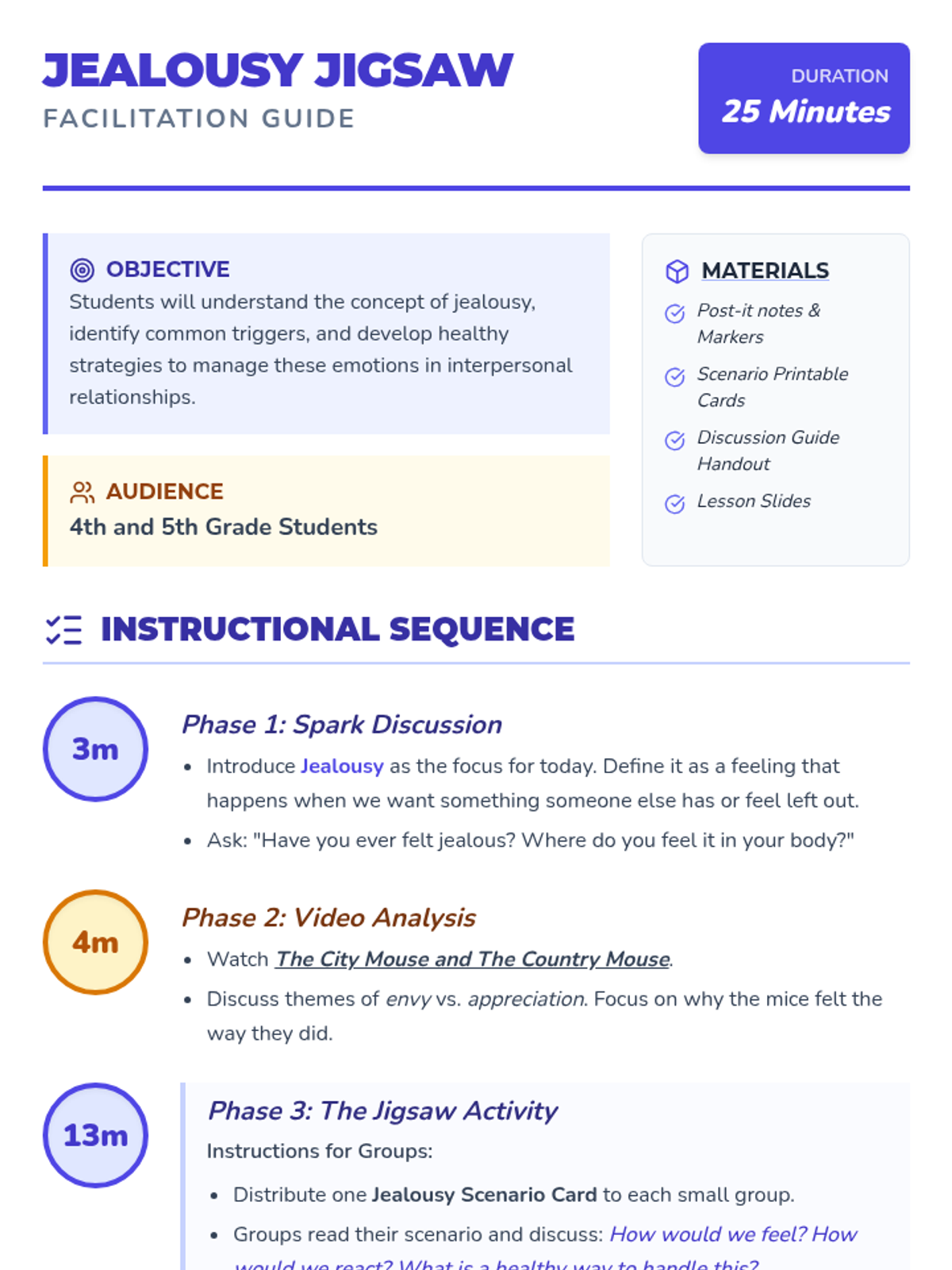 A cooperative learning lesson where 4th and 5th-grade students explore the concept of jealousy through a jigsaw activity, scenario analysis, and a classic fable.