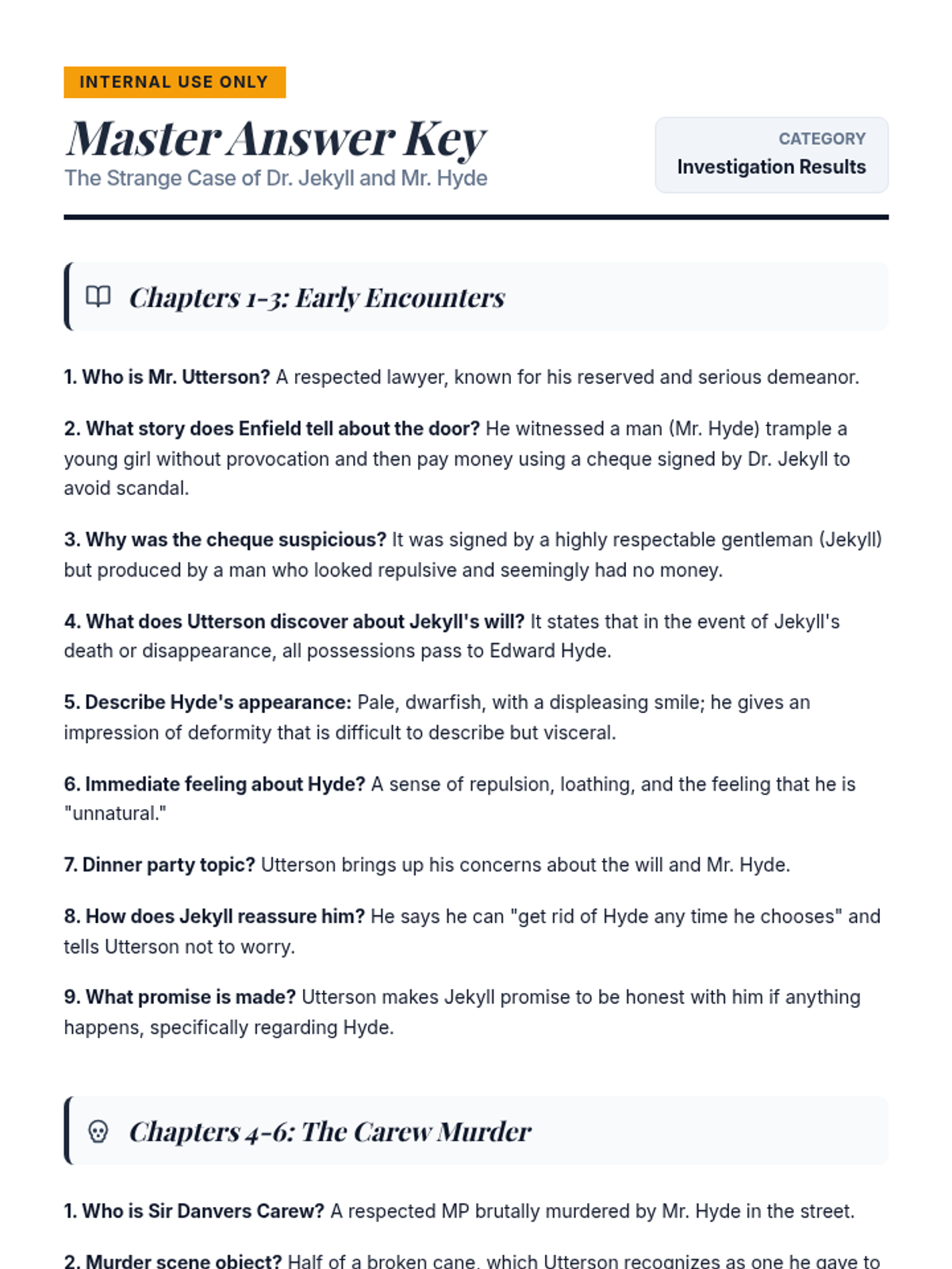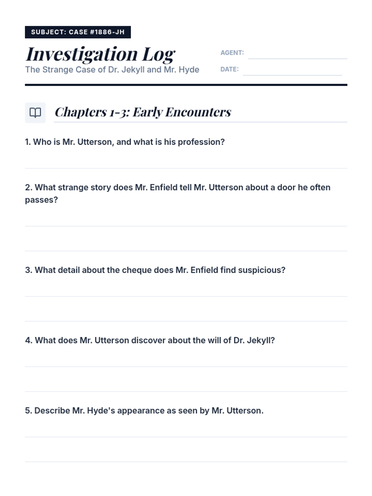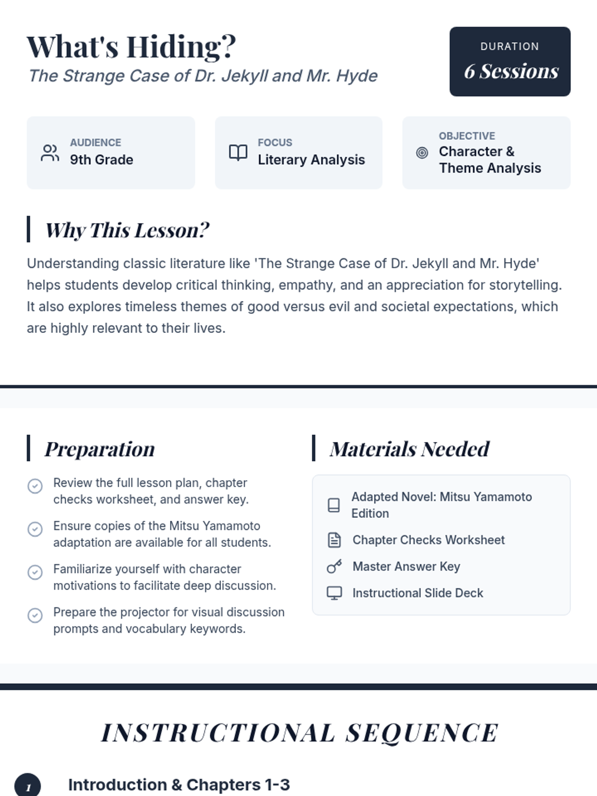 Explore the dual nature of humanity through 'The Strange Case of Dr. Jekyll and Mr. Hyde' in this 6-session 9th-grade sequence. Students analyze character, plot, and themes while developing critical reading skills through chapter-by-chapter investigations.