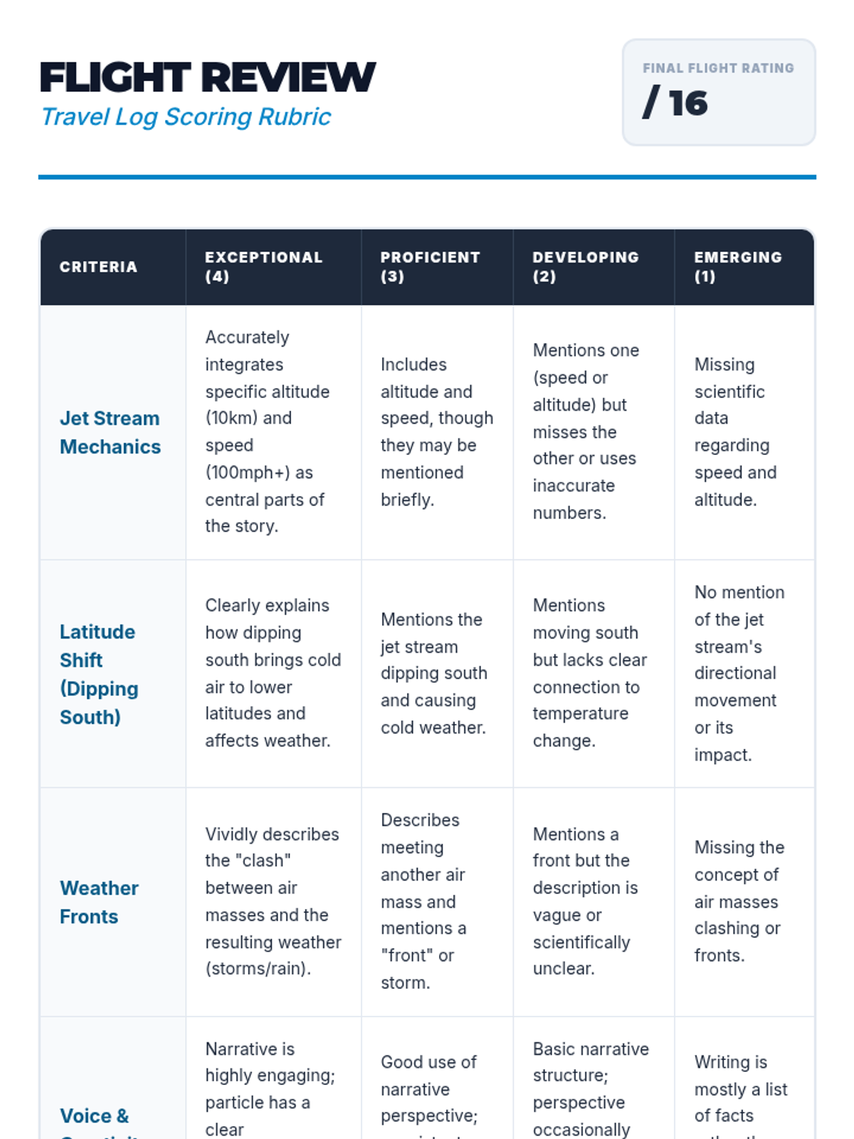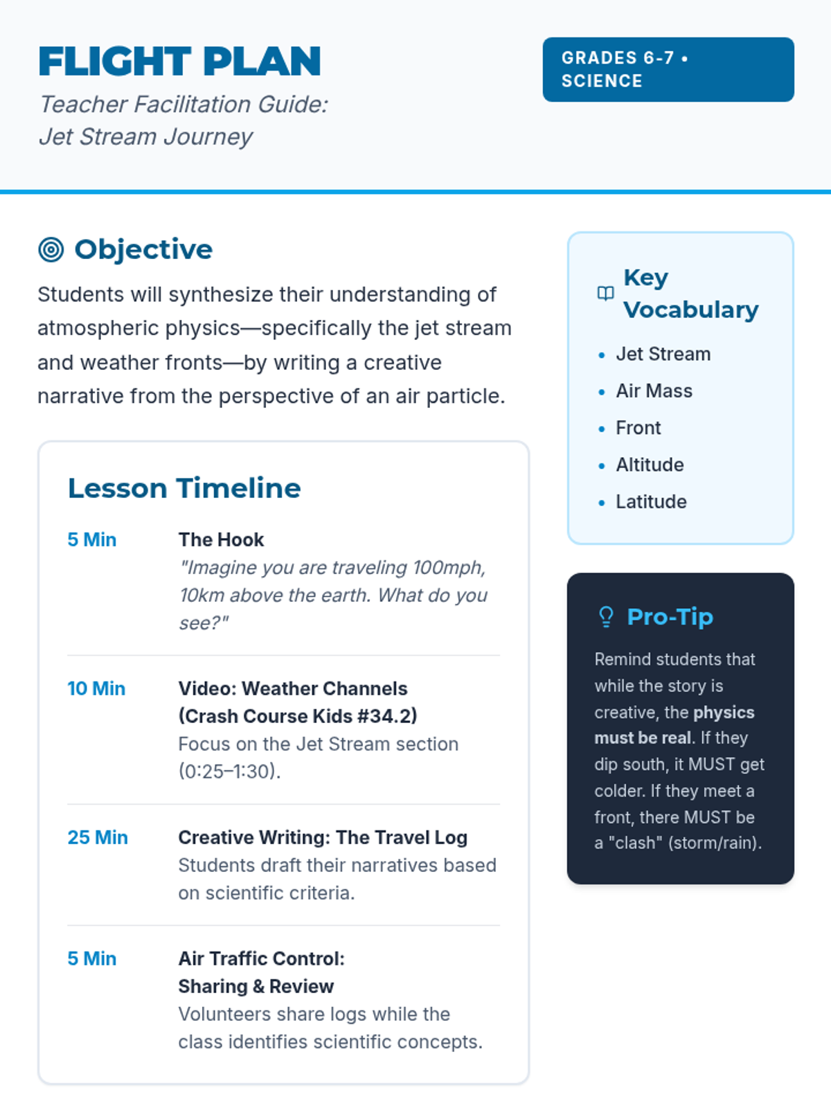 Students explore the mechanics of the jet stream and weather fronts by writing a creative narrative from the perspective of an air particle traveling high in the atmosphere. The lesson includes a hook, a video analysis, and a creative writing 'Travel Log' activity.