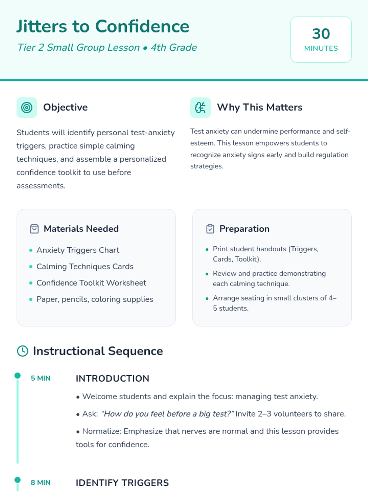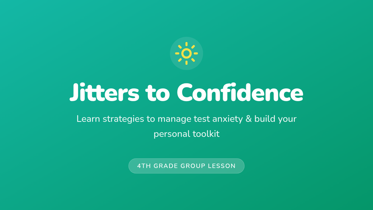 A 30-minute Tier 2 group lesson for 4th graders focused on identifying test anxiety triggers and building a personalized confidence toolkit through calming techniques and peer support.