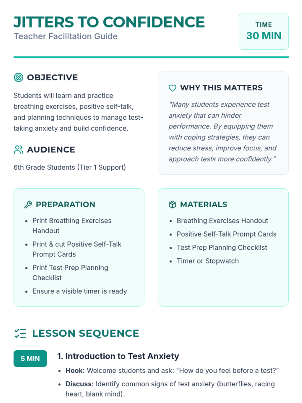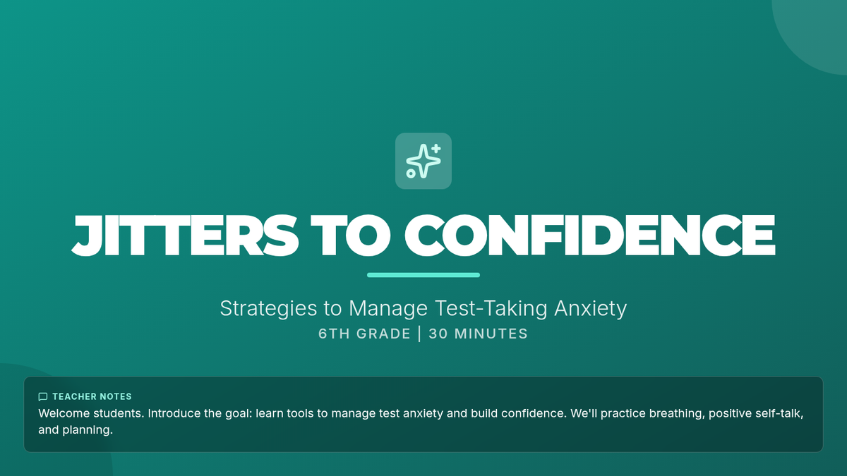 A 30-minute Tier 1 lesson for 6th graders focused on managing test-taking anxiety through breathing exercises, positive self-talk, and planning techniques.