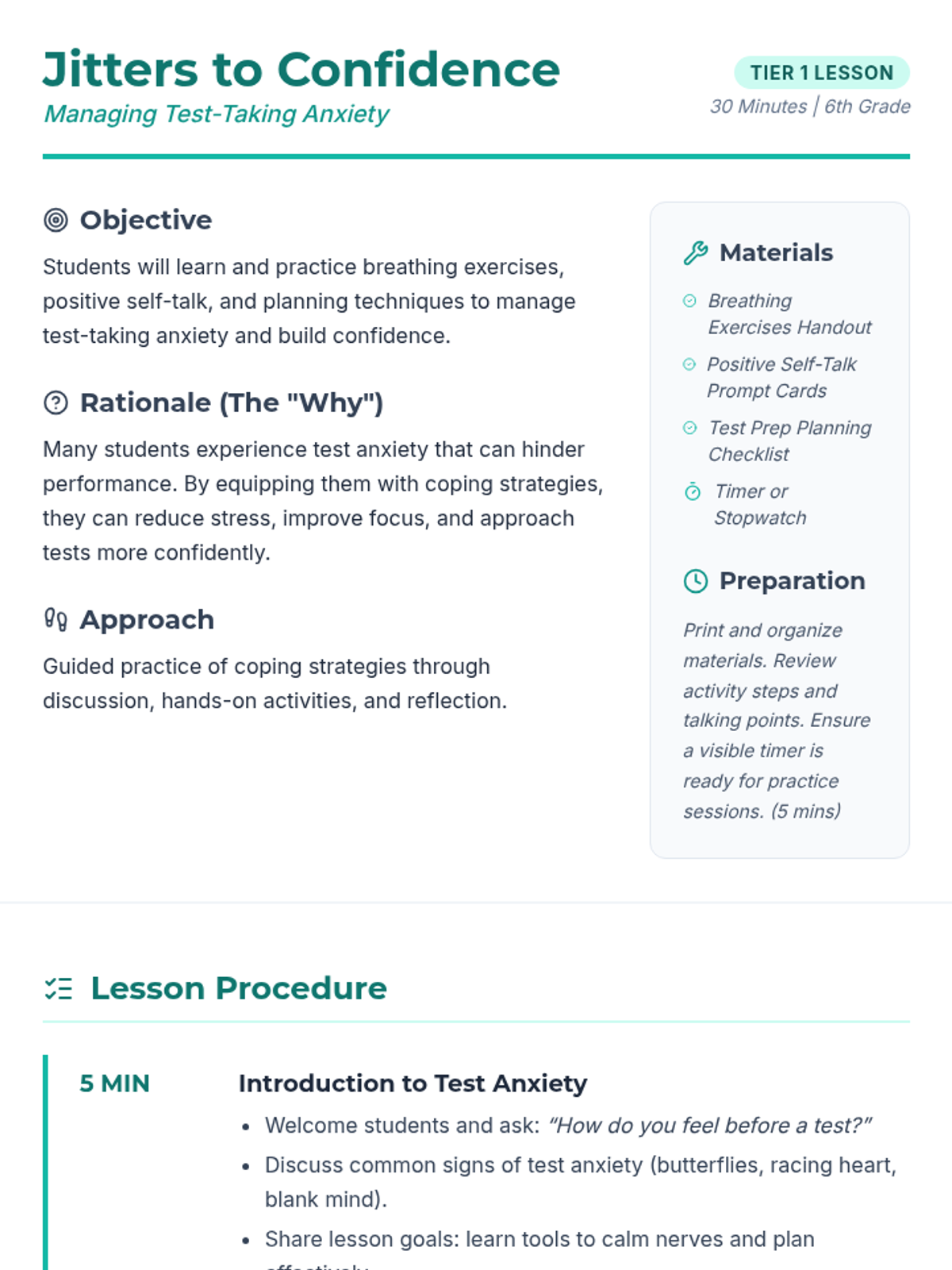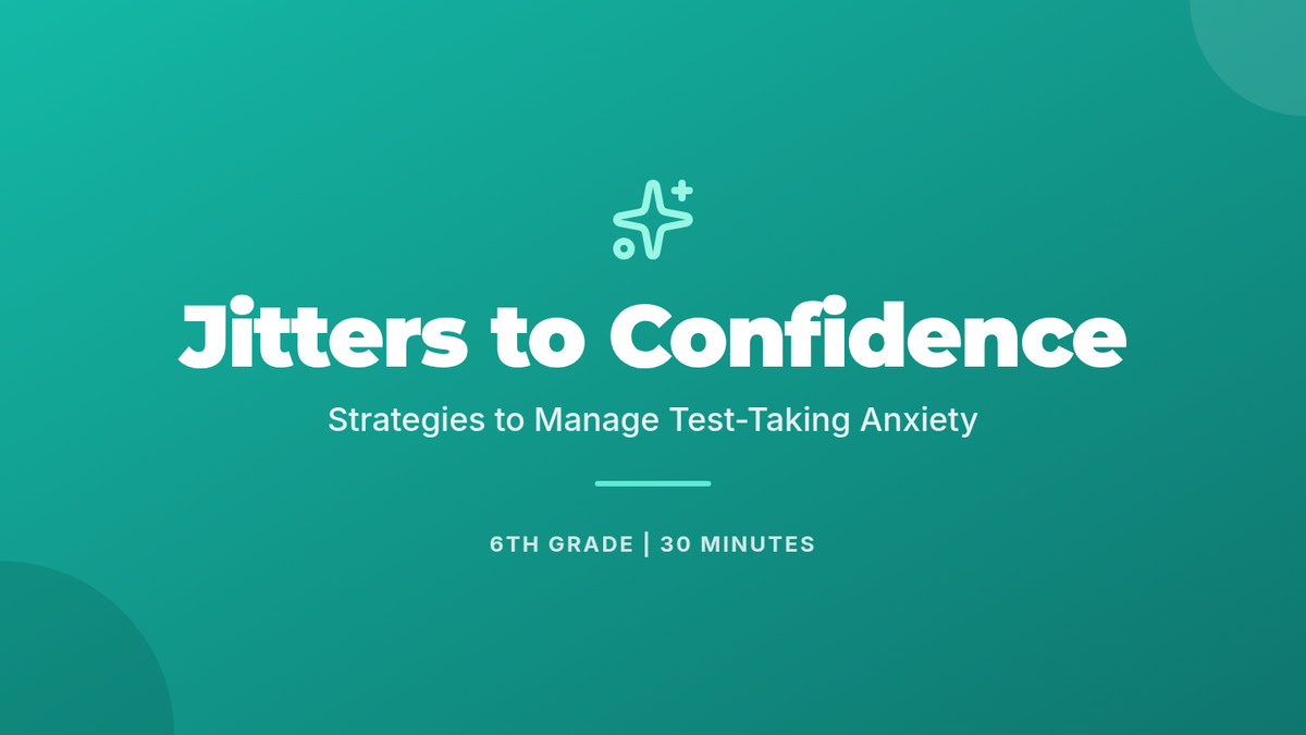A 30-minute Tier 1 lesson for 6th graders designed to teach strategies for managing test anxiety through breathing exercises, positive self-talk, and effective planning.