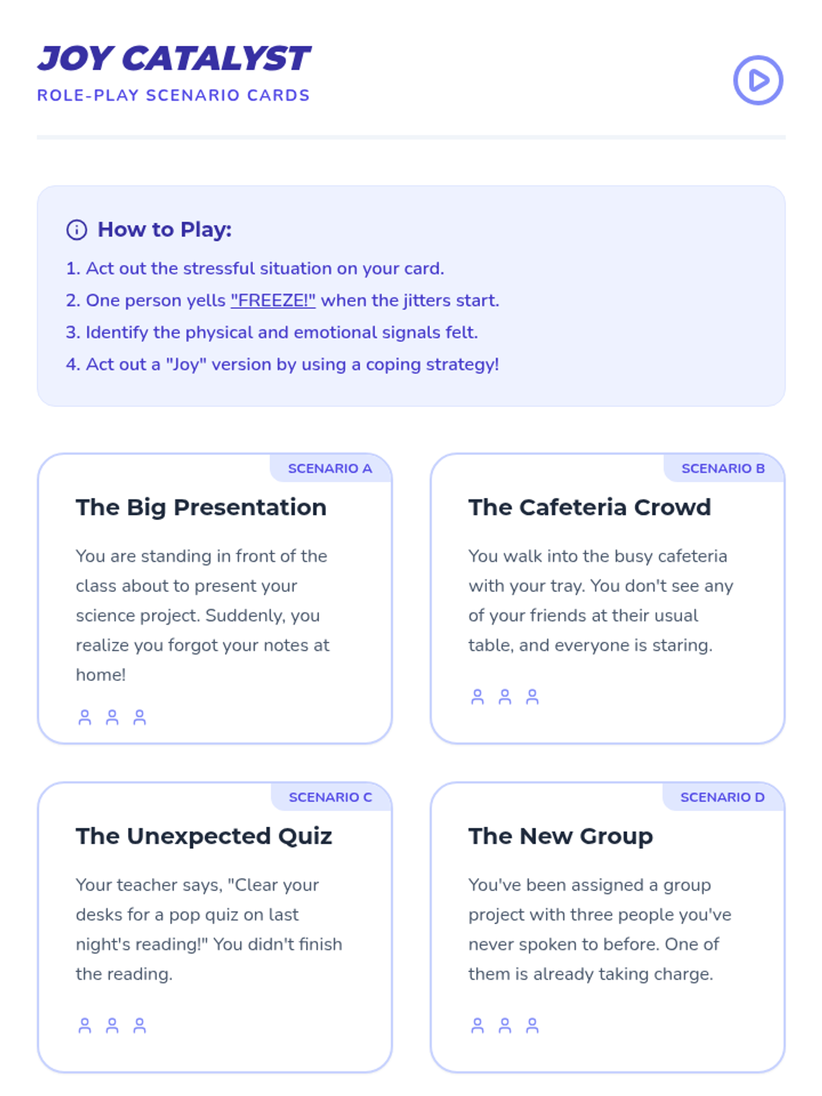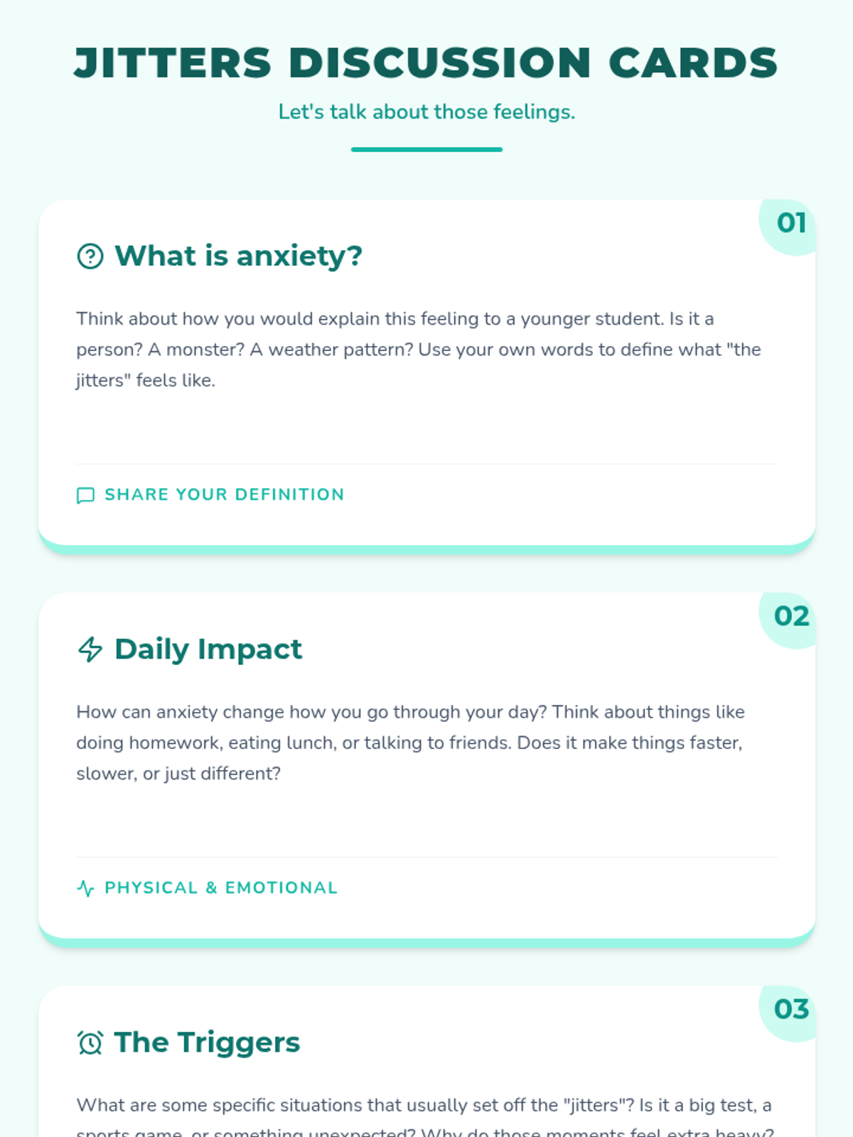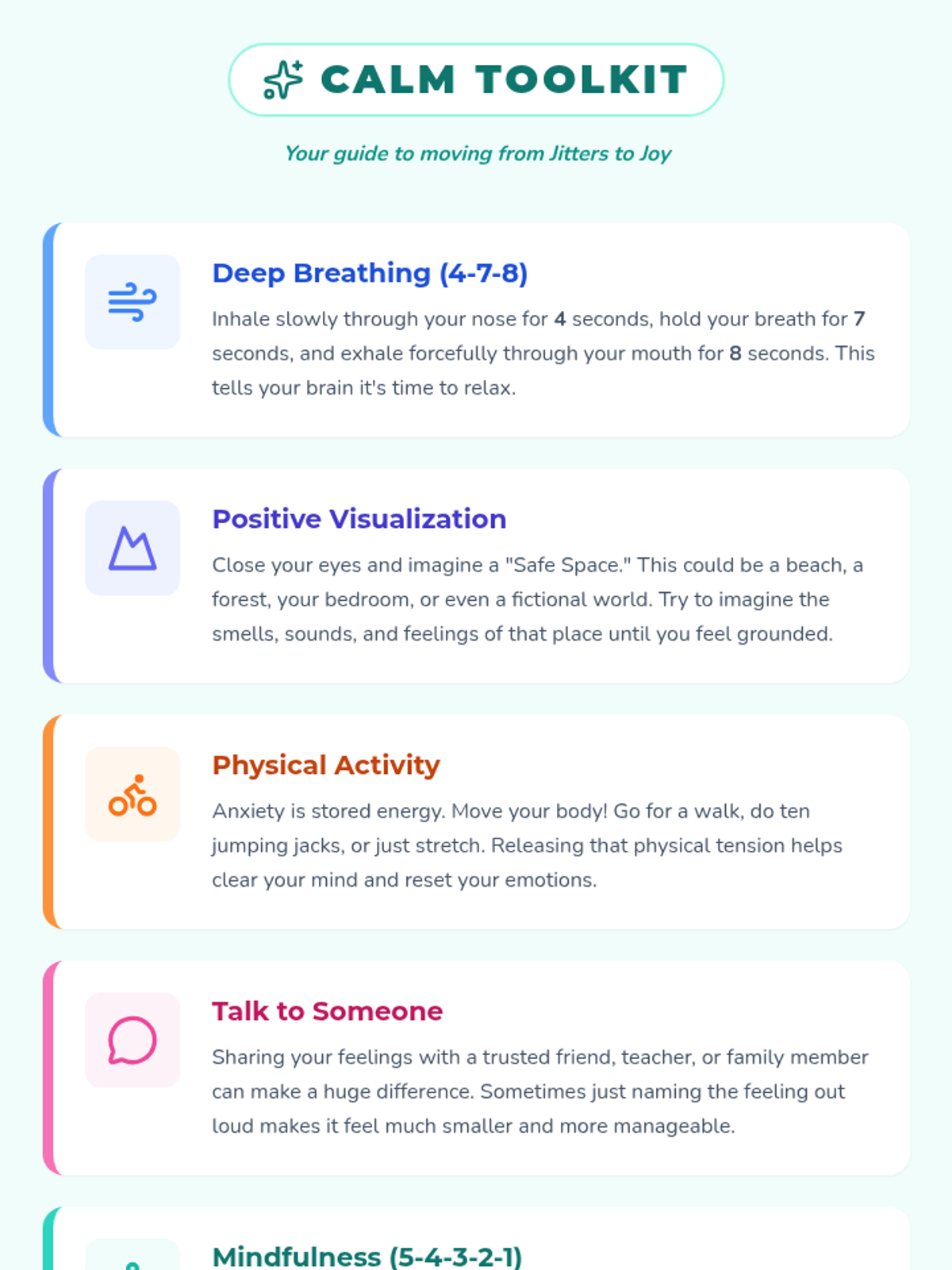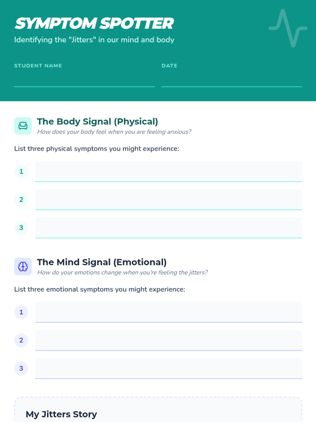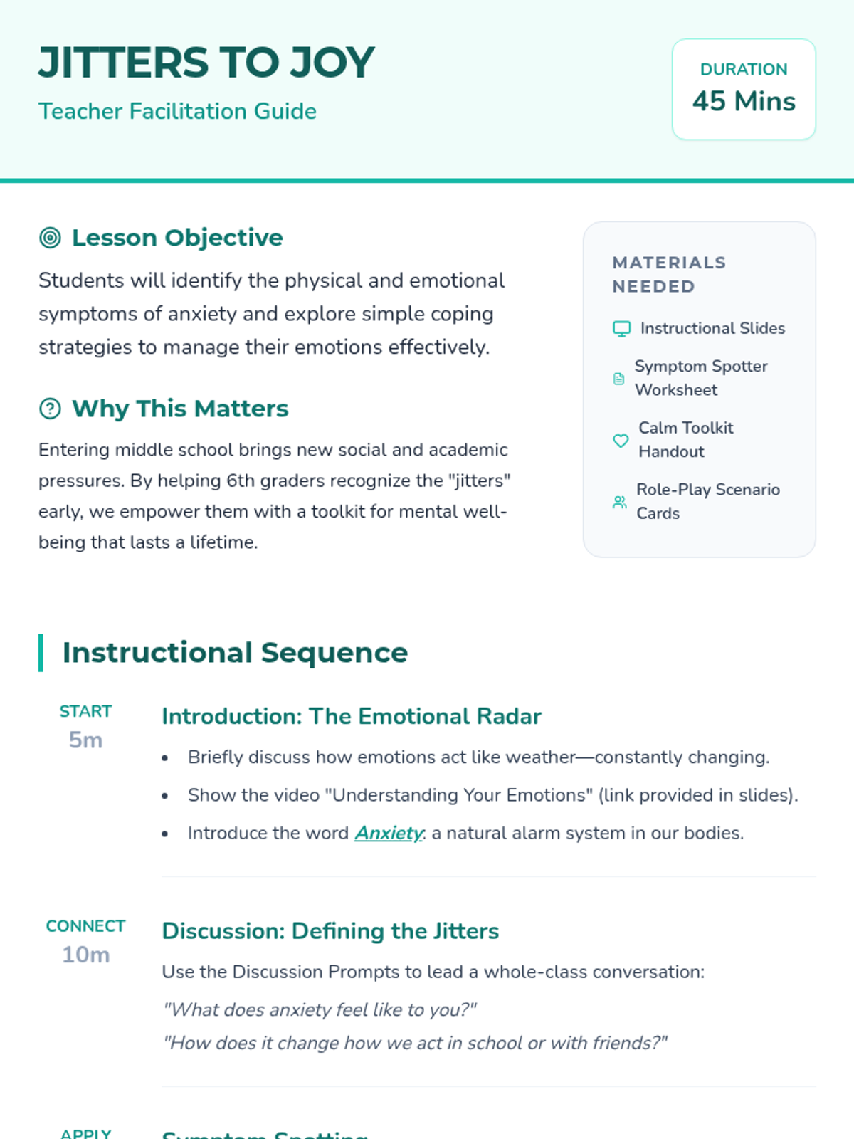 A 45-minute lesson designed to help 6th graders identify anxiety symptoms and learn effective coping strategies to manage their emotions. Students will progress from understanding the 'jitters' to discovering 'joy' through interactive discussion and role-play.