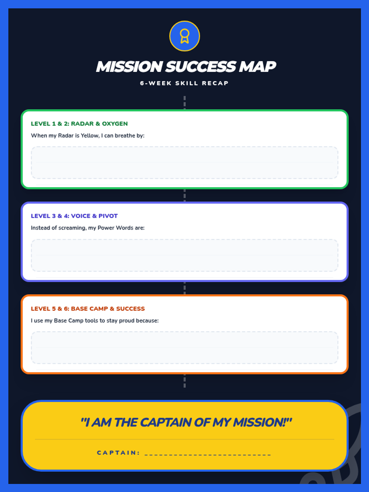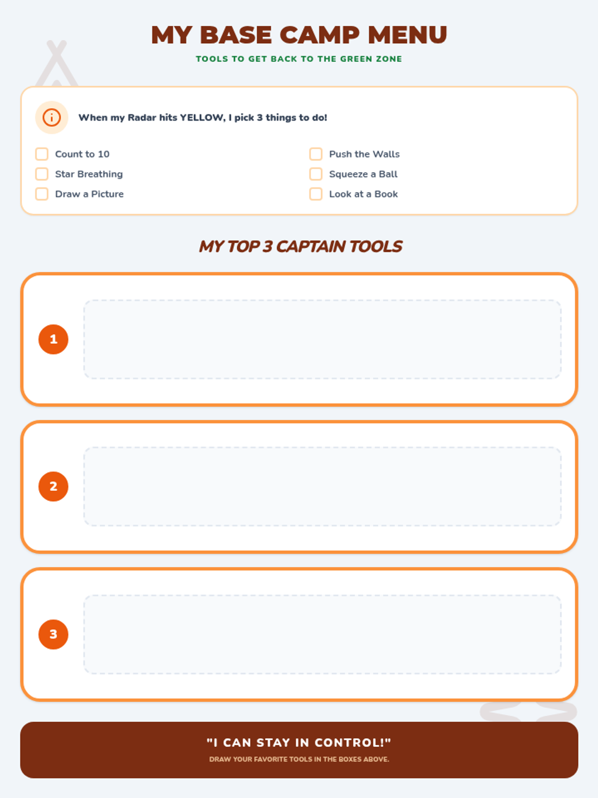 Creating a personal 'Base Camp' (Calm-Down Corner) toolkit with visual reminders of strategies learned in previous weeks.