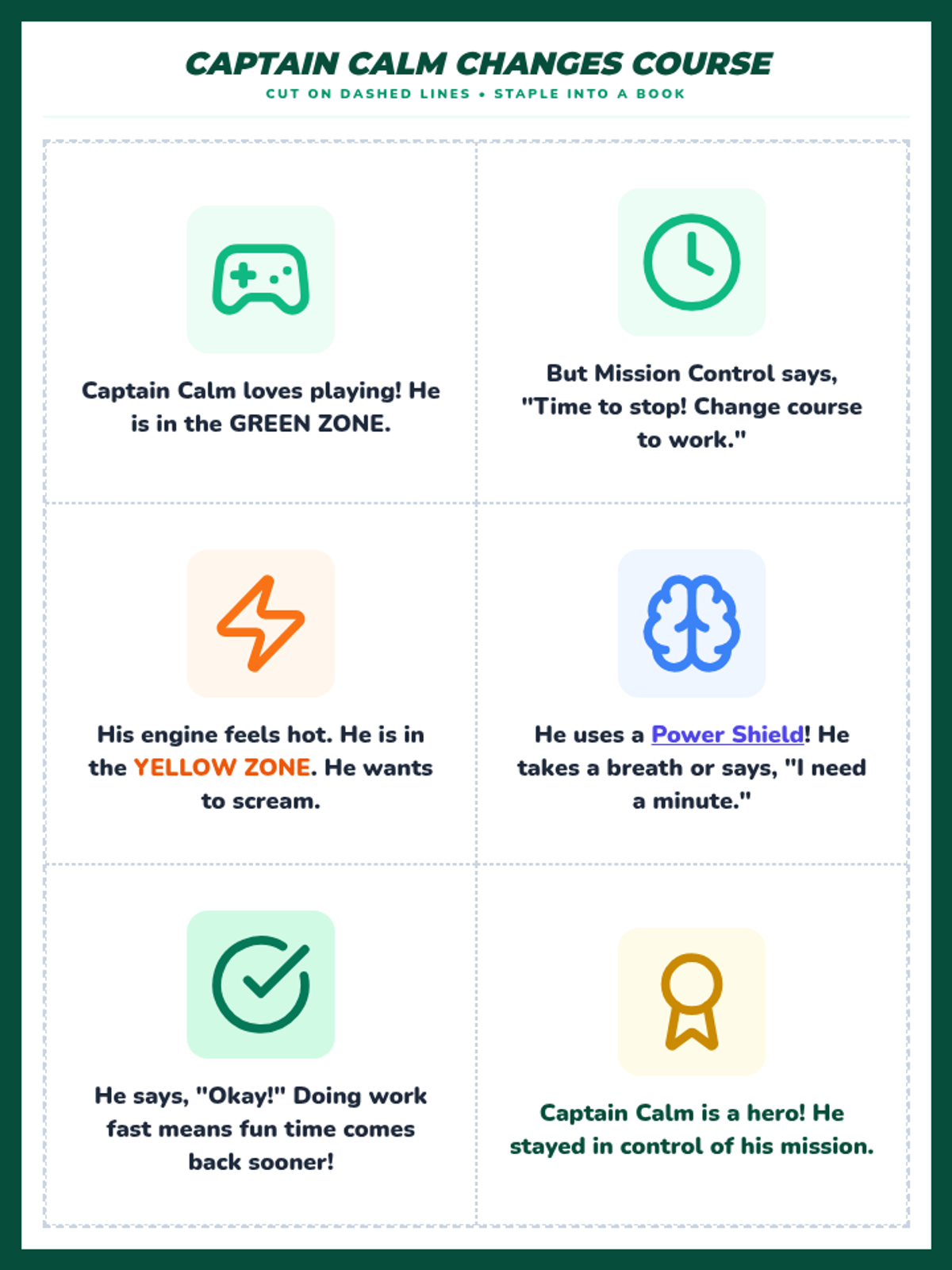 Uses social stories and role-play to practice 'pivoting' when faced with unwanted tasks or transitions, focusing on calm compliance and compromise.