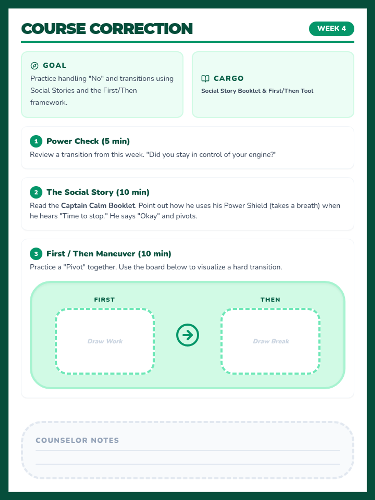 Focuses on specific school-day challenges that might be causing morning anxiety. Using 'the vault' metaphor, the student learns to identify 'speed bumps' and practices 'vaulting' over them with quick strategies.