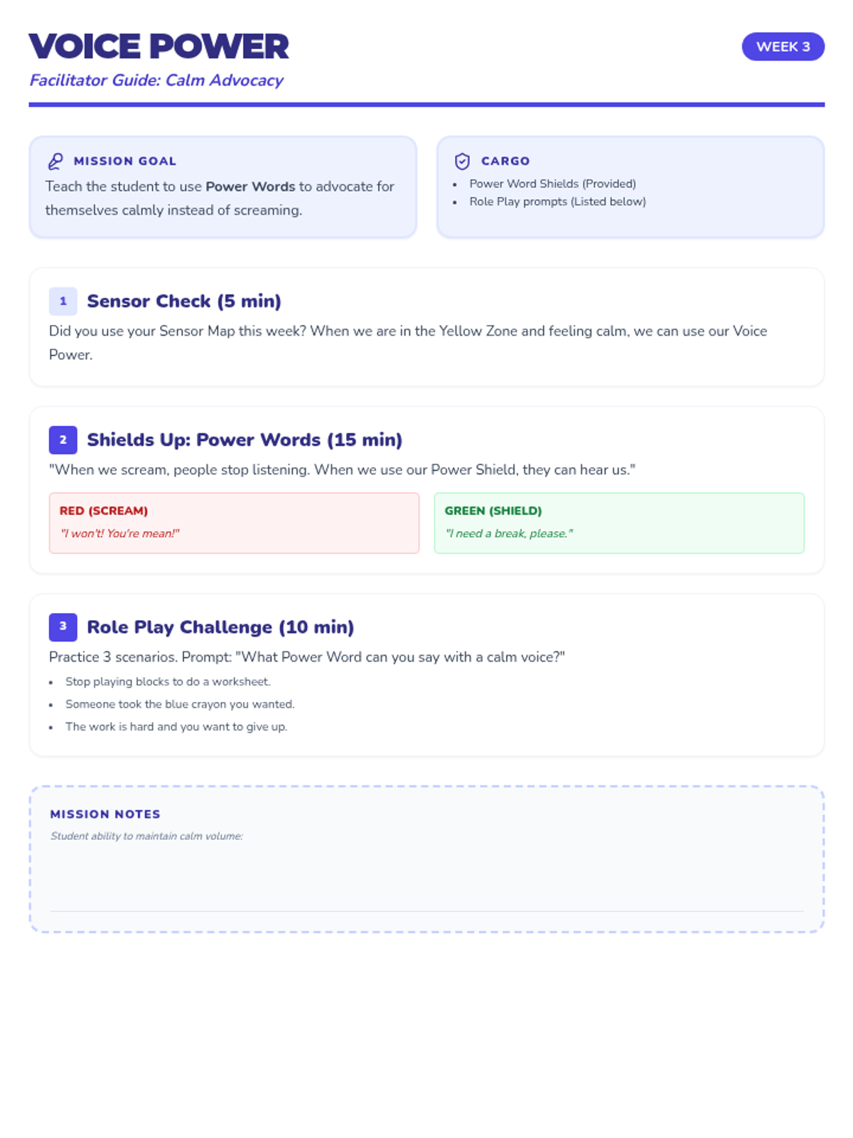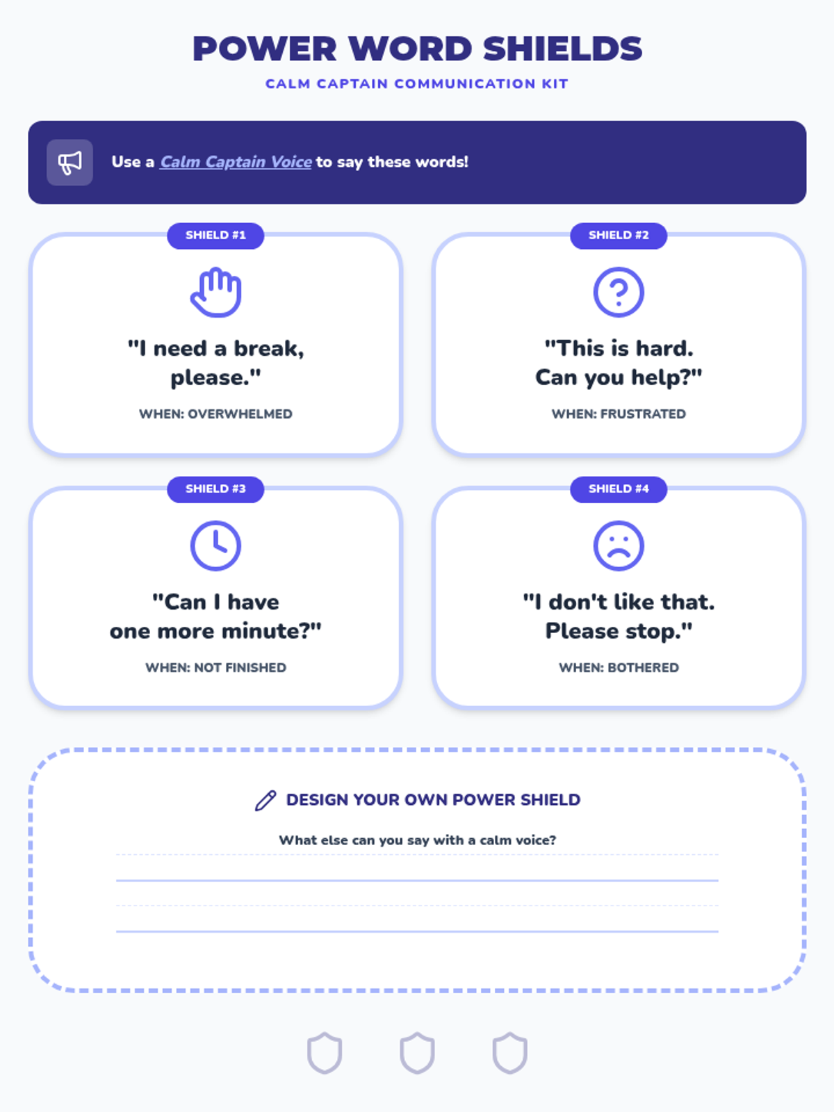 Focuses on calm self-advocacy and using 'Power Words' to express dislikes or frustrations without resorting to shouting or threats.
