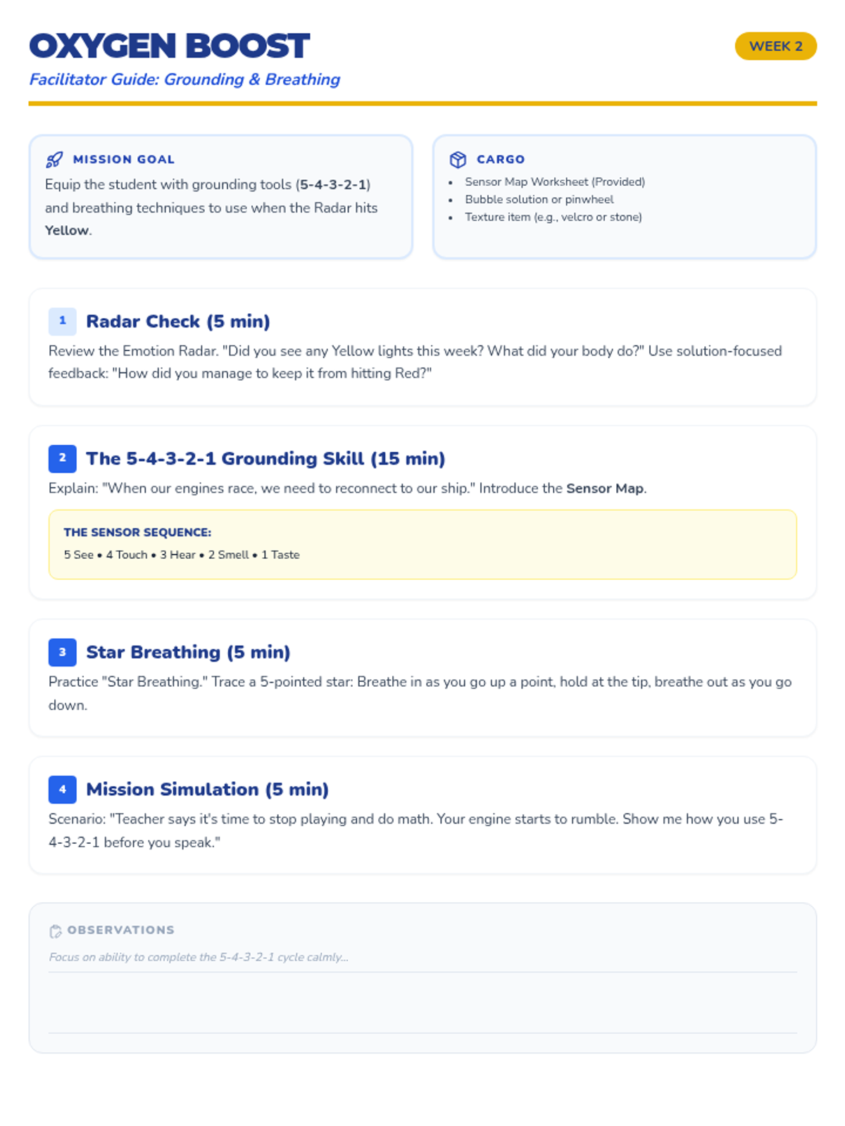 Teaching grounding skills and 5-4-3-2-1 breathing techniques to help students stabilize their emotions when they feel their 'engines' overheating.