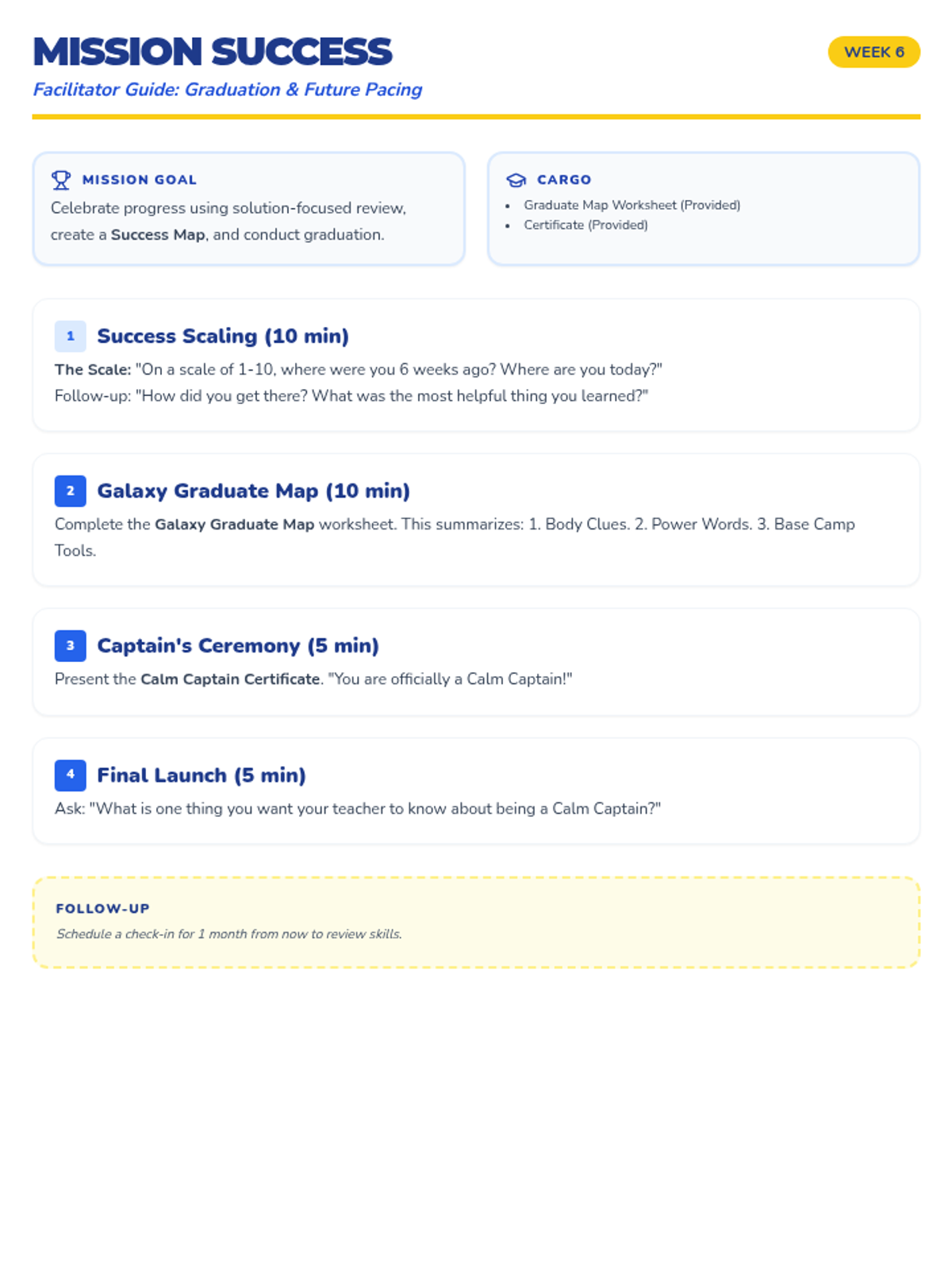 A solution-focused review of progress, graduation ceremony, and creating a 'Success Map' for future challenges.