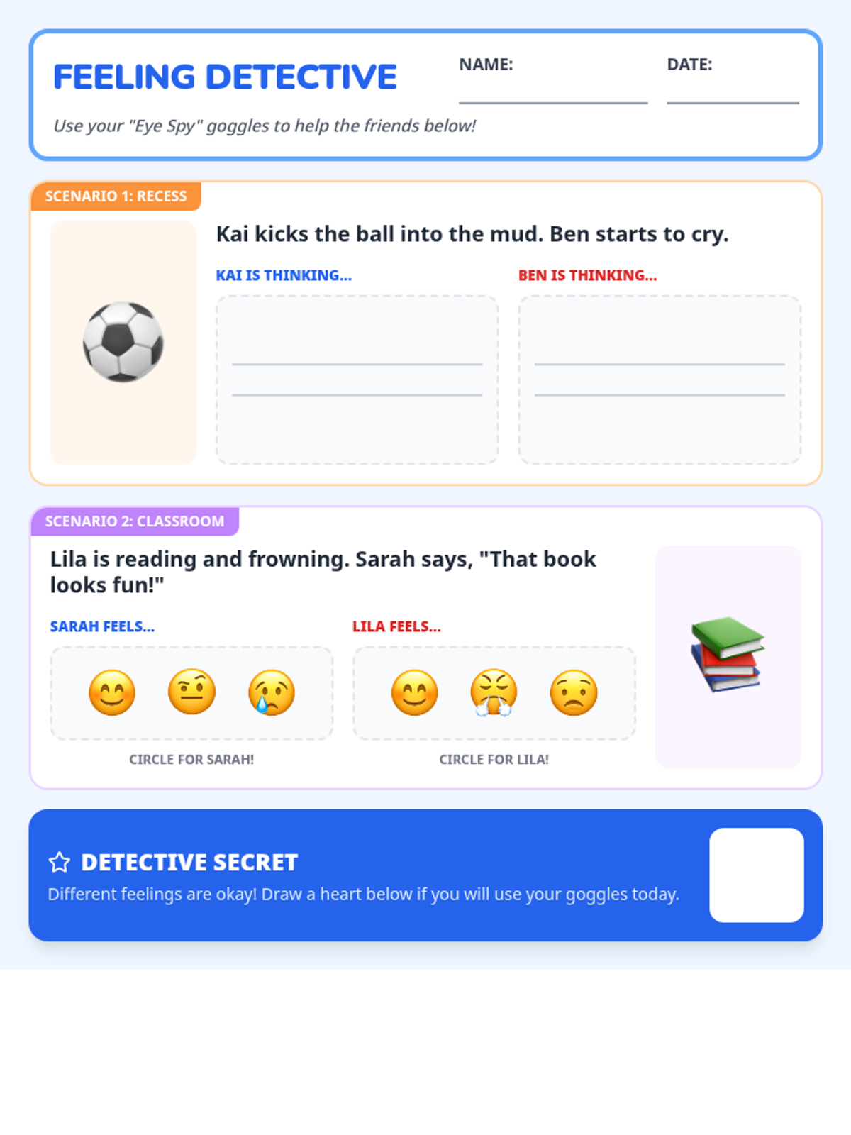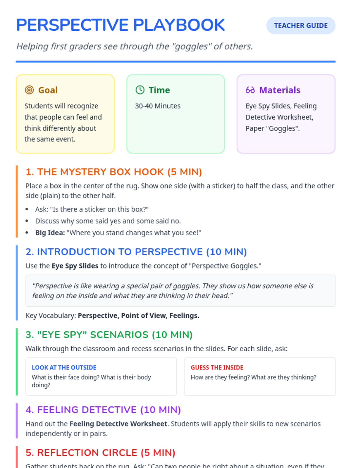A foundational lesson for first graders on understanding that different people can have different thoughts and feelings about the same situation, focusing on common school scenarios.