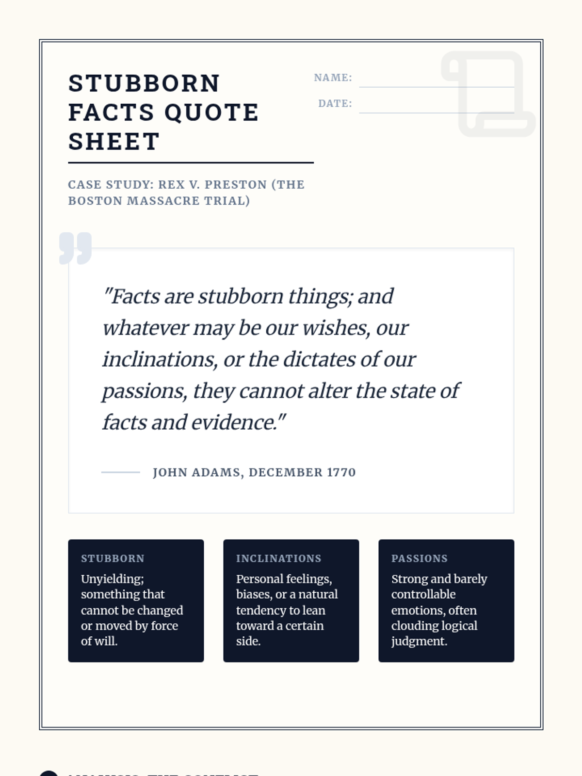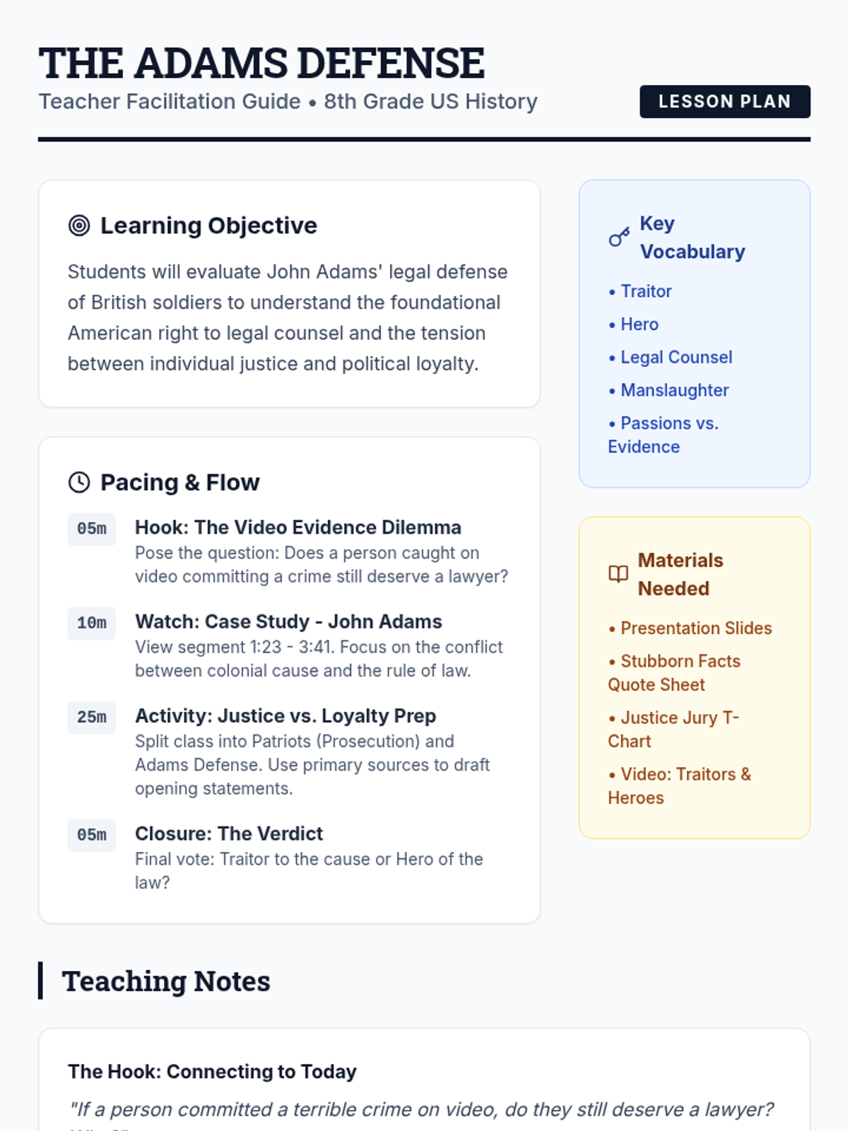 This lesson explores John Adams' controversial decision to defend British soldiers after the Boston Massacre, challenging students to weigh the importance of legal rights against political loyalty.