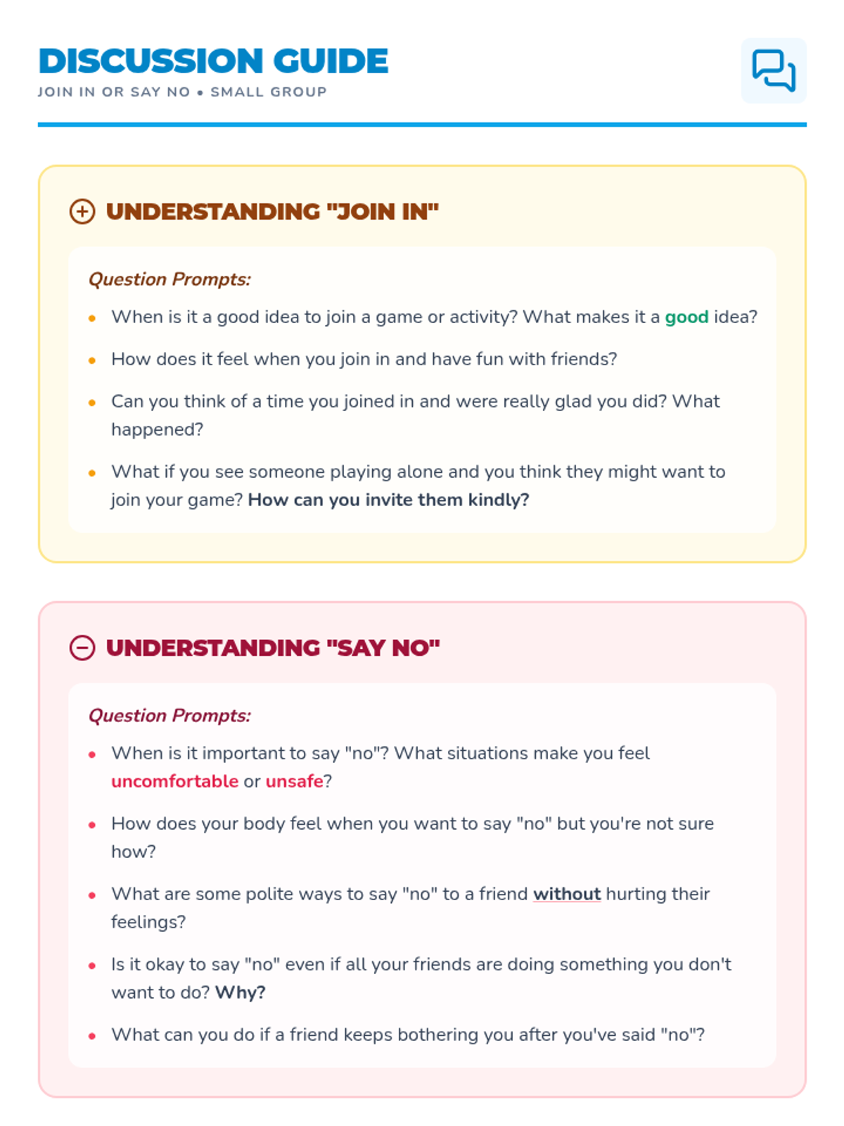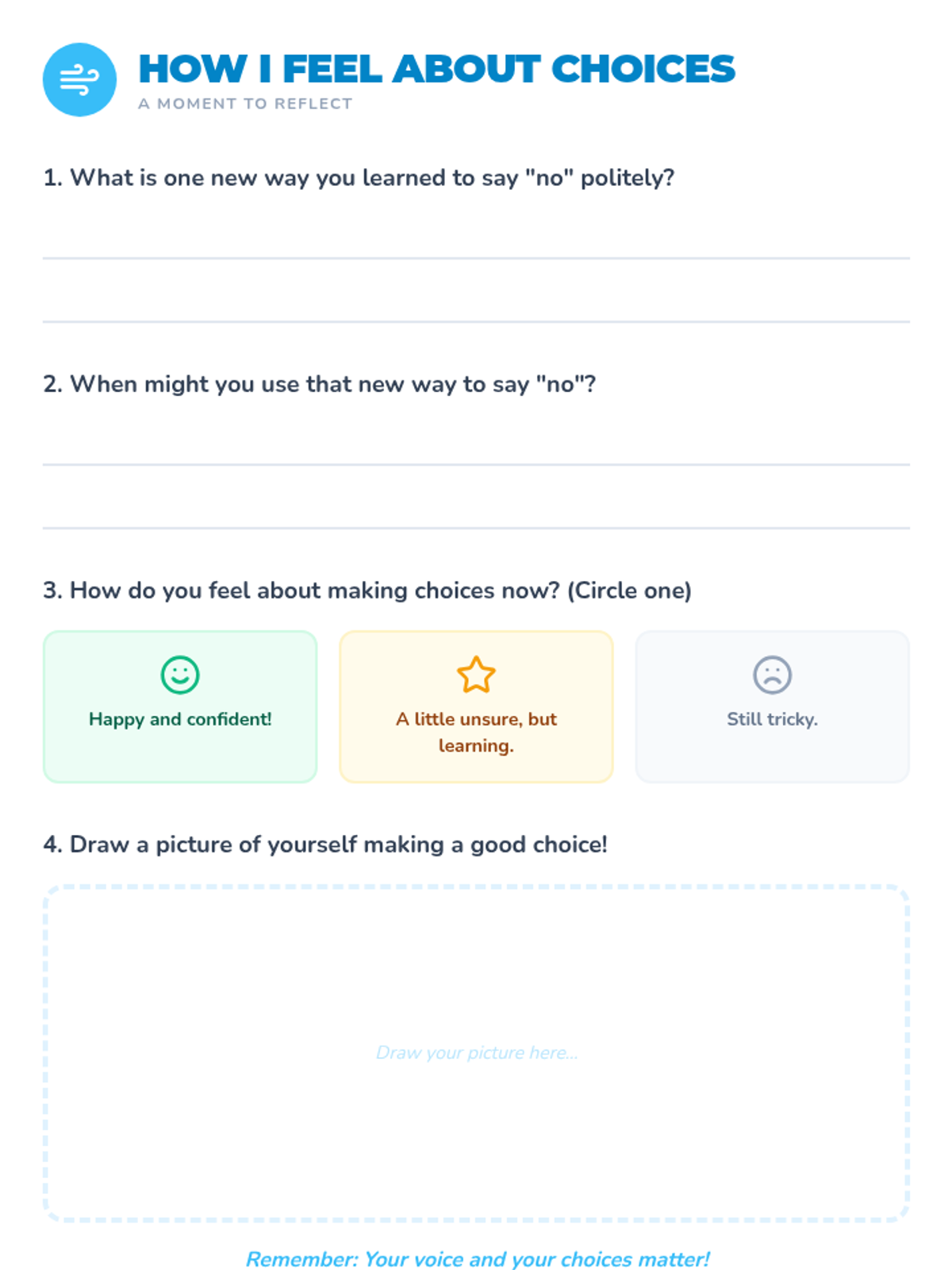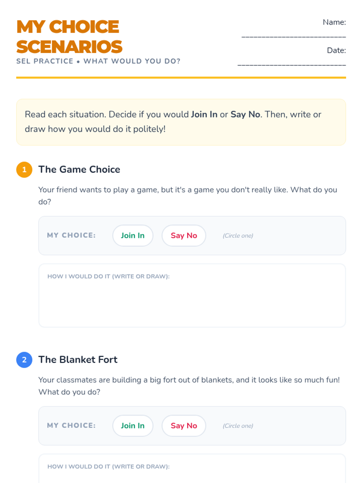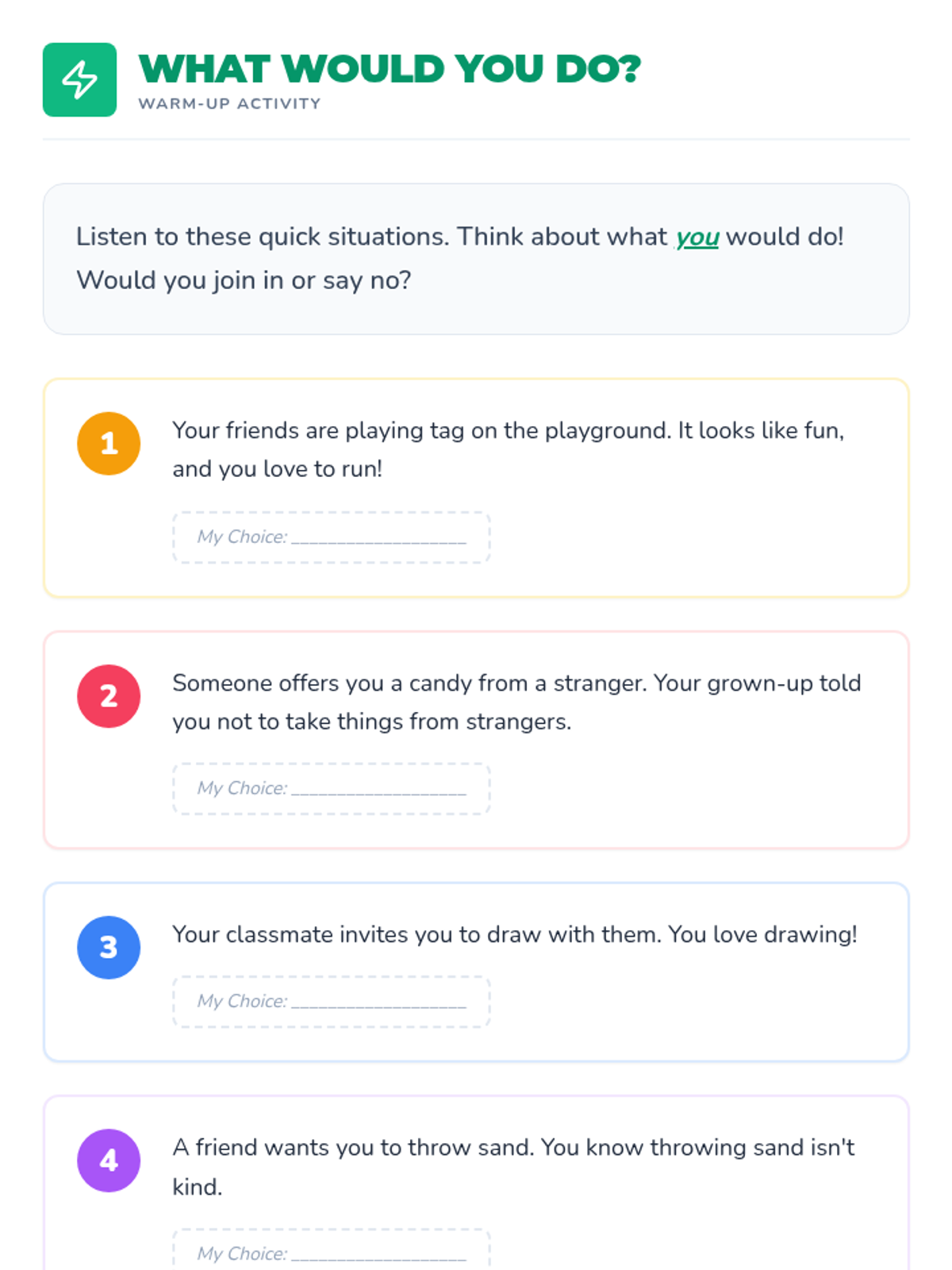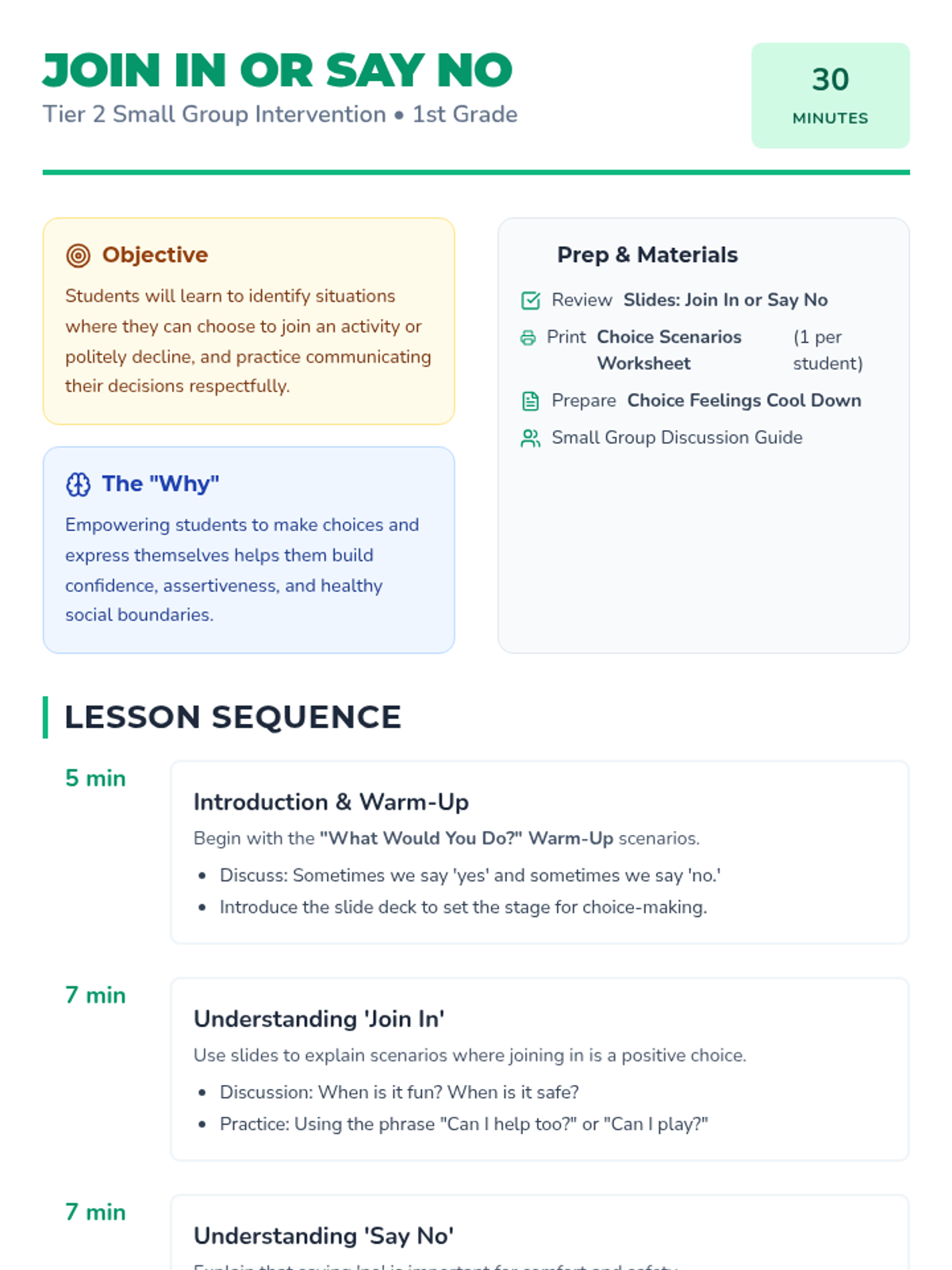 A 30-minute small-group SEL lesson for 1st graders focusing on social boundaries, assertive communication, and the power of choice when joining or declining activities.
