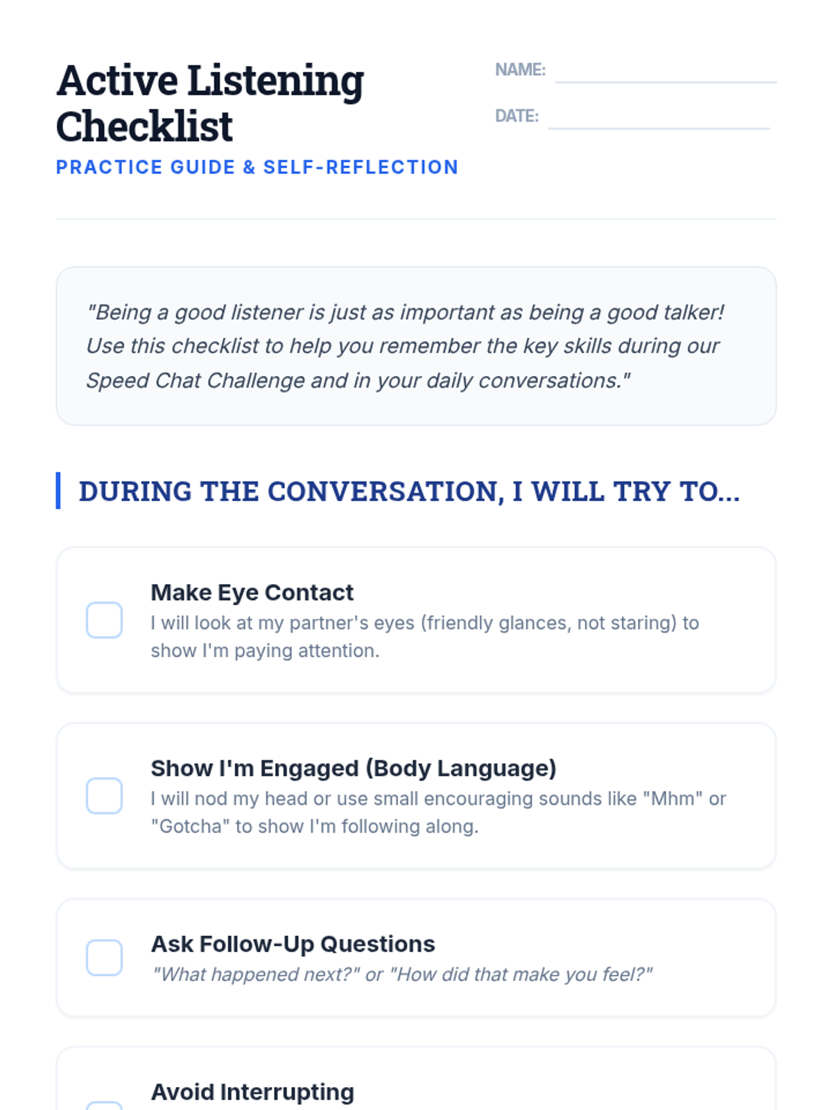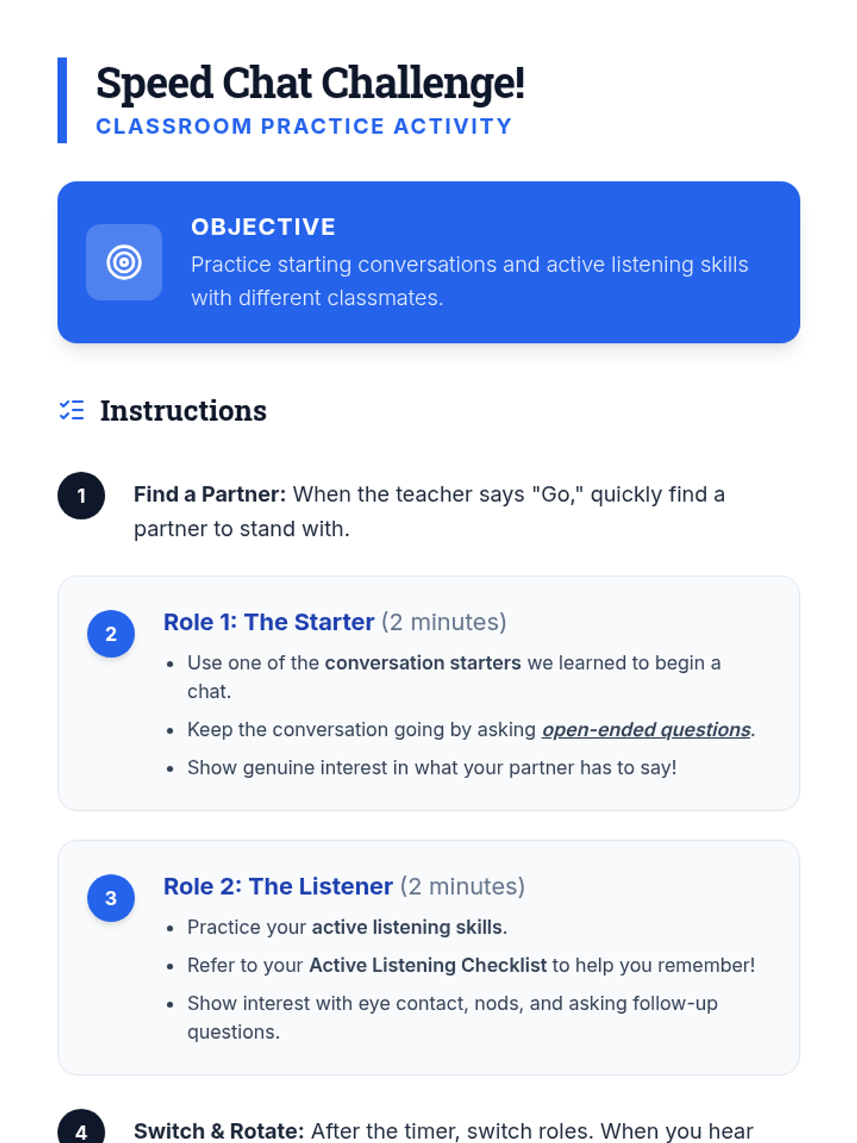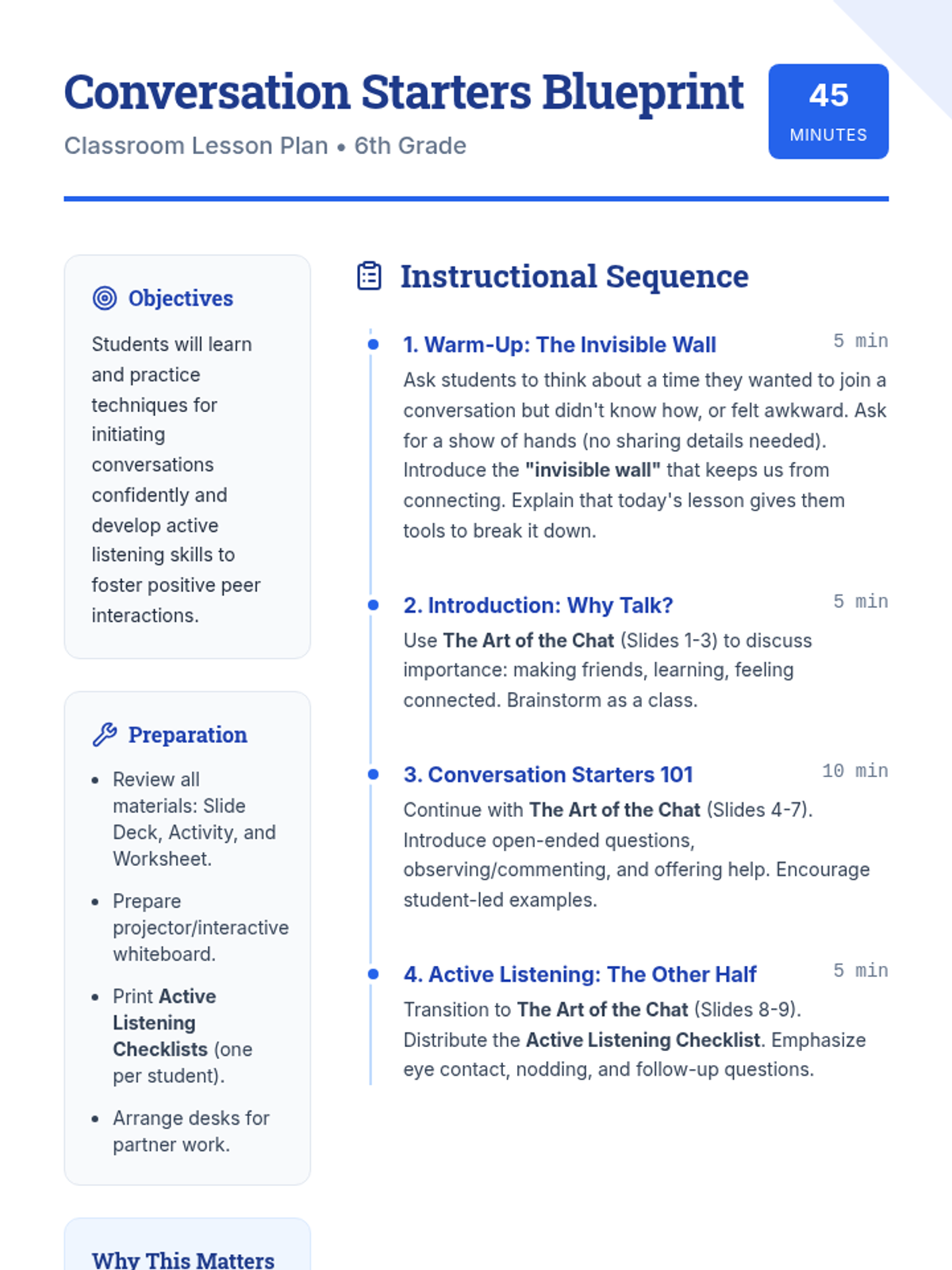 This lesson helps 6th-grade students develop confident conversation-starting techniques and active listening skills to foster belonging and improve peer interactions.