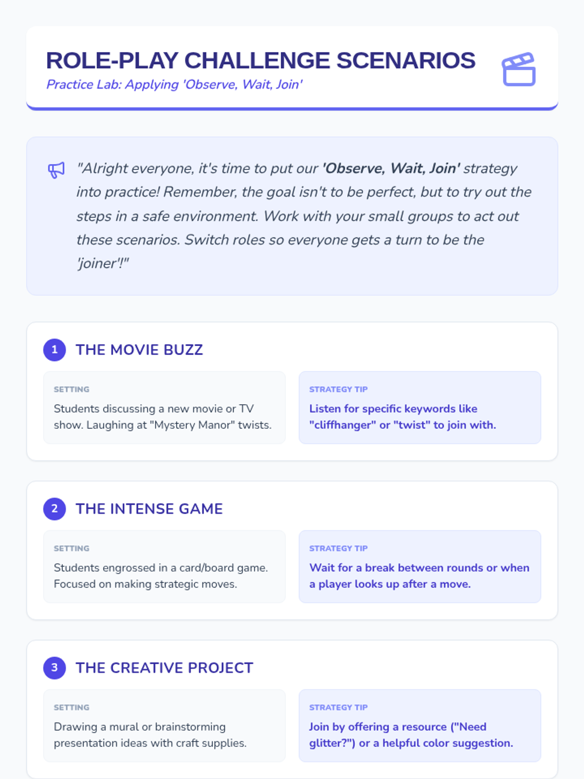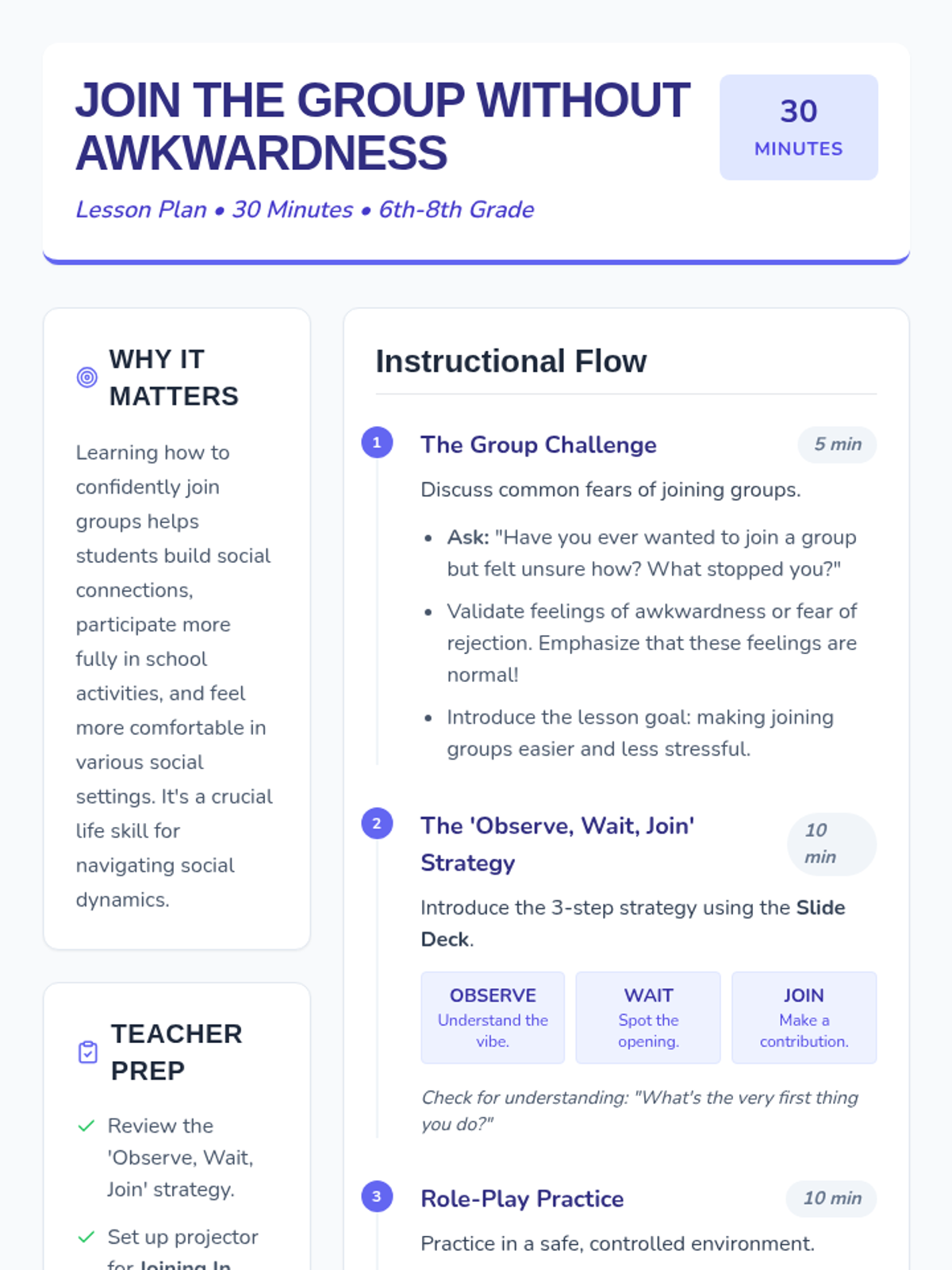 A 30-minute social skills lesson for middle schoolers focusing on the 'Observe, Wait, Join' strategy to confidently integrate into social groups.
