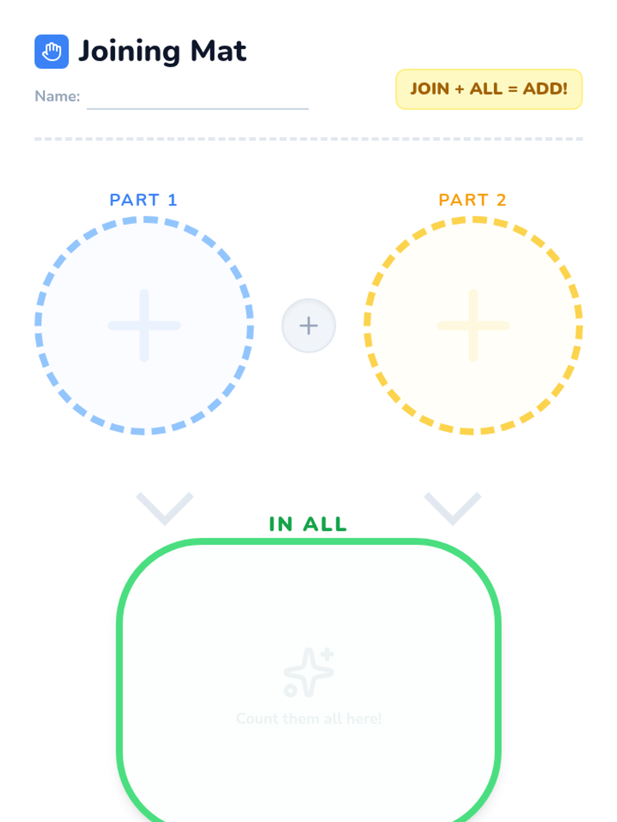 Students use counters to model addition stories from a video, focusing on the concepts of 'joining' and 'in all' through a concrete-pictorial-abstract approach.