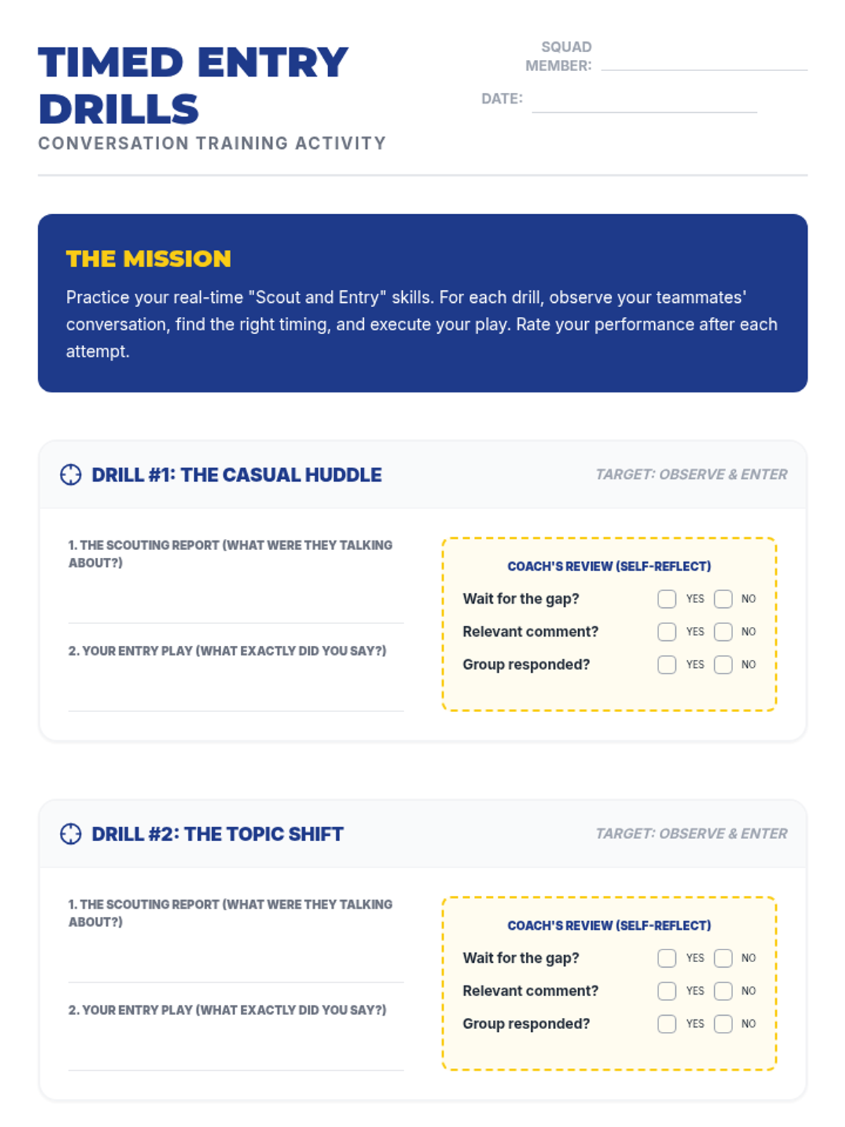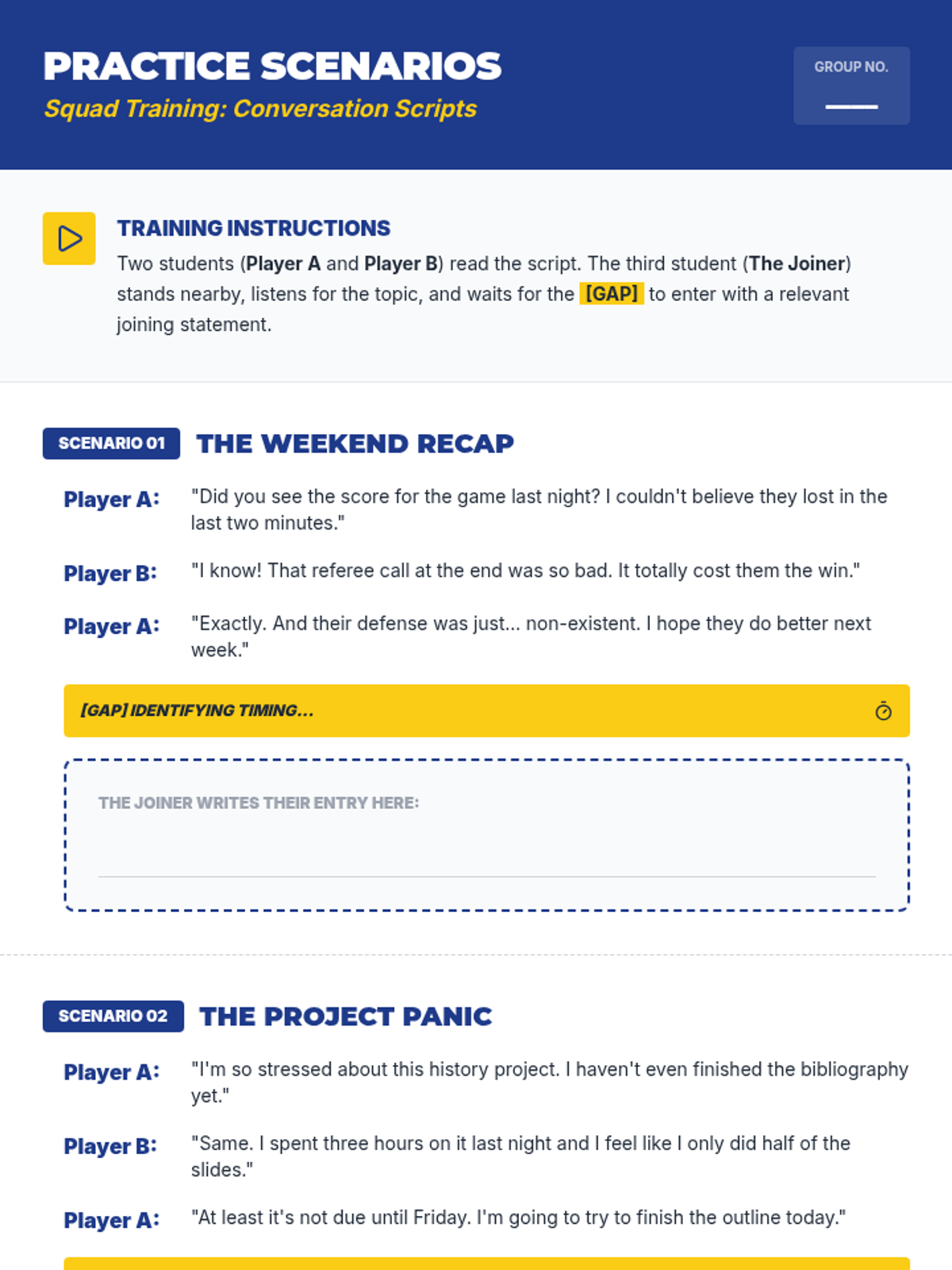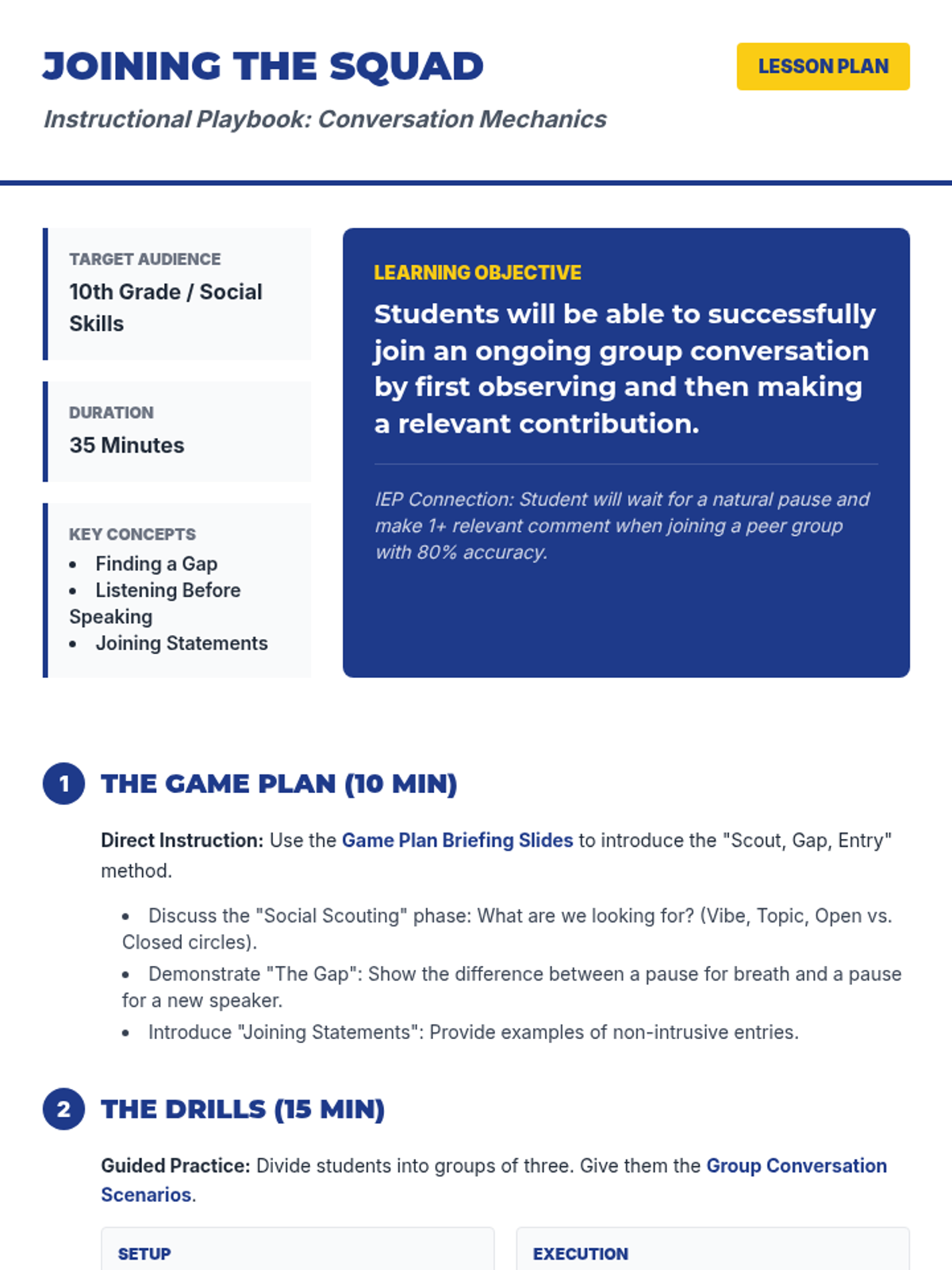 A social skills lesson for 10th graders focused on the mechanics of entering group conversations using a sports-inspired 'playbook' strategy. Students learn to observe, find timing gaps, and use effective joining statements.