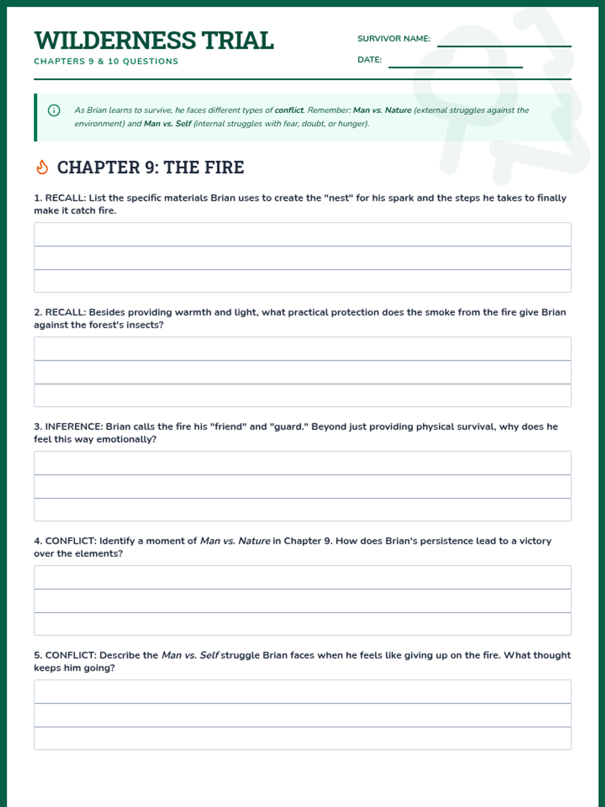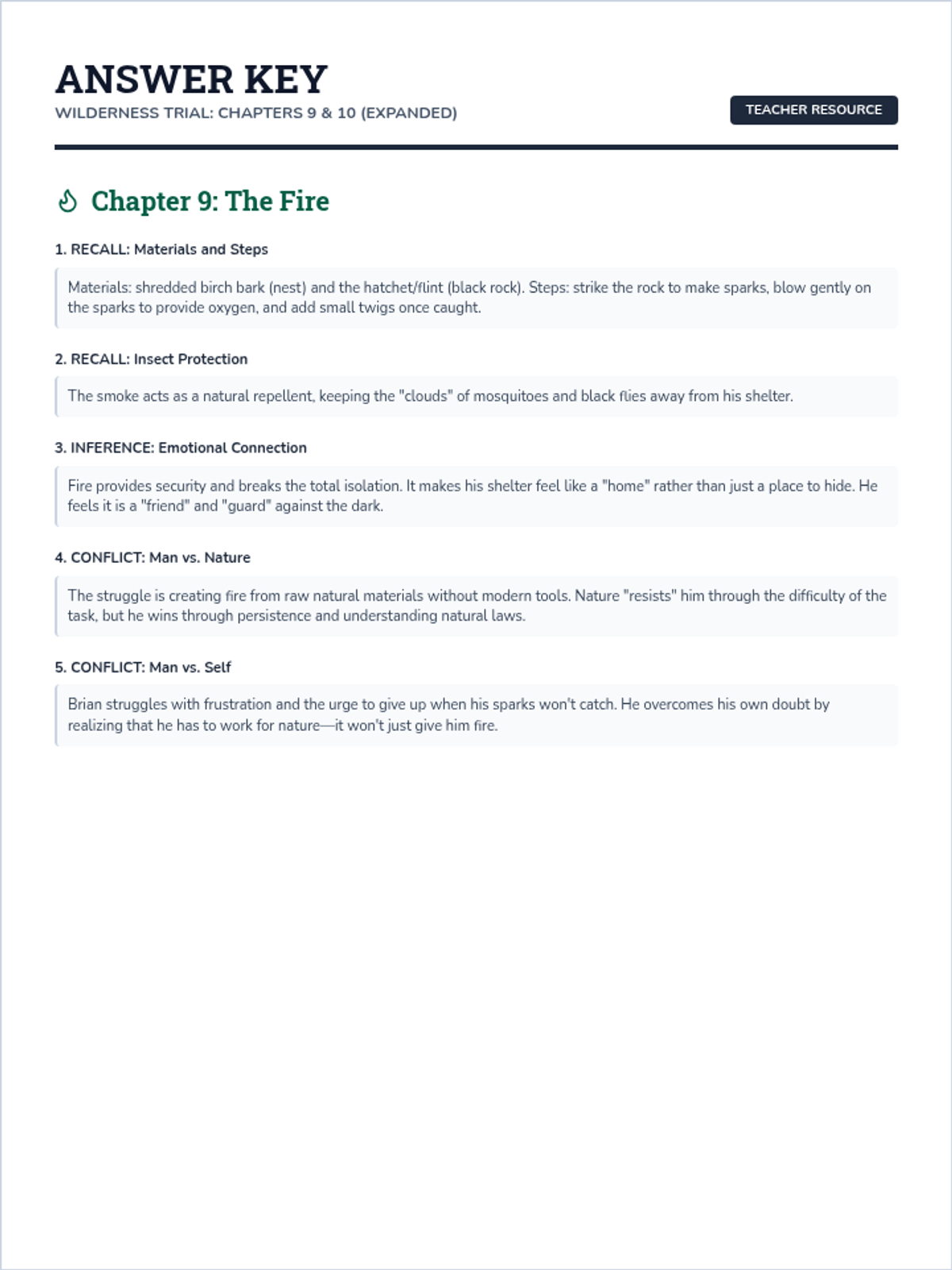 A focused study on Chapters 9 and 10 of Gary Paulsen's 'Hatchet,' focusing on Brian's discovery of fire and turtle eggs, emphasizing recall, inference, and types of literary conflict.