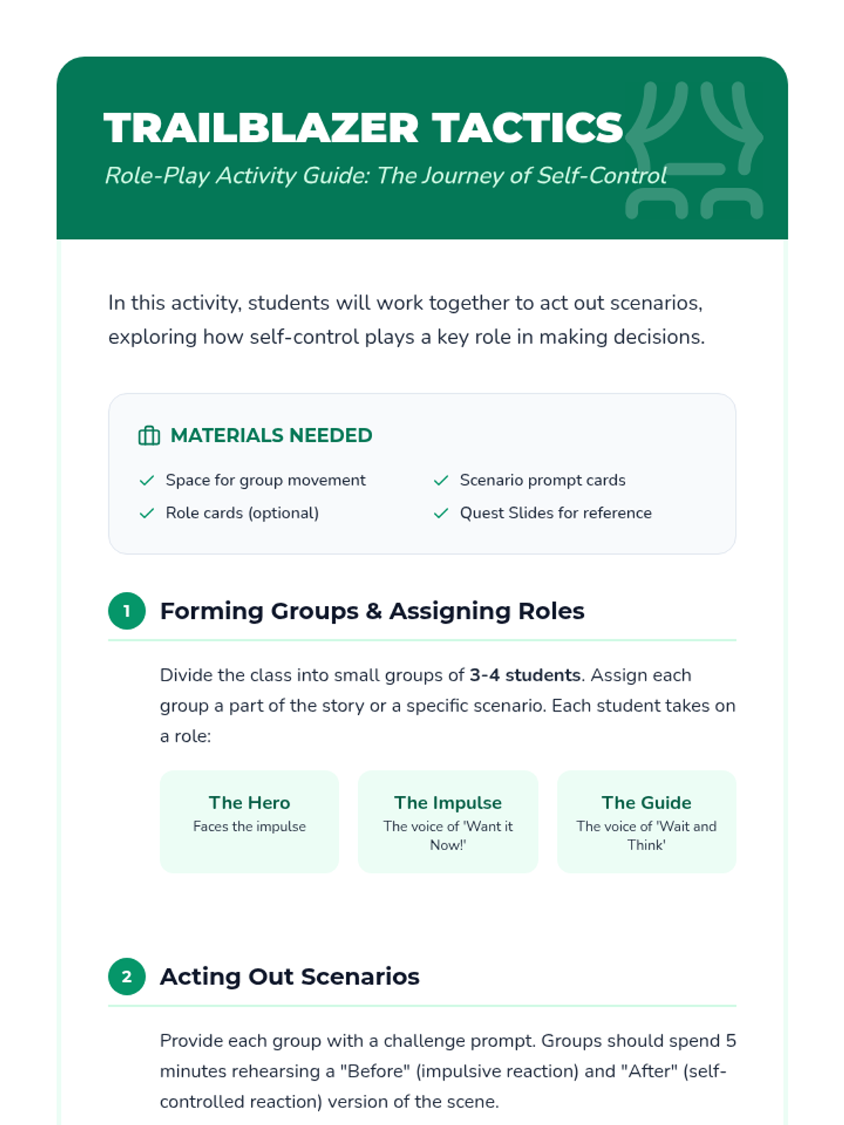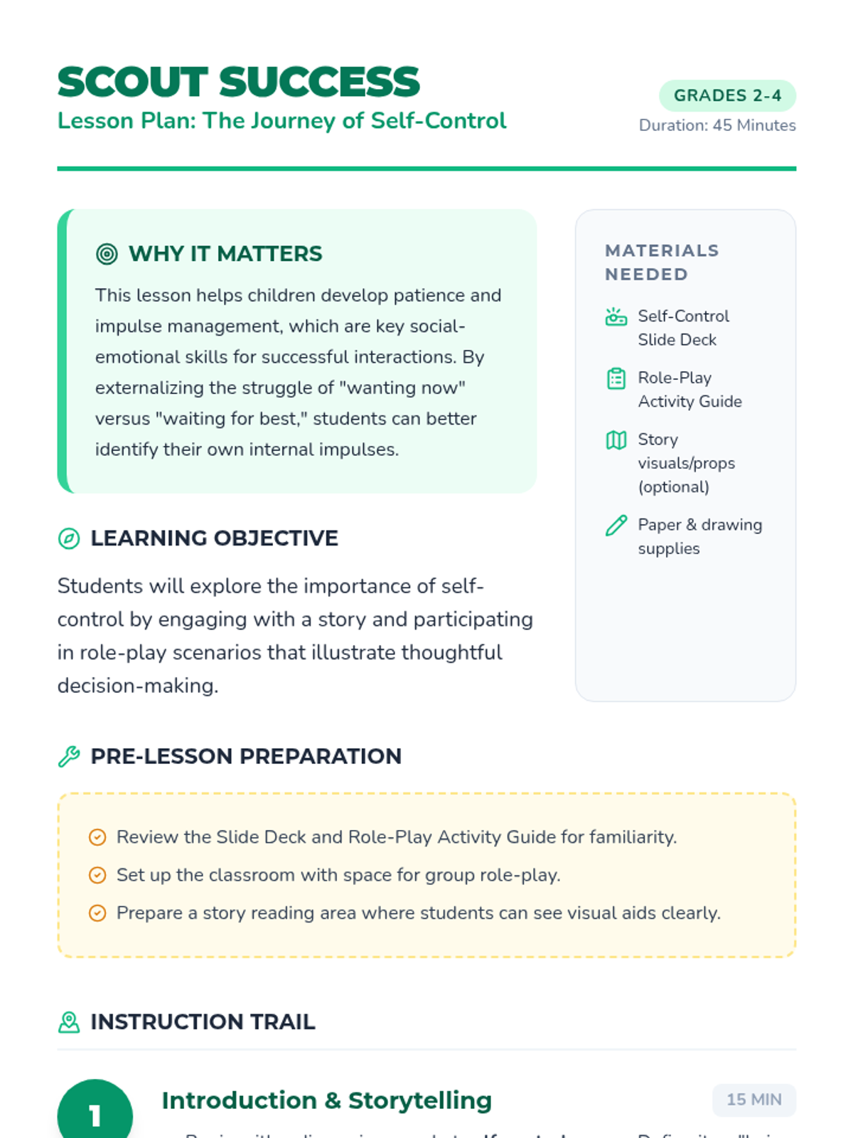 A social-emotional learning lesson for grades 2-4 that uses storytelling and role-play to teach patience and impulse management. Students follow a hero's journey and practice making thoughtful choices through interactive scenarios.